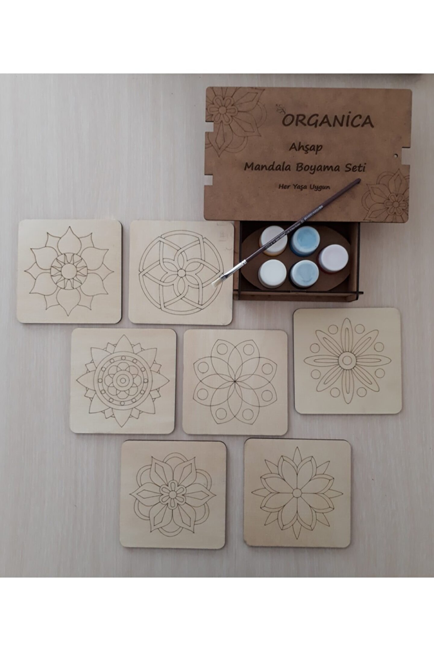Boyama seti içerisinde; 1 adet fırça 5 adet akrilik sağlığa zararsız su bazlı akrilik boya tüpü 7 adet üzerine figür işlenmis 13,5*13,5 ebatlarında ahşap kare parça bulunmaktadır Aynı zamanda kutu da ahşaptan olup sağlık açısından elverişli ve zararsız bir settir. Setimizden sipariş eden müşterilerimize kaligrafi sanatıyla isimlerinin yazılmış olduğu fon karton da hediye olarak gönderilmektedir. Bizi tercih ettiğiniz için teşekkür ederiz.