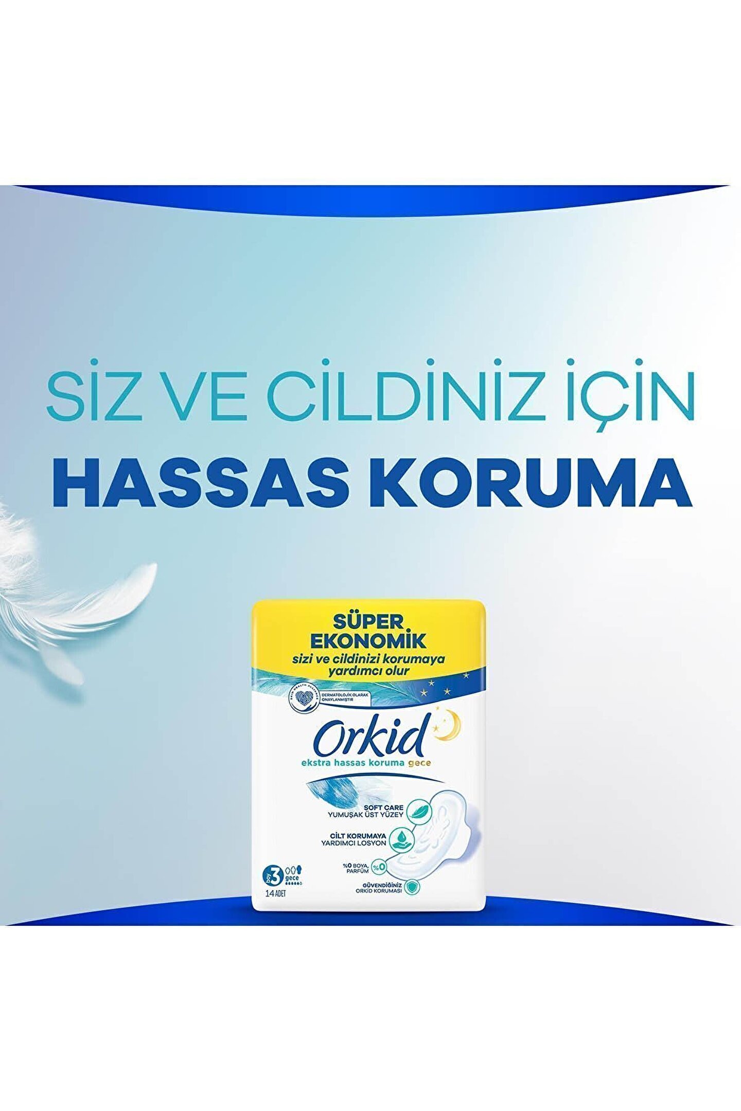 Orkid Ekstra Hassas Koruma pedler parfüm ve boya içermez, üstelik sevdiğiniz Orkid koruması ve rahatlığından ödün vermez. Orkid Ekstra Hassas Koruma farklıdır çünkü, güvenilir Orkid korumasını yumuşak üst yüzeyi ve cilt korumaya yardımcı losyonu ile birleştirerek siz ve cildiniz için ihtiyacınız olan hassas korumayı sağlar. Orkid Ekstra Hassas Koruma pedlerinde yer alan ultra yumuşak üst yüzey; selüloz ve emici jel tanecikleri içeren ultra esnek emici tabaka ve sıvı geçirmeyen dış yüzey ile; esneklik, yumuşaklık ve güvendiğiniz Orkid korumasını bir arada sunar. Orkid Ekstra Hassas Koruma pedlerin 3 boyutu mevcuttur. Orkid Ekstra Hassas Koruma Gece (Boy 3) yoğun akıntınız varsa gündüz ve gece kullanımları için tavsiye edilir.