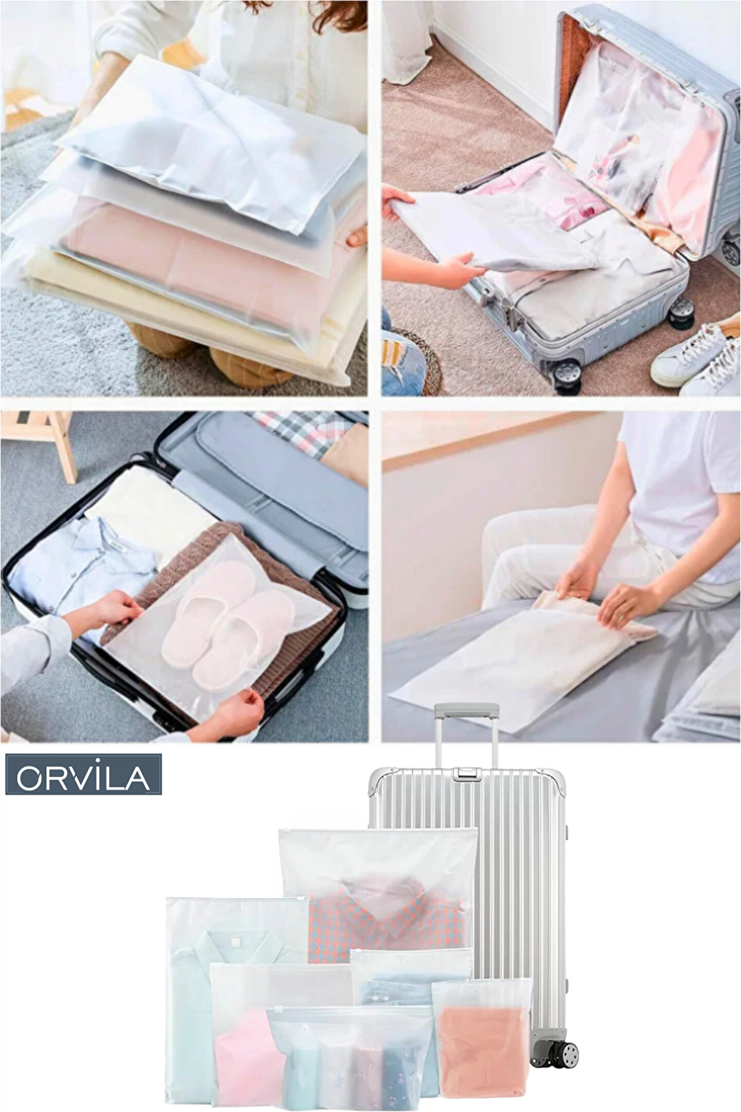 Kıyafet, aksesuar, belge veya kozmetik eşyalarınızı düzenli bir şekilde saklamanızı sağlayan buzlu görünümlü fermuarlı poşet torba; hem evde hem de seyahatlerde pratik bir kullanım sunar; 45x37 cm ölçüsüyle bavul içi düzenleyici, valiz içi torba, çanta içi düzenleyici veya kozmetik poşeti olarak kullanıma uygundur; şeffaf-buzlu dokusu sayesinde içindekiler kolayca görülebilir; tekrar kullanılabilir ve dayanıklı yapısı sayesinde uzun ömürlü kullanım sağlar; suya, toza ve kirlenmeye karşı koruma özelliği ile eşyalarınızı güvenle muhafaza eder; kompakt boyutu sayesinde seyahatlerde az yer kaplar; valiz düzenini korur ve eşyalarınızın karışmasını önler; giyim ürünlerinden elektronik aksesuarlara kadar birçok farklı eşyayı düzenli bir şekilde saklamanıza yardımcı olur; estetik görünümüyle ev içi kullanımda da şık bir saklama çözümüdür.