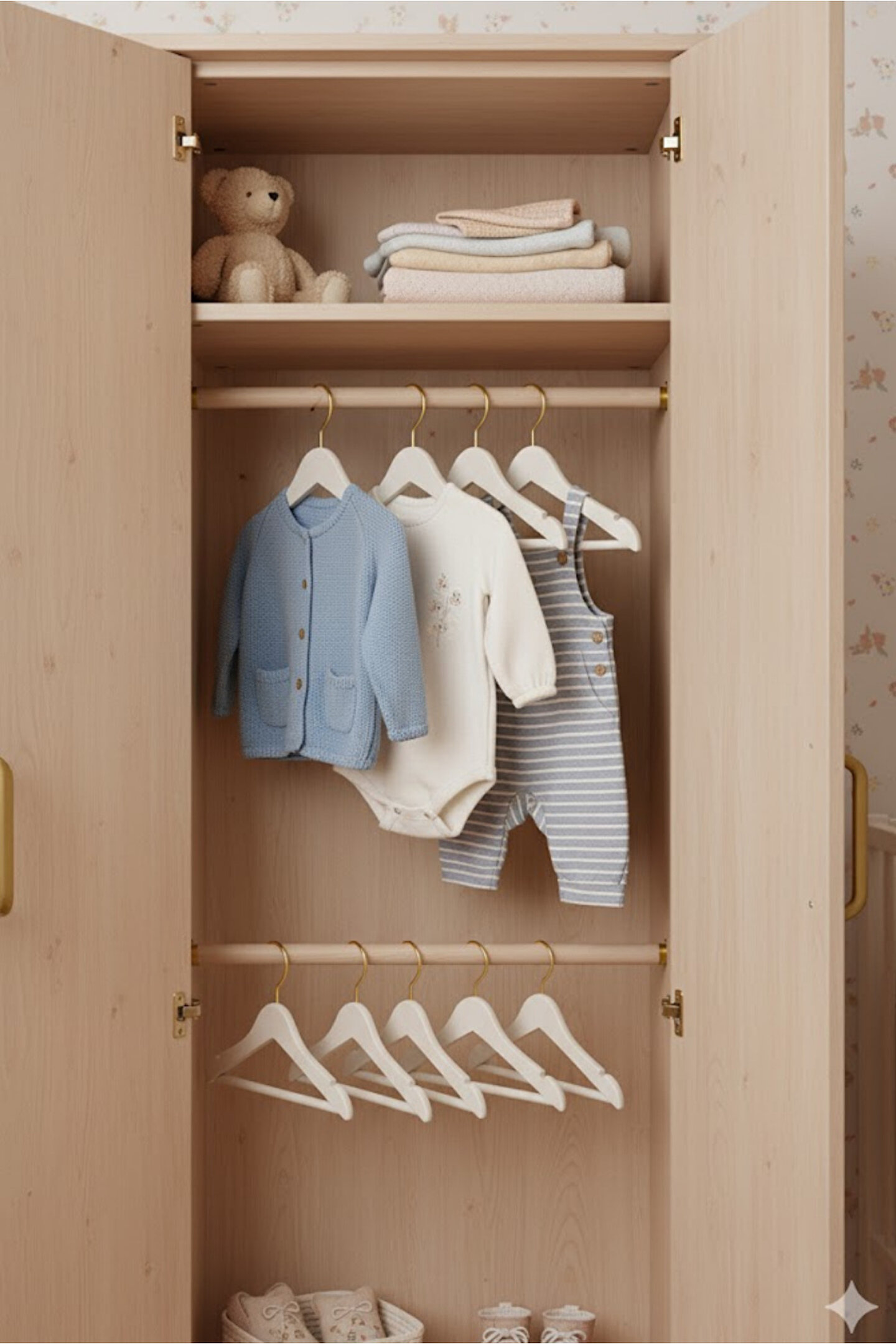 Bebeğinizin en değerli kıyafetlerini düzenli ve şık bir şekilde saklayın! Bu özel tasarım bebek askıları, dolabınıza hem düzen hem de estetik katmak için idealdir.; Küçük giysilerin formunu korurken, dolabınızın içini lüks bir görünüme kavuşturur.; Özel Boyut : Bebek ve yeni doğan kıyafetleri (tulumlar, hırkalar, bodyler vb.; ) için özel olarak tasarlanmış küçük boyut.; Kıyafetlerin omuz kısmının sarkmasını ve deforme olmasını önler.; ; Lüks Kanca Detayı : Askıların dönebilir metal kanca kısımları, altın (gold) rengindedir.; Bu detay, askılara daha premium bir görünüm kazandırır ve her türlü dolap dekorasyonuyla uyum sağlar.; ; Çok Amaçlı Kullanım : Sadece dolap içinde değil, aynı zamanda fotoğraf çekimleri veya bebek odası dekorasyonunda kıyafetleri sergilemek için de mükemmeldir.; ; Genişlik : 30 cm ; Kanca Yüksekliği : 7 cm ; Bebeğinizin dolabına düzen ve zarafet katmak için hemen sipariş verin!