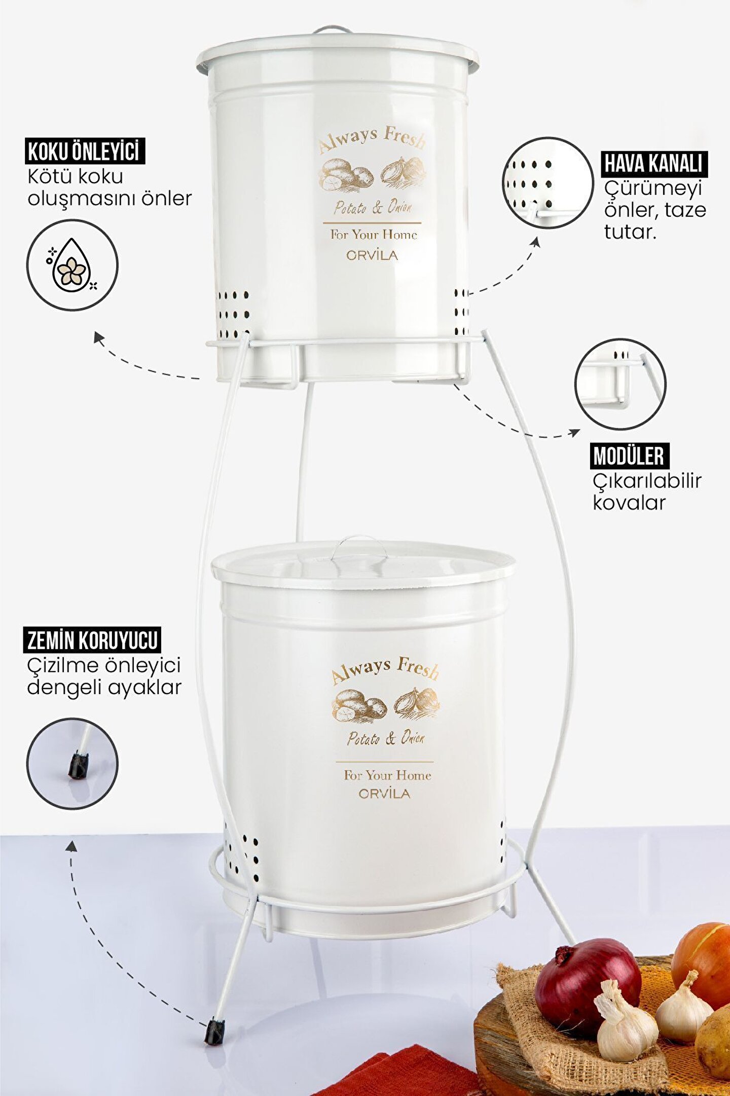 Ürün Total Yerden Yüksekliği: 67Cm ; ; Ürün Total Genişliği: 30 Cm ; ; Büyük Kova Yükseklik : 25 Cm ; ; Büyük Kova Çapı: 21 Cm ; ; Küçük Kova Yükseklik: 21 Cm ; ; Küçük Kova Çapı: 19 Cm ; ; Stand Yükseliği : 46 Cm ; ; Ürünümüz Ebat ve Estetiklik bakımından Balkonunuzda ya da Mutfağınızda rahatlıkla kullanabileceğiniz dekoratif şekilde tasarlanmıştır. ; ; Toplam 6-8 Kg hacime sahip. ; ; Her Bir Kovasında 3-4 Kg Sebze taşıyabilir. ; ; İki Katlı Metal Patates Soğan Saklama Kabı ve Kovası ; ; Galvaniz Metalden üretilmiştir. ; ; Lak boya ile renklendirilmiştir. ; ; Yer Kaplamaması İçin Üst üste Dizayn edilmiştir. ; ; Patates Soğan Sepeti ; ; 2 Katlı Sebzelik Beyaz Renk ; ; İki Katlı Patates Soğan Kutusu ; ; Patateslik ve Soğanlık Saklama Kutusu ; ; İade Koşulları: Ürünlerinizin tarafınıza ulaştığı şekilde patpata sarılı, kutulu ve ambalajı bozulmamış olarak iade edilmesi gerekmektedir. Aksi halde gönderilen iadeler kabul edilemeyecektir. ; ;