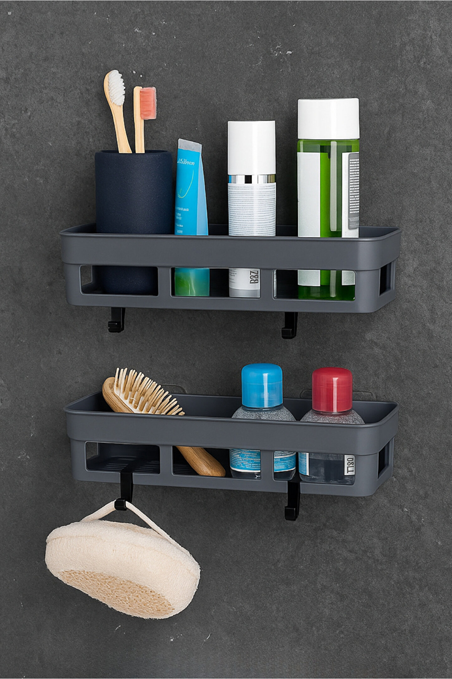 Bu şık ve kullanışlı plastik yapışkanlı duvar rafı, hem banyo hem mutfak kullanımına uygun pratik bir depolama çözümüdür.; Delme gerektirmeyen güçlü yapışkan sistemi sayesinde duvarınıza zarar vermeden kolayca monte edilir.; Suya ve neme dayanıklı sağlam plastik malzemesiyle uzun ömürlü kullanım sağlar.; Geniş iç hacmiyle şampuan, duş jeli, diş fırçası, losyon veya mutfakta baharat şişeleri, temizlik malzemeleri gibi birçok ürünü düzenli şekilde tutar.; Alt kısmındaki askı kancaları, el bezi, sünger veya banyo lifi gibi eşyaları asmak için idealdir.;