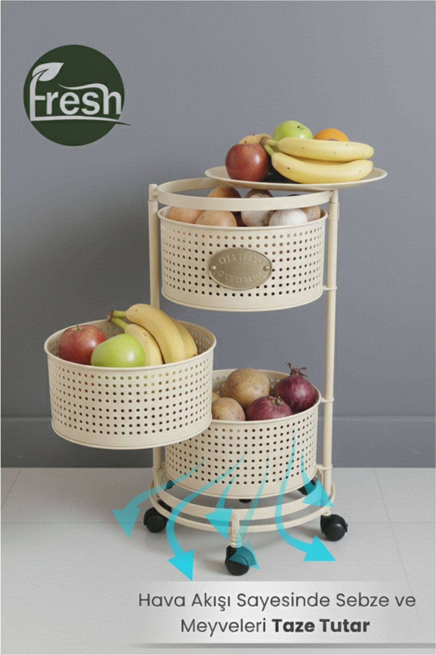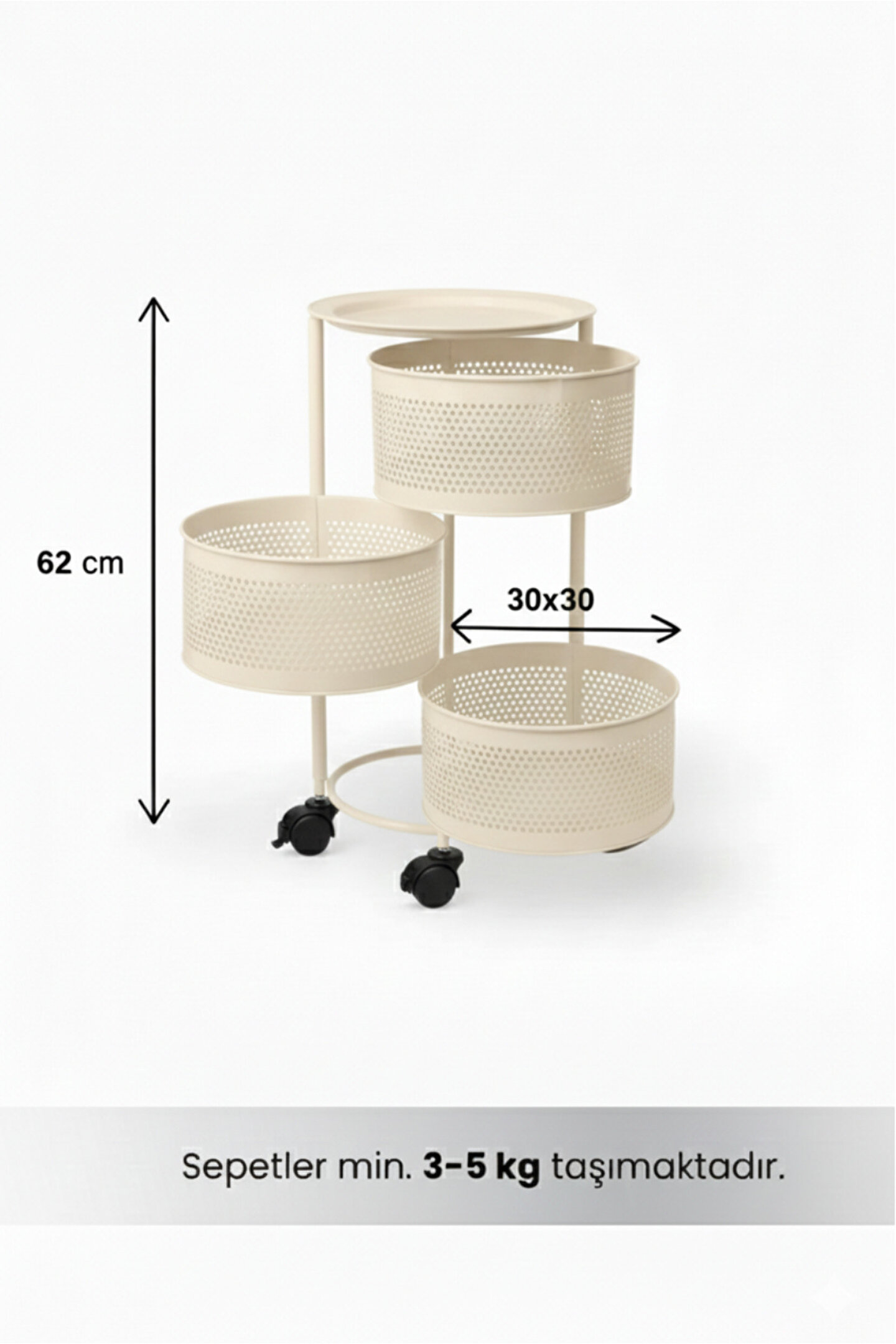 Orvila 3 Katlı Tekerlekli Tepsili Metal Sebzelik Açılır Patates Soğan Meyvelik Sepeti Raf KREM