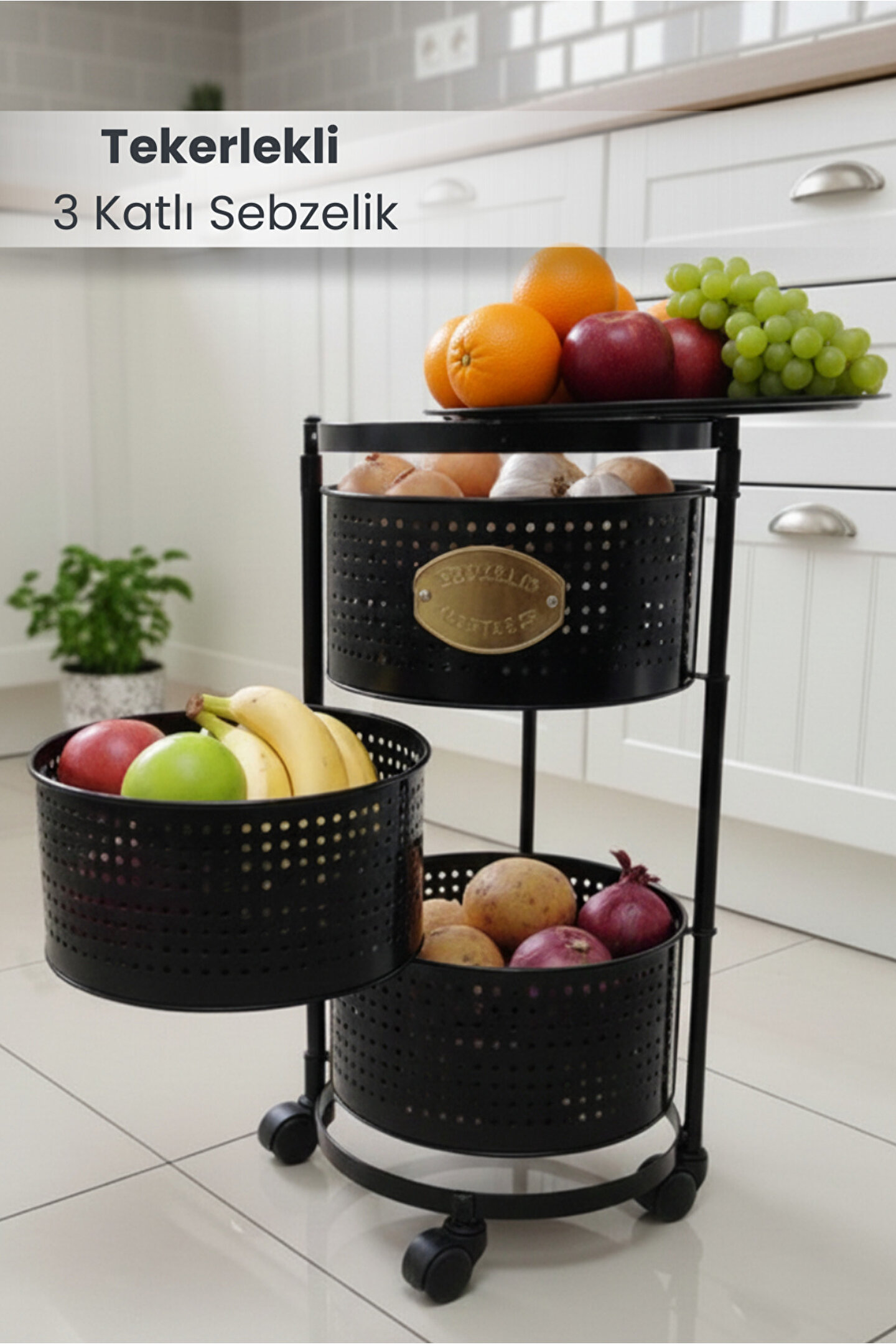 Tekerlekli sebzelik ve meyvelik ile mutfak, balkon ve kiler alanlarınızda maksimum düzen ve depolama alanı sağlar; Dayanıklı metal gövdesi sayesinde uzun ömürlü ve sağlam kullanım sunar; Delikli sepet tasarımı hava sirkülasyonunu artırarak sebze ve meyvelerin daha uzun süre taze kalmasına yardımcı olur; geniş raf yapısı ile patates, soğan, meyve, sebze ve mutfak ürünlerini düzenli şekilde saklamanızı sağlar; 360 derece dönebilen kilitlenebilir tekerlekleri sayesinde kolay taşınır ve sabitlenebilir kullanım imkânı sunar; Minimal ve modern beyaz rengi ile her mutfak dekorasyonuna uyum sağlar; Sepetler kolayca çıkarılıp temizlenebilir yapıdadır, hijyenik kullanım sunar; Mutfak tezgâhı altı, kiler, balkon ve servis alanlarında çok amaçlı kullanım için uygundur; Kurulum gerektirmeyen pratik tasarımı sayesinde hızlıca kullanıma hazır hale gelir; Yer kaplamayan dikey tasarımı ile dar alanlar için ideal bir depolama çözümüdür.;