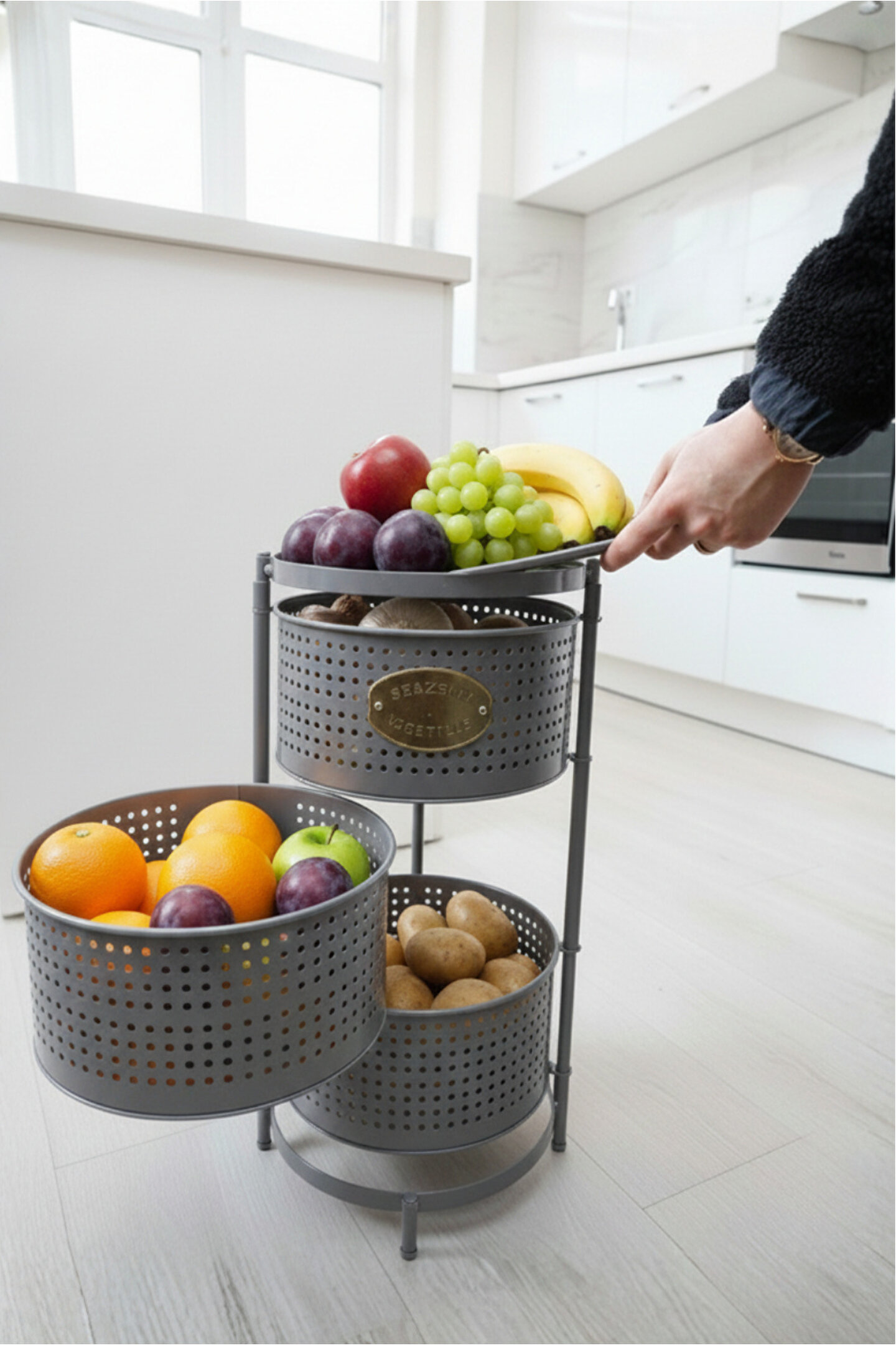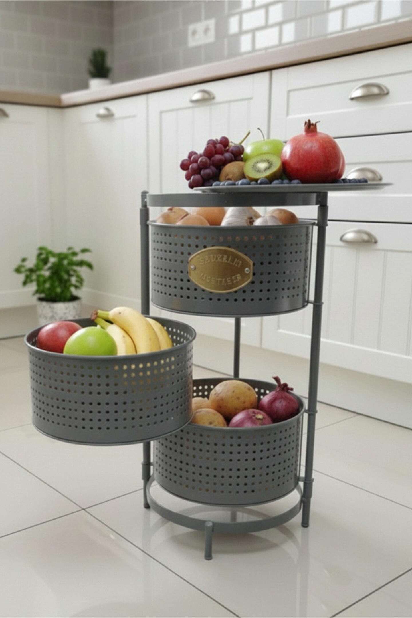 Orvila 3 Katlı Tepsili Metal Sebzelik Açılır Metal Patates Soğan Meyvelik Sepeti Rafı Antrasit Gri