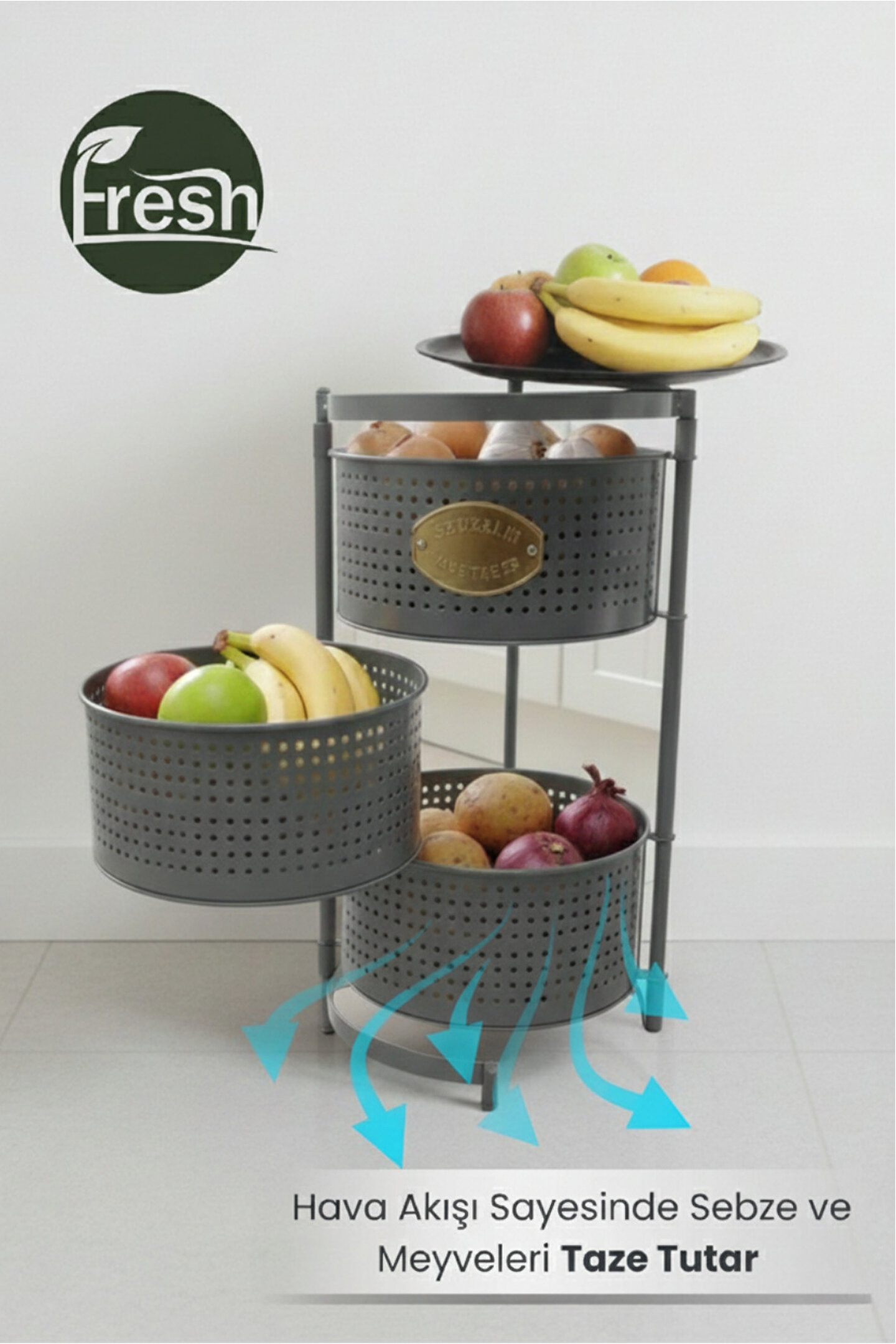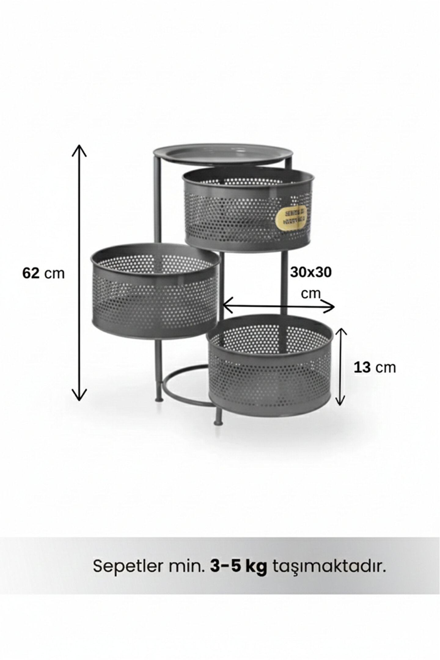 Ölçüler: Sepetler : 30x30 Cm; Sepet Yüksekliği : 13 cm ; Toplam Yükseklik : Yükseklik : 62 cm; Mutfak tezgâhında ya da evinizin başka alanlarında ekstra depolama alanına ihtiyaç duyanlar.; Sebze ve meyvelerini düzenli şekilde saklamak isteyenler.; Evleri küçük olan, alanı verimli kullanmak isteyenler.; Kolayca hareket ettirip gerektiğinde sabitlemek isteyen kullanıcılar.;