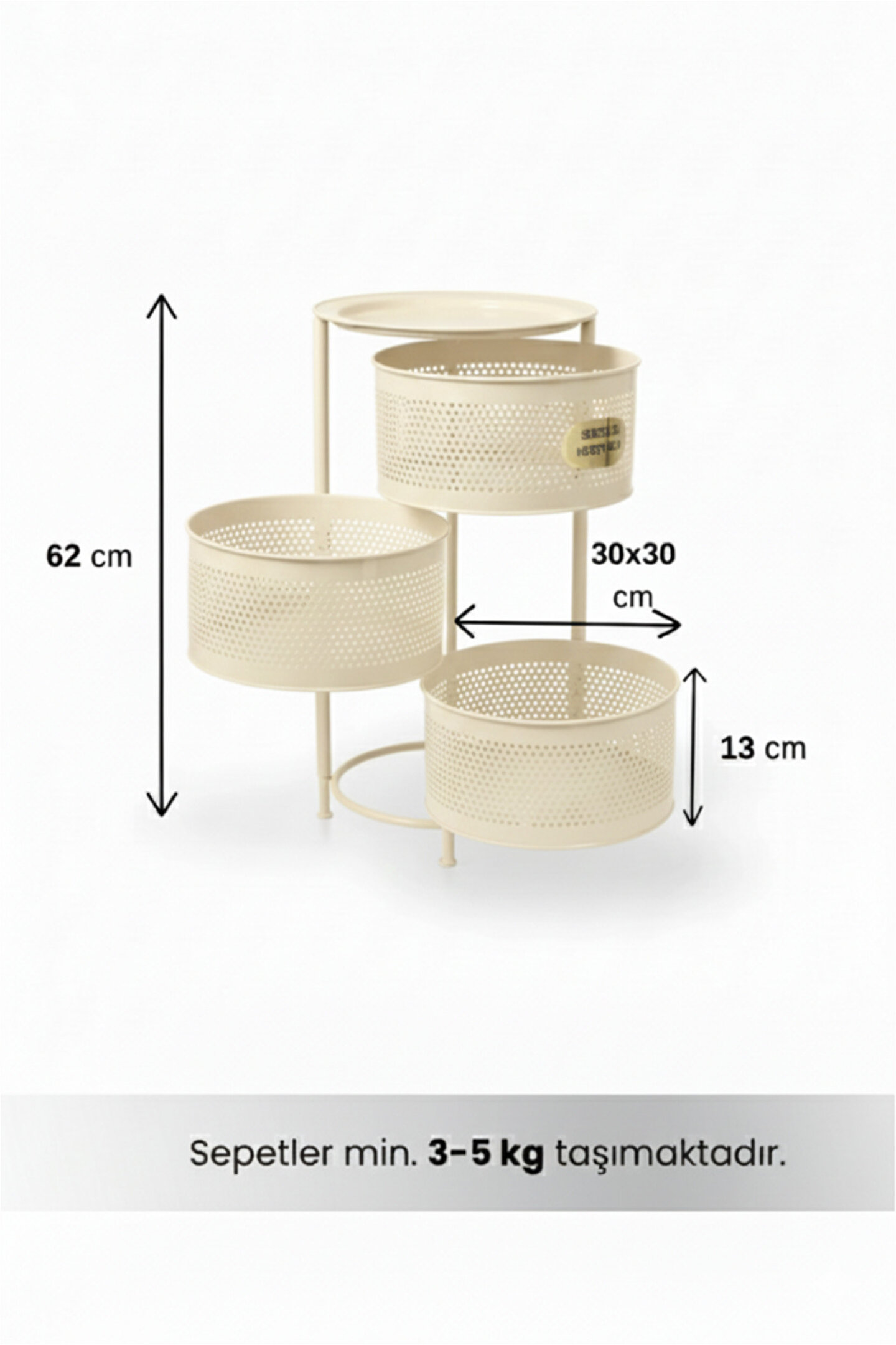 Ölçüler: Sepetler : 30x30 Cm; Sepet Yüksekliği : 13 cm ; Toplam Yükseklik : Yükseklik : 62 cm; Mutfak tezgâhında ya da evinizin başka alanlarında ekstra depolama alanına ihtiyaç duyanlar.; Sebze ve meyvelerini düzenli şekilde saklamak isteyenler.; Evleri küçük olan, alanı verimli kullanmak isteyenler.; Kolayca hareket ettirip gerektiğinde sabitlemek isteyen kullanıcılar.;