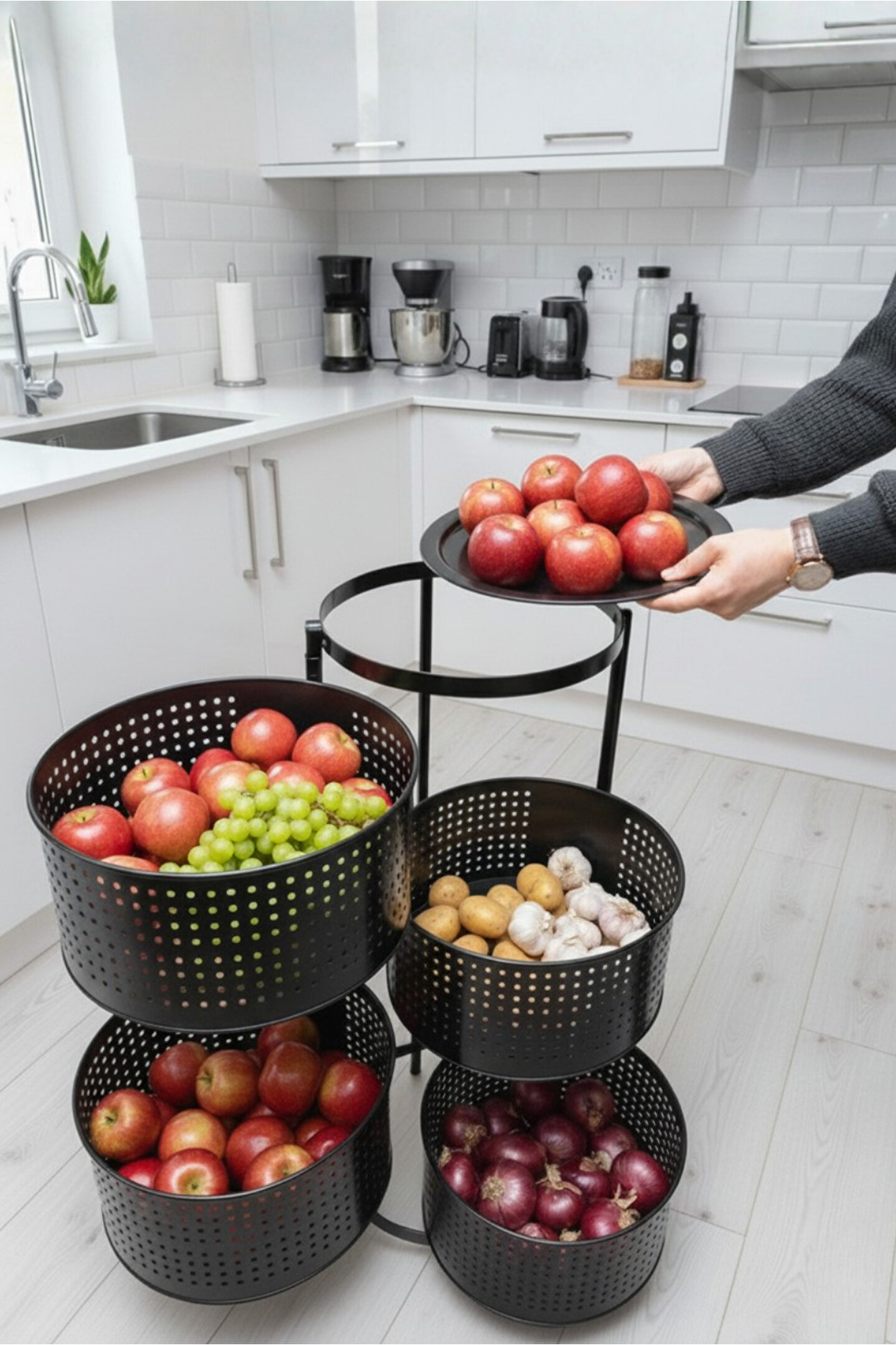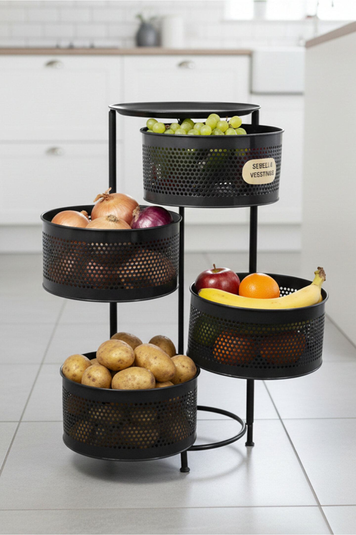 Ölçüler: Sepetler : 30x30 Cm; Sepet Yüksekliği : 13 cm ; Toplam Yükseklik : Yükseklik : 81 cm; Her bir katı min 3 kg taşımaktadır.; Mutfak tezgâhında ya da evinizin başka alanlarında ekstra depolama alanına ihtiyaç duyanlar.; Sebze ve meyvelerini düzenli şekilde saklamak isteyenler.; Evleri küçük olan, alanı verimli kullanmak isteyenler.; Kolayca hareket ettirip gerektiğinde sabitlemek isteyen kullanıcılar.;