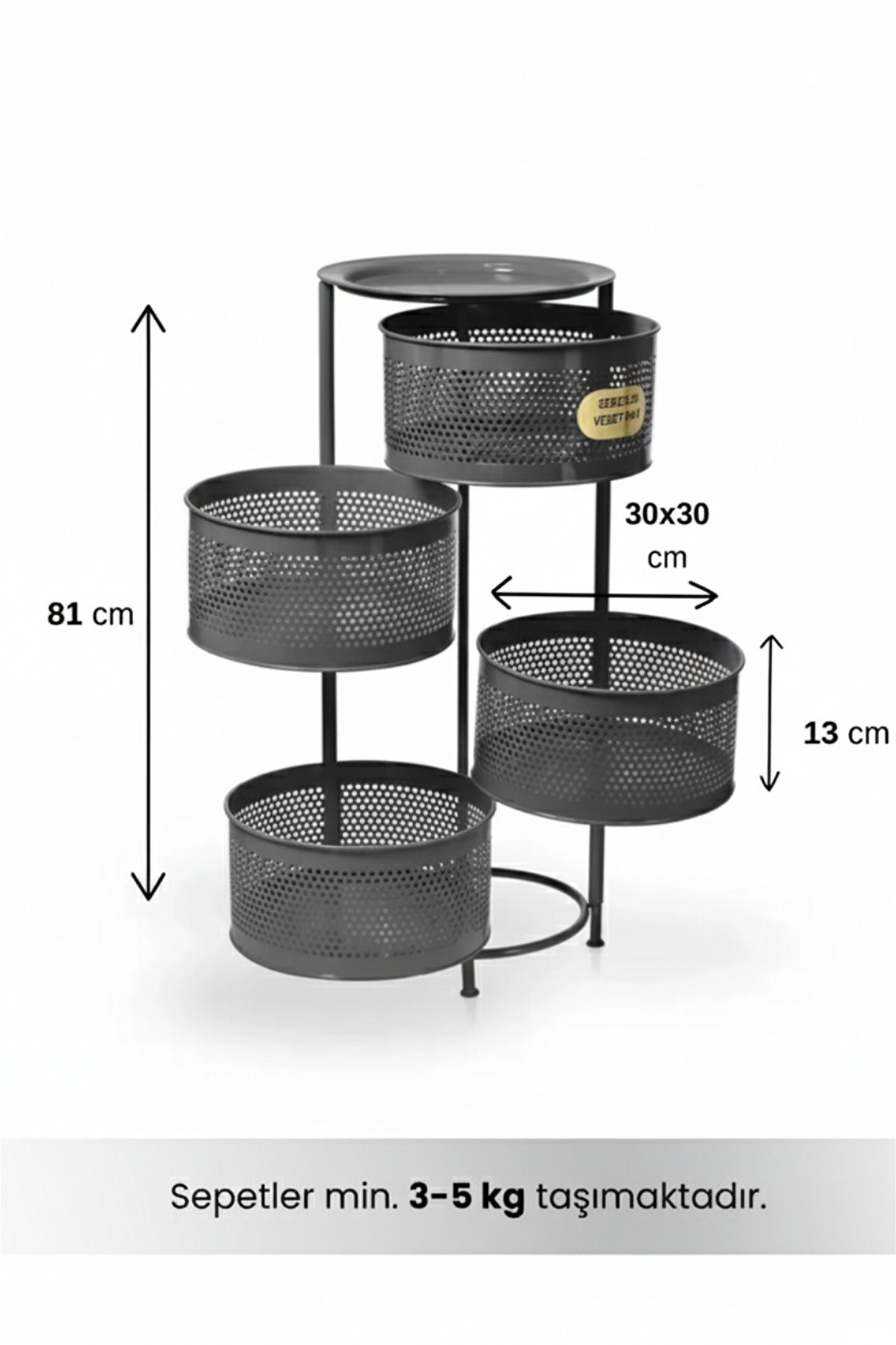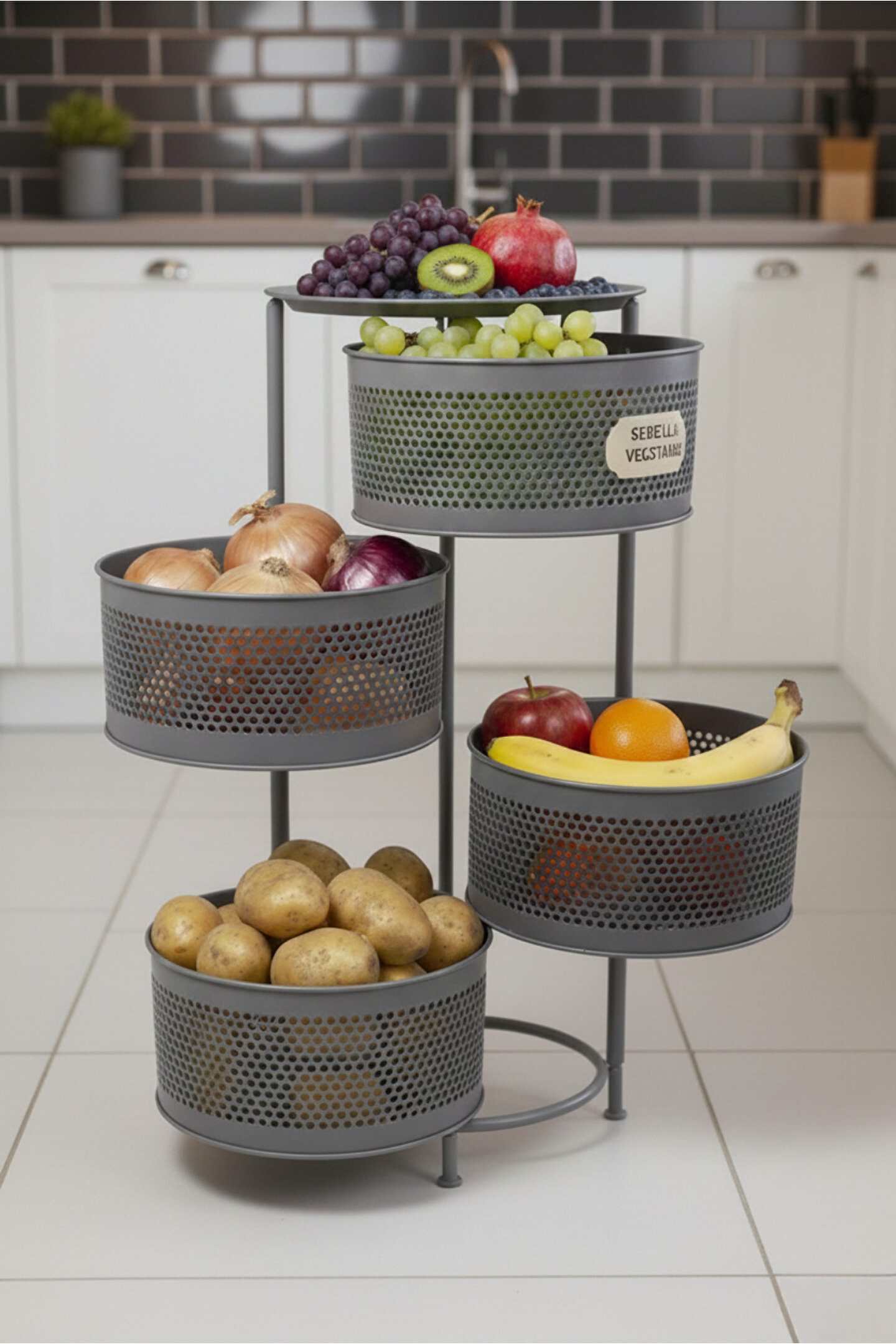 Ölçüler: Sepetler : 30x30 Cm; Sepet Yüksekliği : 13 cm ; Toplam Yükseklik : Yükseklik : 81 cm; Her bir katı min 3 kg taşımaktadır.; Mutfak tezgâhında ya da evinizin başka alanlarında ekstra depolama alanına ihtiyaç duyanlar.; Sebze ve meyvelerini düzenli şekilde saklamak isteyenler.; Evleri küçük olan, alanı verimli kullanmak isteyenler.; Kolayca hareket ettirip gerektiğinde sabitlemek isteyen kullanıcılar.;