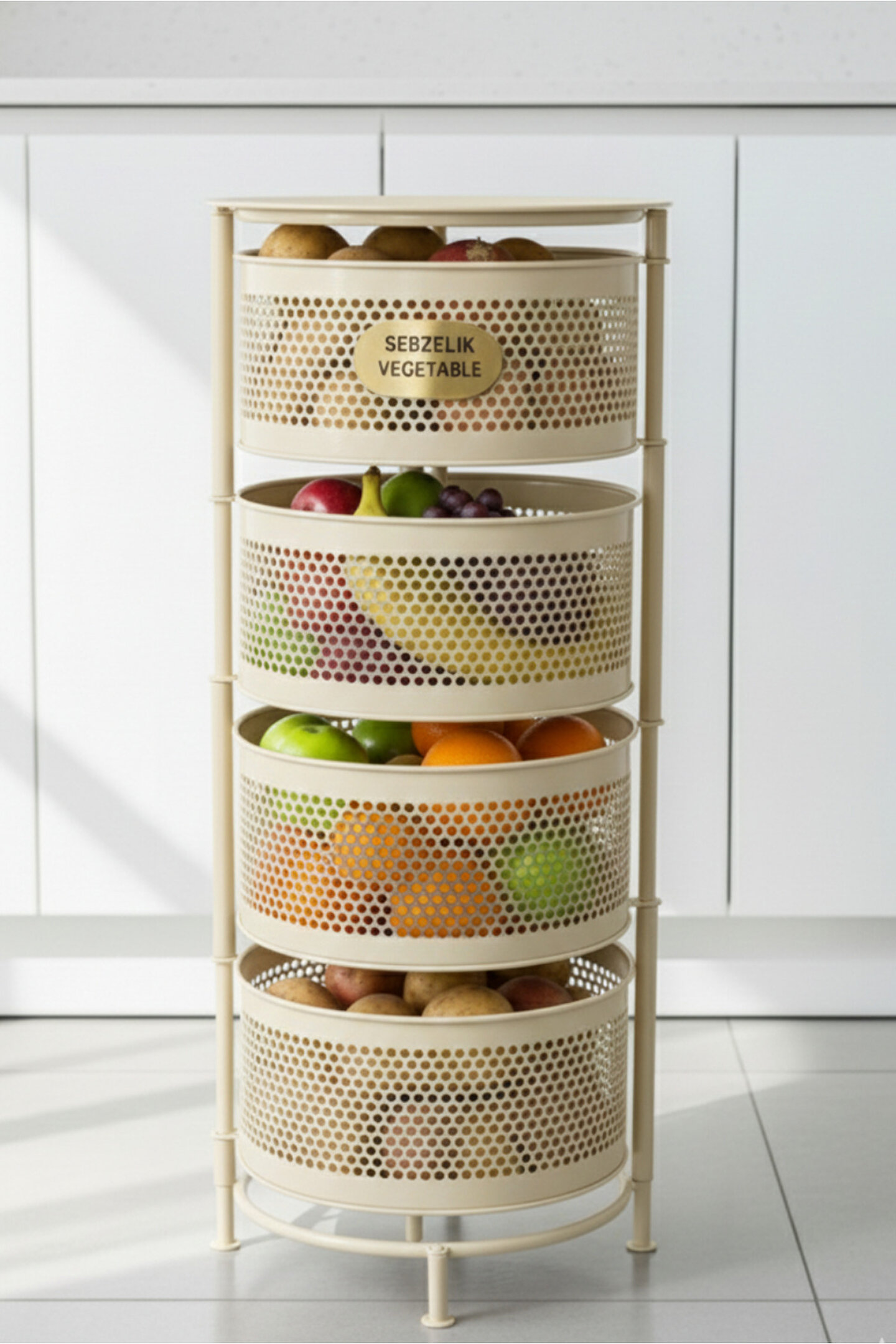 Orvila 4 Katlı Tepsili Metal Sebzelik Açılır Metal Patates Soğan Meyvelik Sepeti Rafı Krem