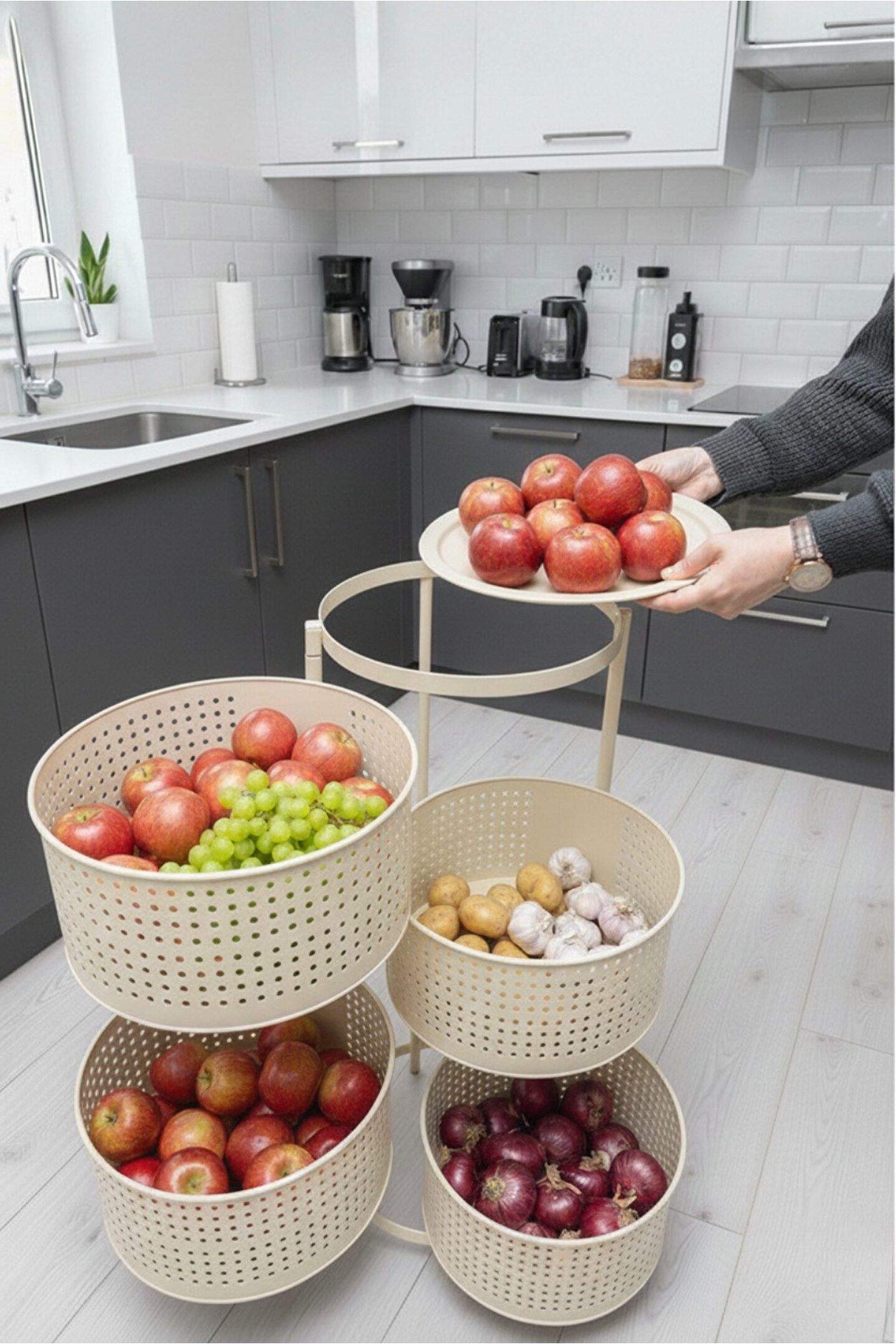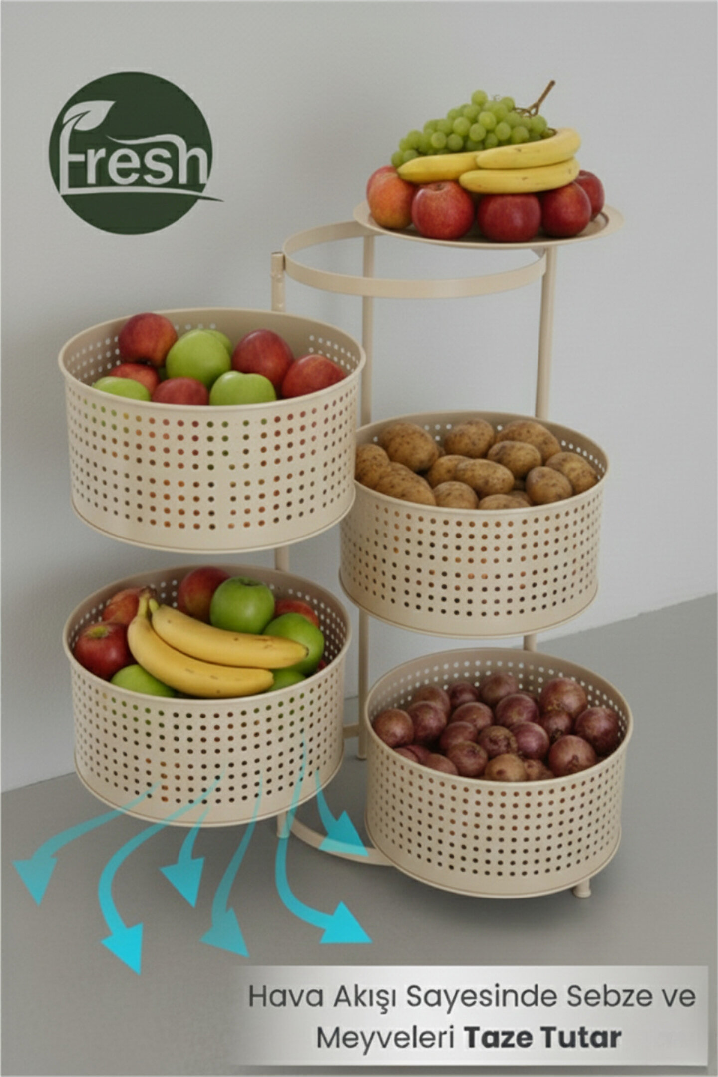 Ölçüler: Sepetler : 30x30 Cm; Sepet Yüksekliği : 13 cm ; Toplam Yükseklik : Yükseklik : 81 cm; Her bir katı min 3 kg taşımaktadır.; Mutfak tezgâhında ya da evinizin başka alanlarında ekstra depolama alanına ihtiyaç duyanlar.; Sebze ve meyvelerini düzenli şekilde saklamak isteyenler.; Evleri küçük olan, alanı verimli kullanmak isteyenler.; Kolayca hareket ettirip gerektiğinde sabitlemek isteyen kullanıcılar.;
