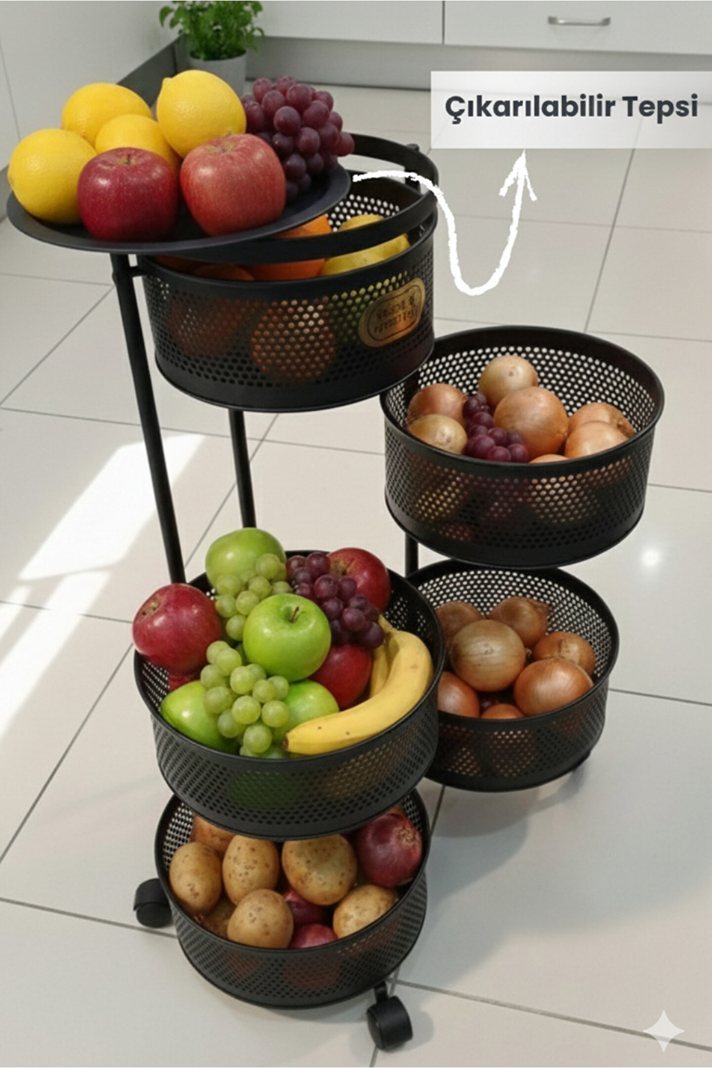 Tekerlekli sebzelik ve meyvelik ile mutfak, balkon ve kiler alanlarınızda maksimum düzen ve depolama alanı sağlar; Dayanıklı metal gövdesi sayesinde uzun ömürlü ve sağlam kullanım sunar; Delikli sepet tasarımı hava sirkülasyonunu artırarak sebze ve meyvelerin daha uzun süre taze kalmasına yardımcı olur; geniş raf yapısı ile patates, soğan, meyve, sebze ve mutfak ürünlerini düzenli şekilde saklamanızı sağlar; 360 derece dönebilen kilitlenebilir tekerlekleri sayesinde kolay taşınır ve sabitlenebilir kullanım imkânı sunar; Minimal ve modern beyaz rengi ile her mutfak dekorasyonuna uyum sağlar; Sepetler kolayca çıkarılıp temizlenebilir yapıdadır, hijyenik kullanım sunar; Mutfak tezgâhı altı, kiler, balkon ve servis alanlarında çok amaçlı kullanım için uygundur; Kurulum gerektirmeyen pratik tasarımı sayesinde hızlıca kullanıma hazır hale gelir; Yer kaplamayan dikey tasarımı ile dar alanlar için ideal bir depolama çözümüdür.;