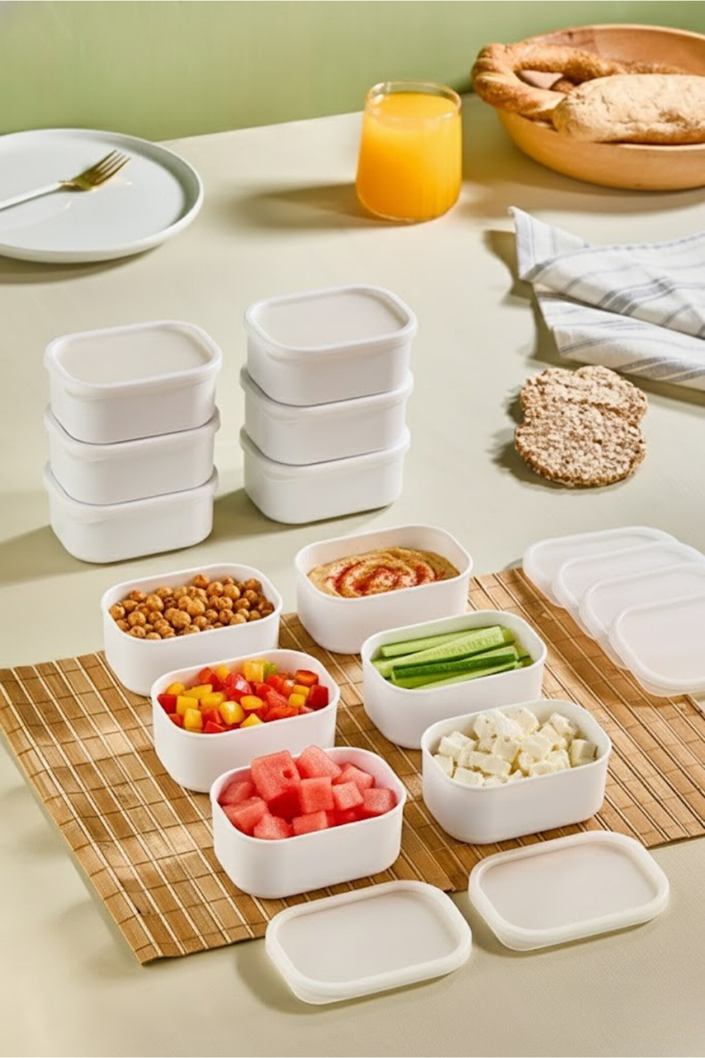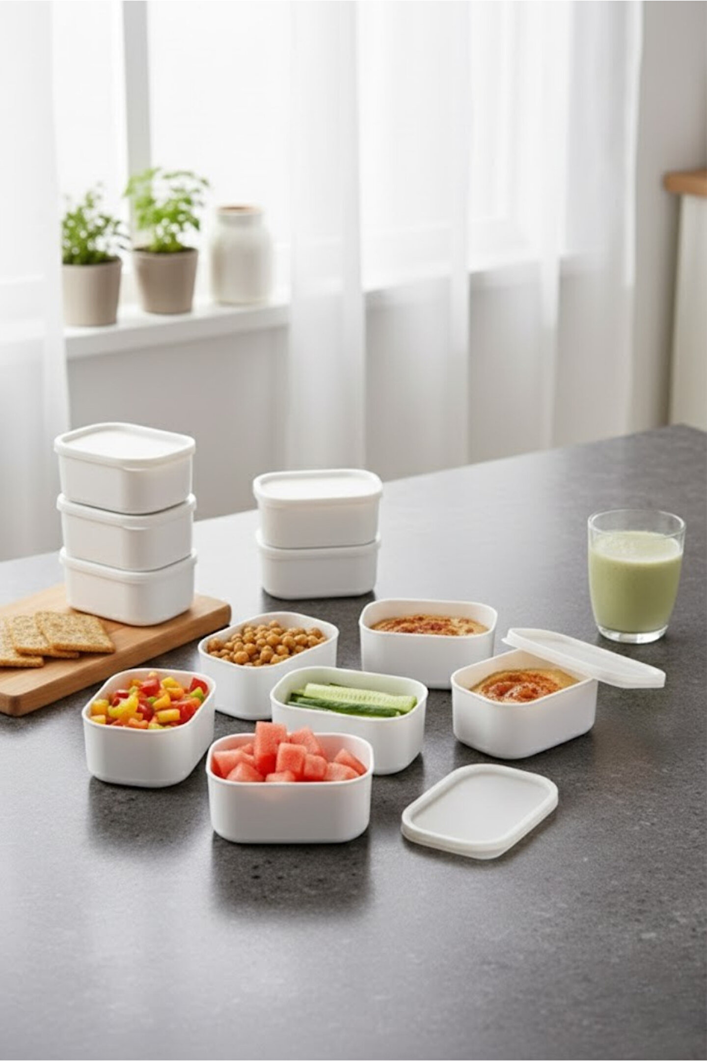 Kahvaltılık, atıştırmalık ve günlük gıda saklama ihtiyaçlarını düzenli bir şekilde karşılamak için tasarlanmış 6'lı dikdörtgen saklama kabı seti; kompakt yapısı sayesinde dolap içinde yer kaplamaz; kapaklı tasarımı sayesinde yiyeceklerin tazeliğini korur; peynir, zeytin, tereyağı, domates, kuruyemiş, meze ve porsiyonluk gıdalar için ideal kullanım sunar; BPA içermeyen sağlıklı malzemeden üretilmiştir; buzdolabında güvenle kullanılabilir; sızdırma yapmayan uyumlu kapak yapısı sayesinde kokuların karışmasını önler; hafif, taşınabilir ve günlük kullanıma uygundur; piknik, iş yemeği hazırlığı ve kahvaltı seti düzeni için pratik bir çözümdür; kolay temizlenebilir yüzeyi ile hijyenik kullanım sağlar; dayanıklı yapısı sayesinde uzun ömürlüdür; mutfak düzenini sağlayan minimal ve modern tasarımıyla mutfak tezgahlarına ve dolaplarına estetik bir görünüm kazandırır.; En-Boy : 11cm x 7,6cm ; Yükseklik : 4,8 cm