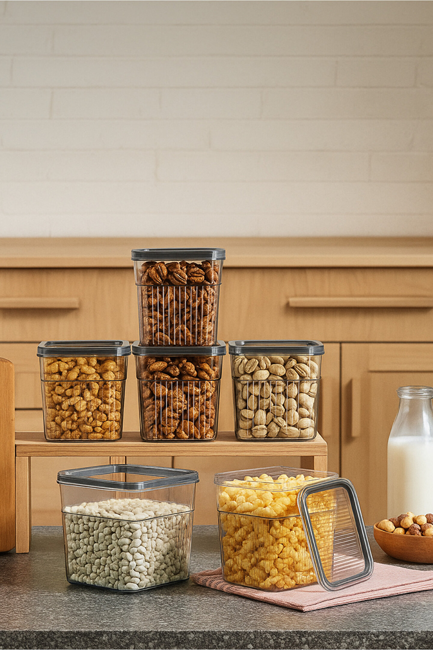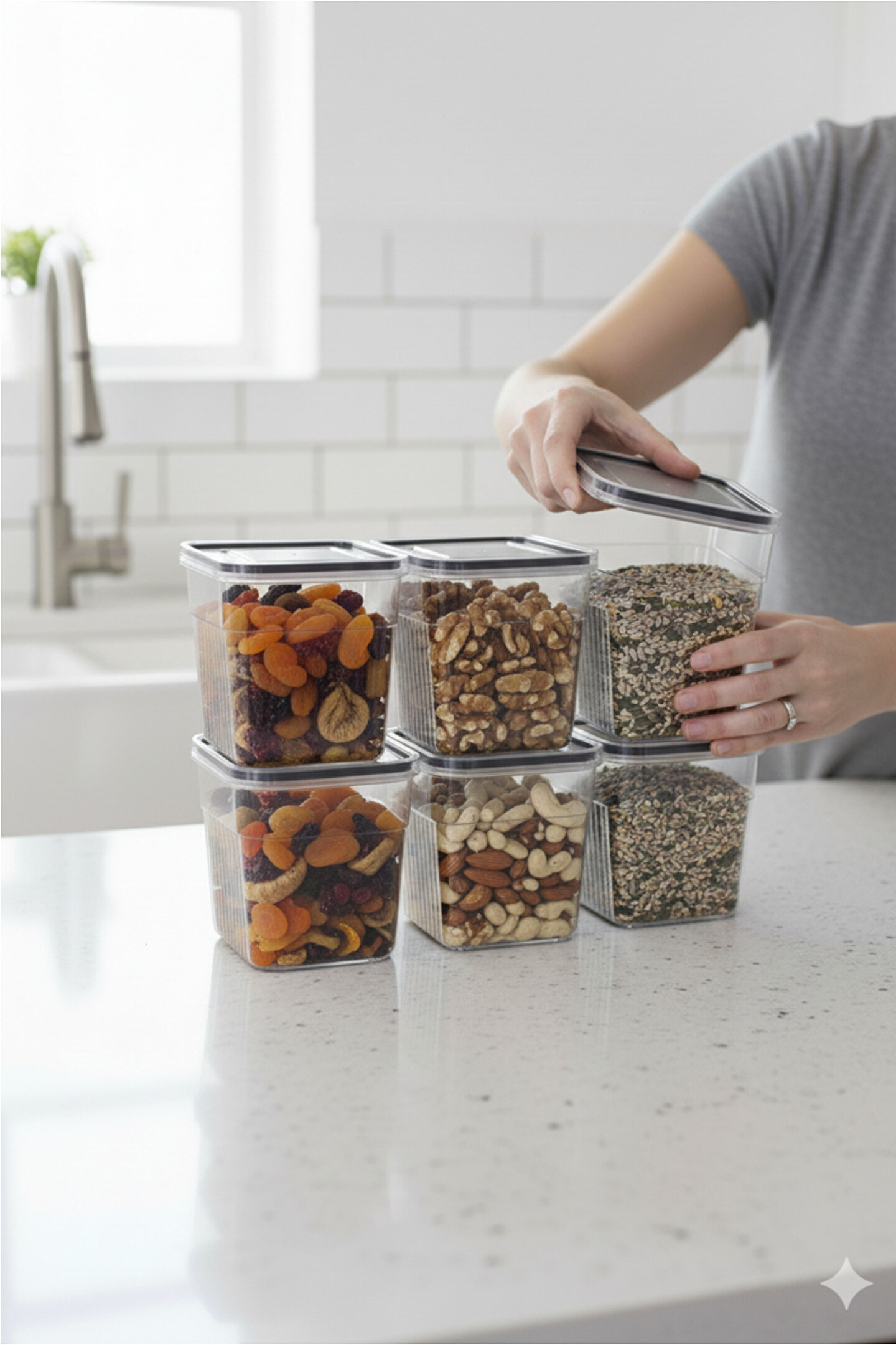Modern mutfaklar için ideal çözüm olan şeffaf kapaklı saklama kutusu seti; kuru gıdaları, bakliyatları ve atıştırmalıkları düzenli ve hijyenik şekilde saklamanıza yardımcı olur; BPA içermeyen yüksek kaliteli plastikten üretilmiştir; hava geçirmez kapak yapısı sayesinde gıdaların tazeliğini uzun süre korur; şeffaf gövde tasarımı ile içeriği kolayca görebilir, mutfakta zamandan tasarruf edebilirsiniz; fasulye, mercimek, nohut, fındık, badem, kaju, kuru meyve gibi pek çok ürünü saklamaya uygundur; minimalist tasarımı sayesinde mutfak tezgahında, dolapta veya buzdolabında estetik bir görünüm sağlar; istiflenebilir yapısı sayesinde yerden tasarruf ettirir; kolay temizlenebilir ve bulaşık makinesinde yıkanabilir; dayanıklı ve uzun ömürlü malzemesi ile mutfağınızda düzen ve şıklığı bir arada sunar.;