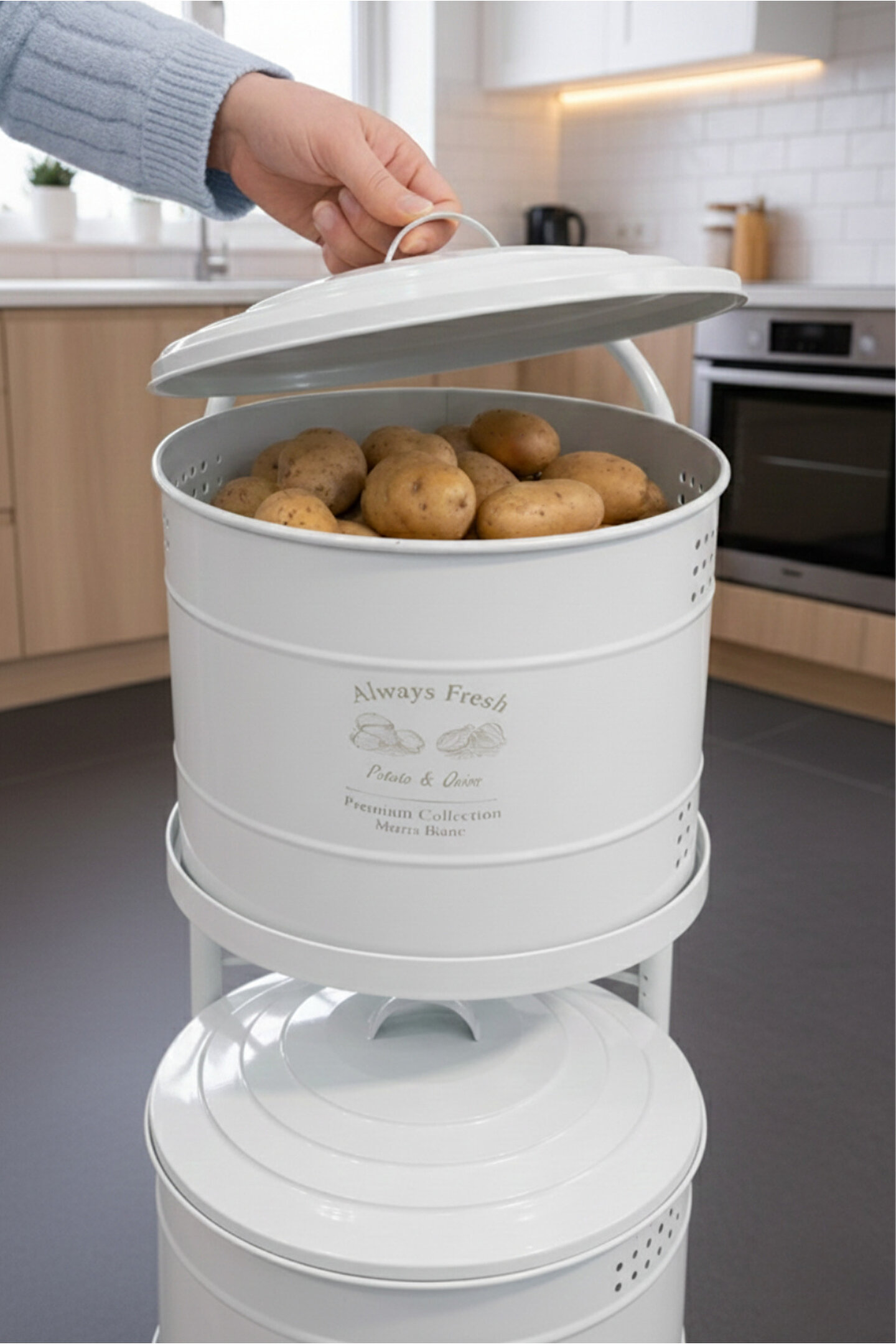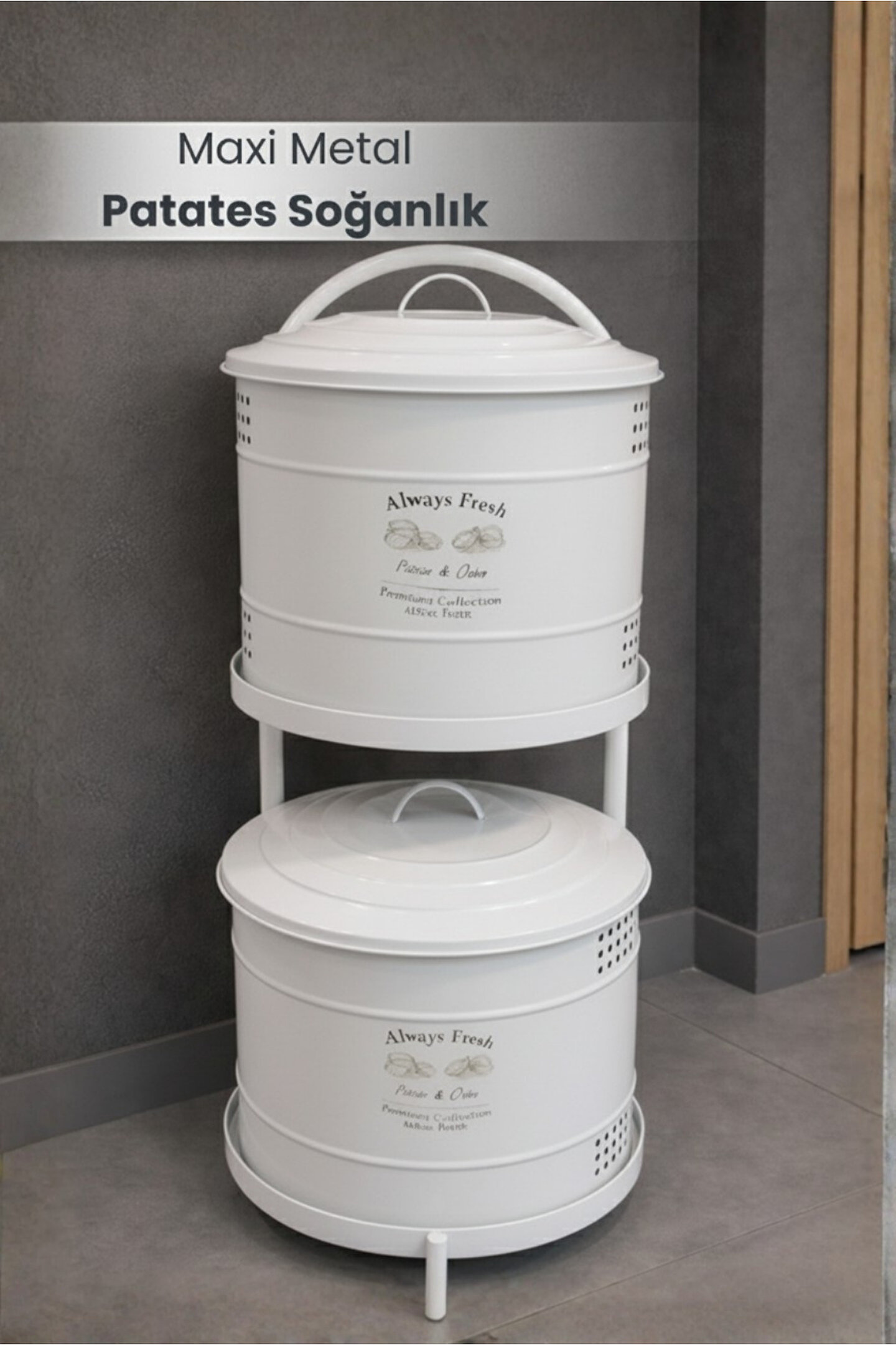 Maxi Metal Patates Soğanlık; dayanıklı metal gövde; modern ve şık beyaz renk tasarım; patates ve soğanı uzun süre taze tutmaya yardımcı hava delikli yapı; çift katlı kullanım ile yerden tasarruf sağlar; kapaklı tasarımı sayesinde ışık temasını azaltır; mutfakta düzenli ve estetik görünüm sunar; sağlam metal ayak yapısı ile dengeli kullanım; kolay taşınabilir üst kulp detayı; nem oluşumunu azaltan havalandırma delikleri; ev, mutfak ve kiler kullanımı için uygundur; dekoratif ve fonksiyonel tasarım; temizliği kolay yüzey; elde silinerek temizlenebilir; günlük kullanıma uygundur; patates ve soğan saklama için ideal çözüm