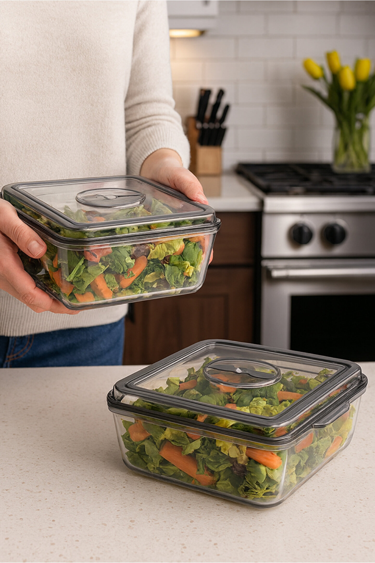 Kare contalı saklama kabı; yüksek sızdırmazlık sağlayan silikon contalı kapak; yemek, salata, meze, sos ve hazır porsiyonları güvenle saklama imkânı; şeffaf gövde sayesinde içeriği kolayca görme; buzdolabı ve derin dondurucu uyumlu yapı; mikrodalgada kapaksız kullanım kolaylığı; ısıya ve darbeye dayanıklı malzeme; bulaşık makinesinde zahmetsiz temizlik; dökülme, sızma ve koku oluşumunu engelleyen tasarım; meal prep, porsiyonlama ve günlük mutfak düzeni için ideal kullanım; modern ve kompakt formu sayesinde buzdolabında yer tasarrufu; hijyenik, sağlıklı ve uzun ömürlü saklama çözümü; mutfakta düzen, pratiklik ve tazelik sağlayan premium saklama kabı.;