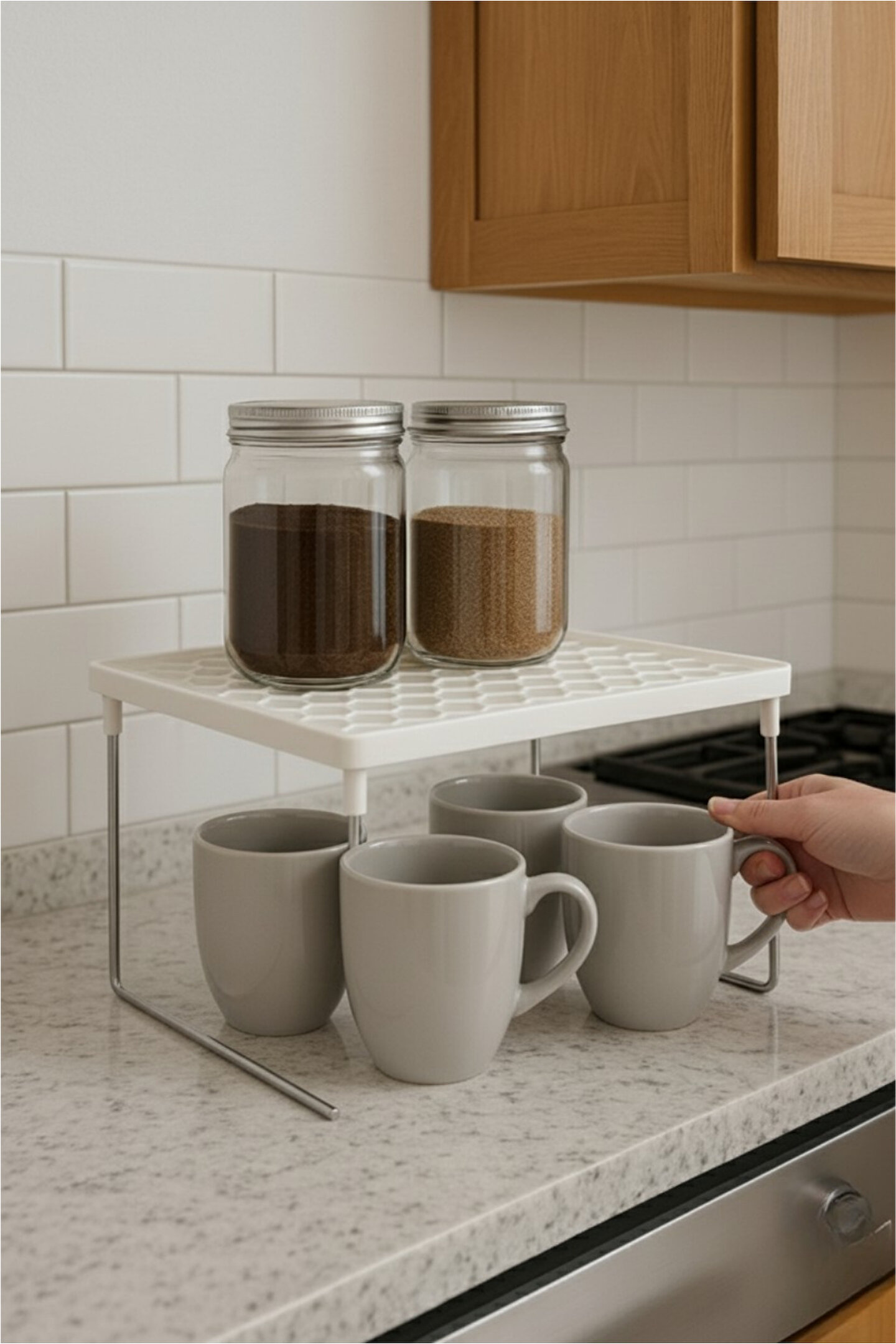 Mutfak dolabı içi düzenleyici raf; bardak, kupa, sürahi ve cam ürünleri iki katlı akıllı tasarımıyla düzenli ve erişilebilir şekilde yerleştirerek dolap içi alan kullanımını en üst seviyeye çıkarır; sağlam metal ayakları ile yüksek taşıma kapasitesi sunar; kaymaz ve dayanıklı yüzeyi sayesinde uzun yıllar formunu korur; modern, minimal ve şık görünümü tüm mutfak dolabı modelleriyle uyumludur; kırılabilir cam ürünleri güvenli şekilde konumlandırarak çarpma ve devrilme riskini azaltır; düzenli depolama sağlar, dolap karmaşasını ortadan kaldırır ve mutfakta aradığınız ürünü çok daha hızlı bulmanıza yardımcı olur; hijyenik yüzey yapısı kolay temizlenir ve leke tutmaz; hem küçük mutfaklarda alan açmak hem de geniş mutfaklarda profesyonel bir düzen elde etmek için ideal pratik düzenleyici çözümdür; dekoratif duruşu ile dolap içi estetiğini güçlendirir; mutfak düzenini korumanıza yardımcı olur ve kullanım kolaylığı sağlayarak günlük hayatınızı daha konforlu hale getirir.; Ölçüsü 29,5x27 cm yükseklik 14,5 cm