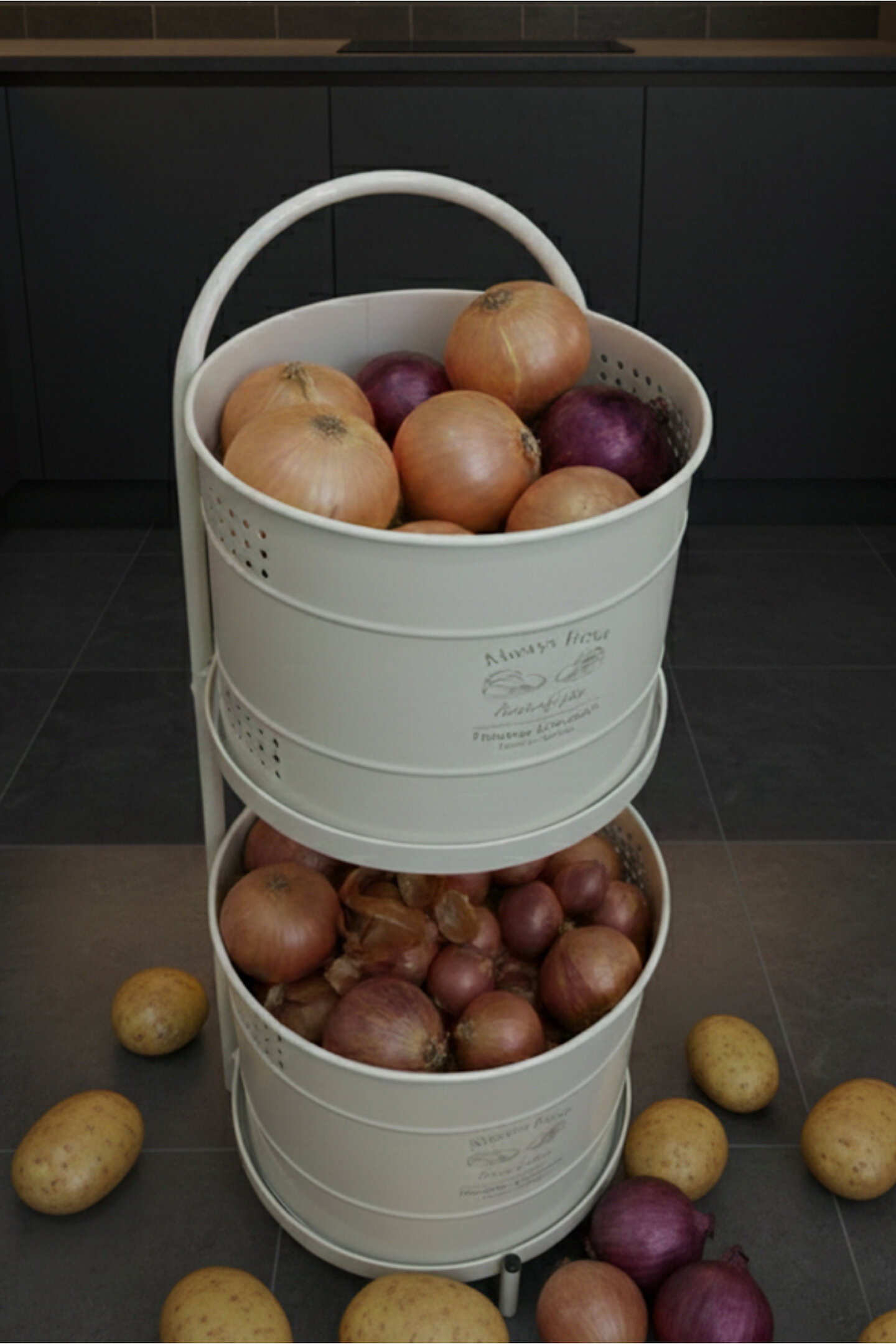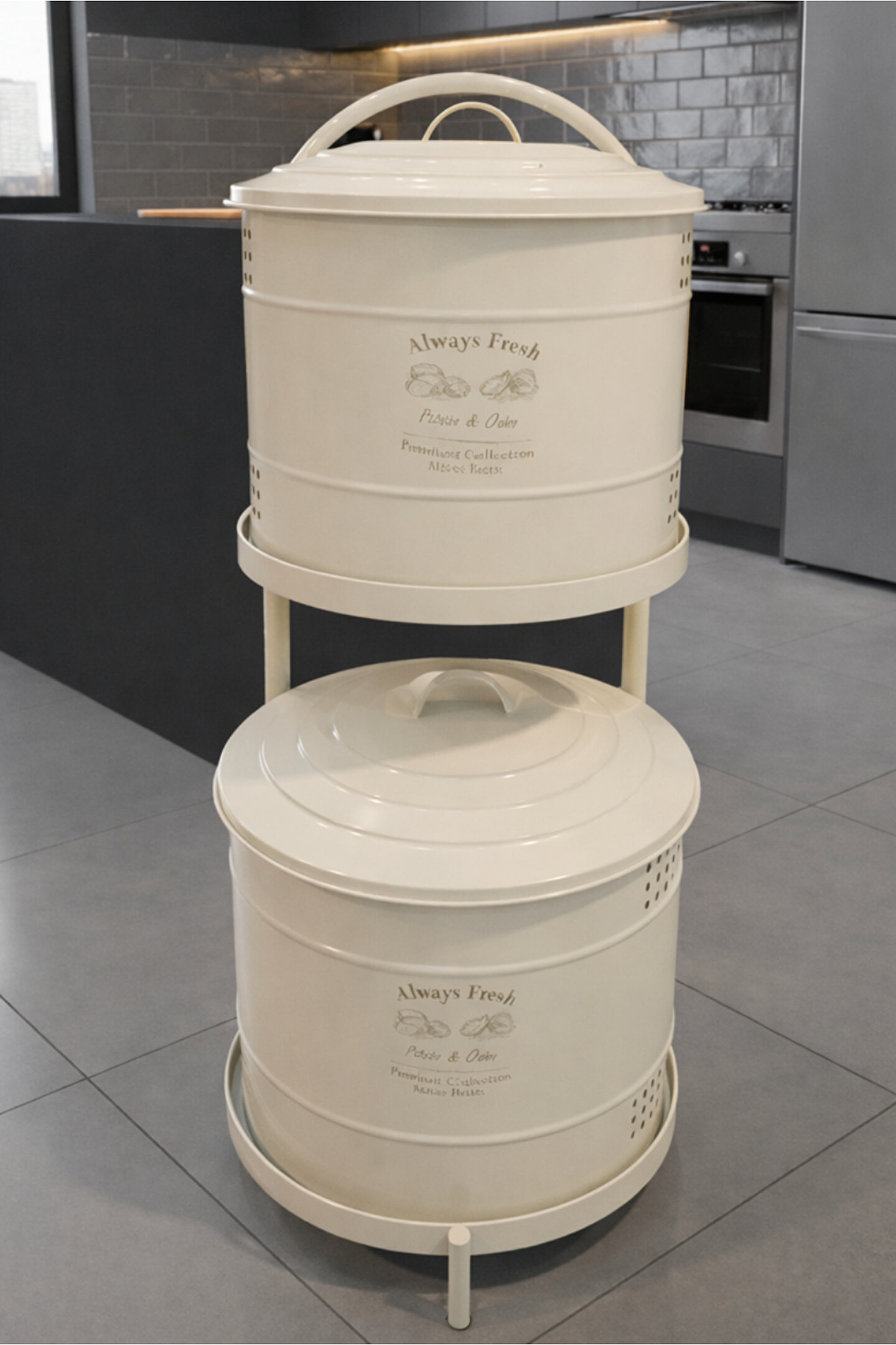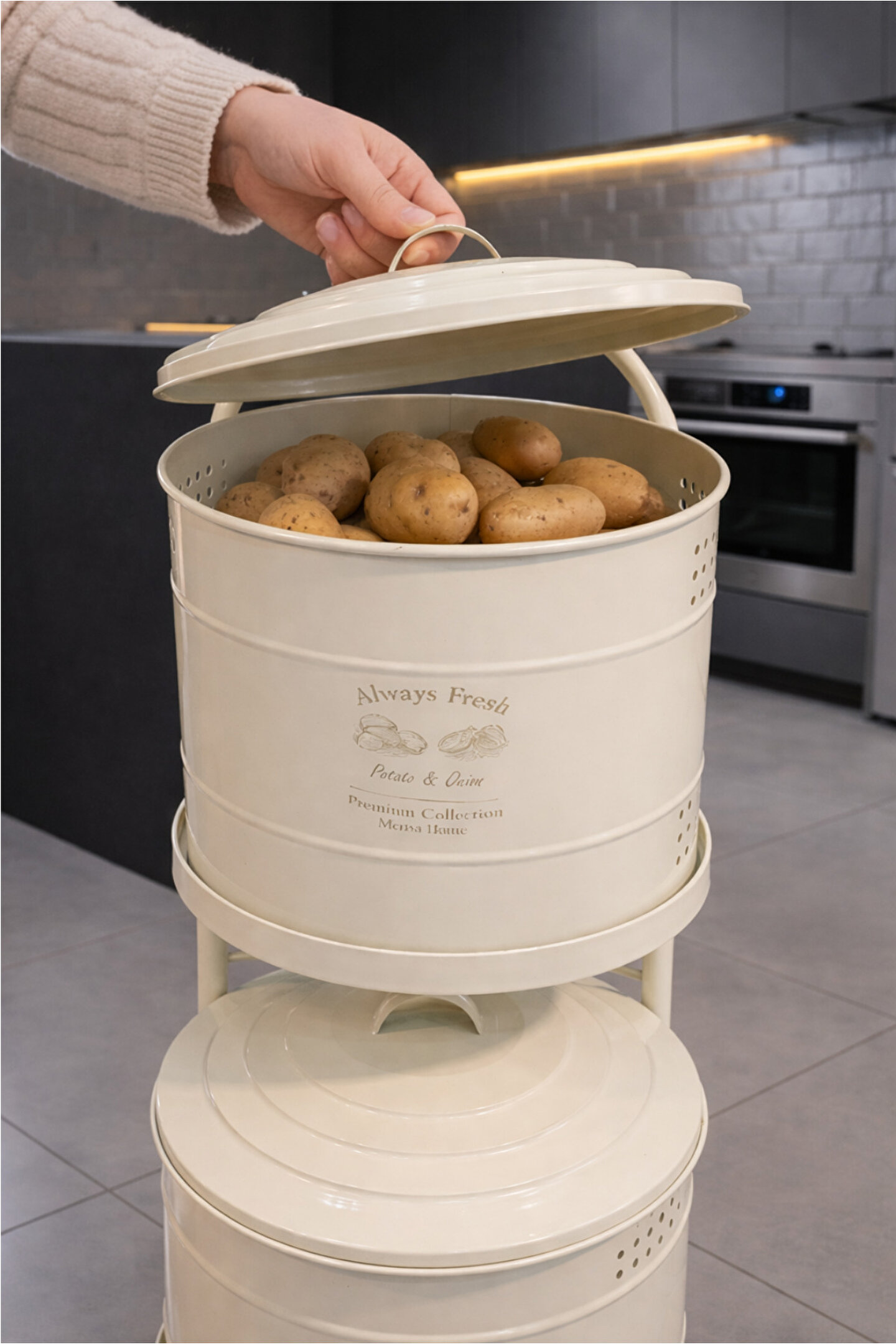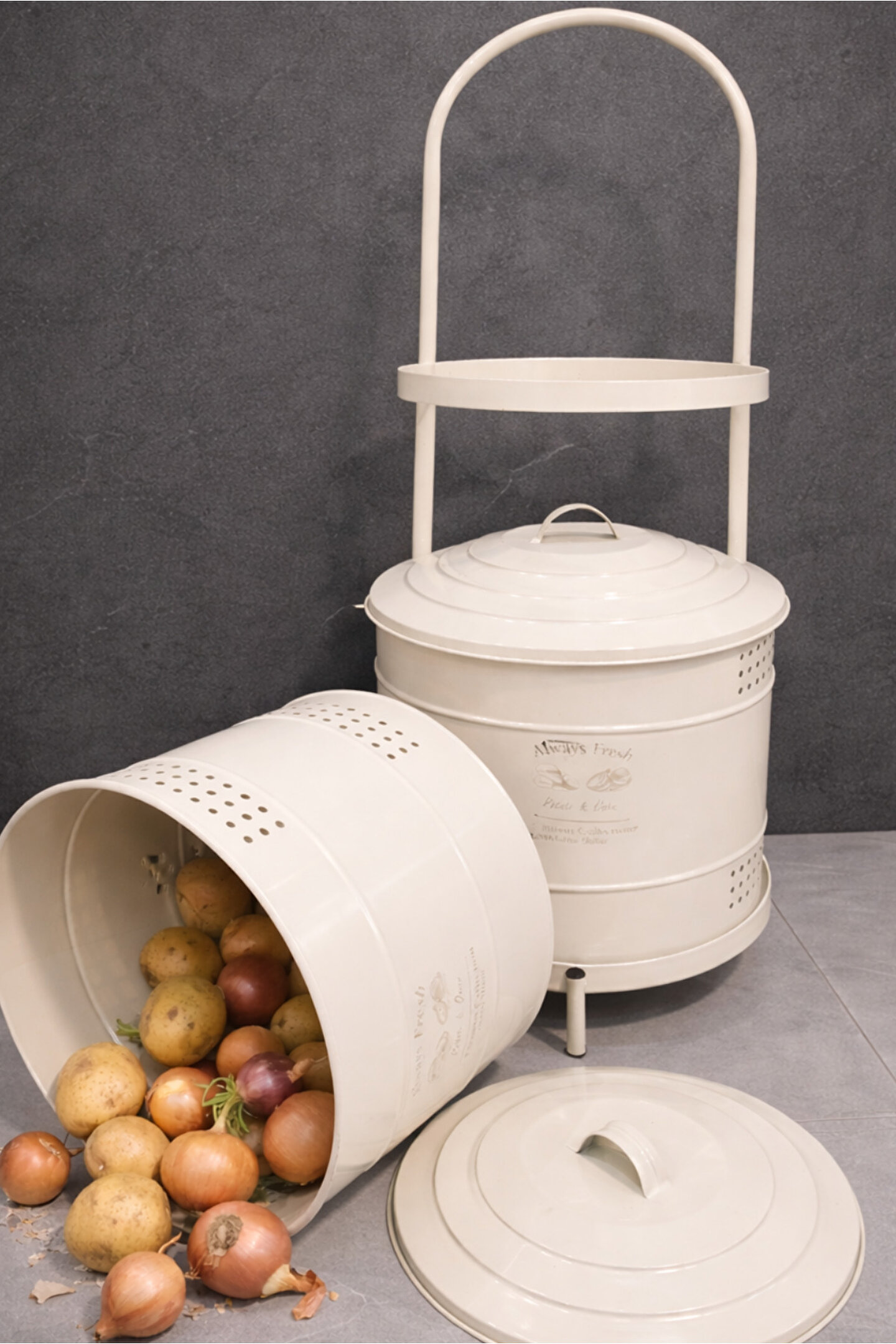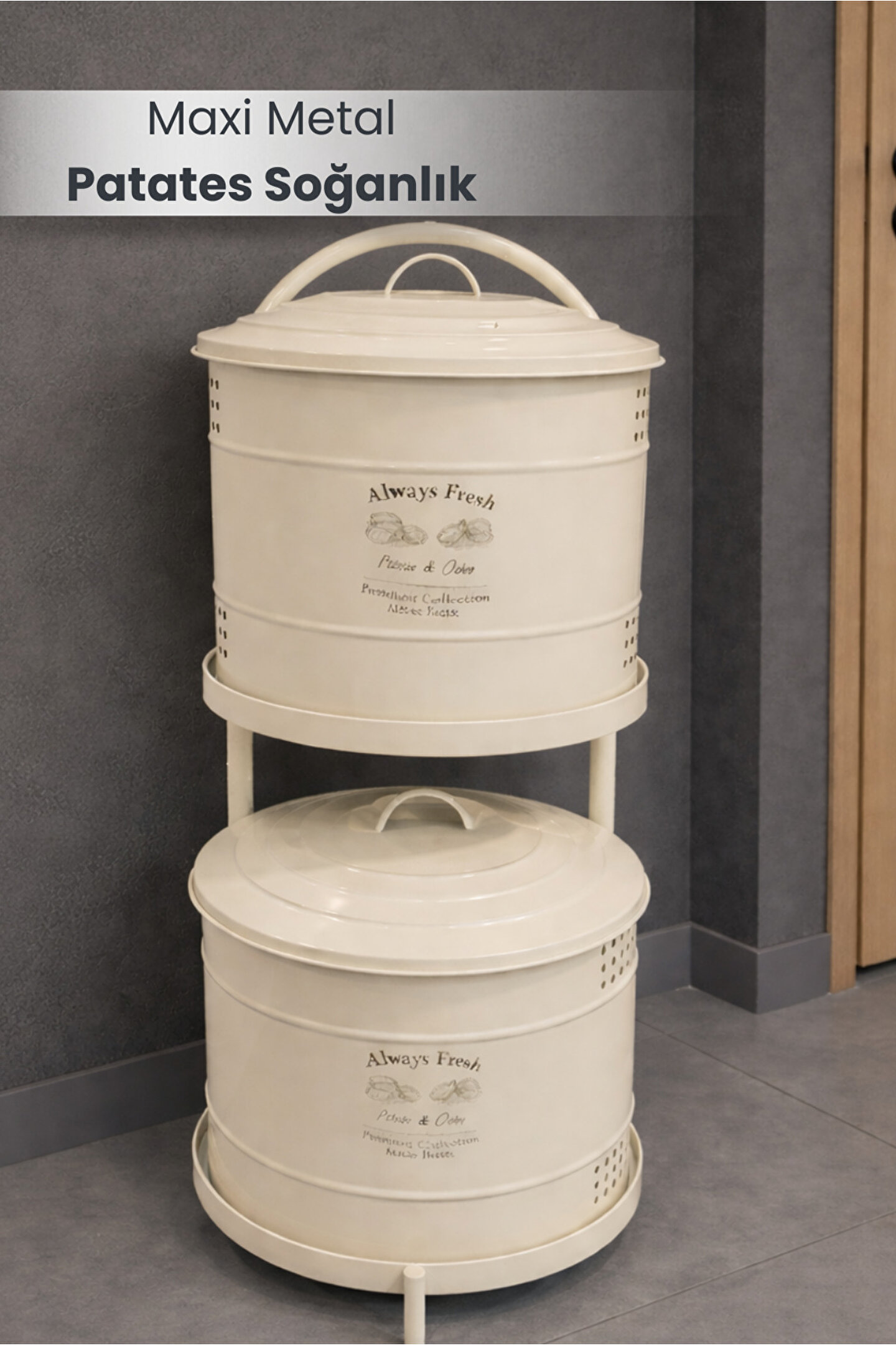 Maxi Metal Patates Soğanlık; dayanıklı metal gövde; modern ve şık beyaz renk tasarım; patates ve soğanı uzun süre taze tutmaya yardımcı hava delikli yapı; çift katlı kullanım ile yerden tasarruf sağlar; kapaklı tasarımı sayesinde ışık temasını azaltır; mutfakta düzenli ve estetik görünüm sunar; sağlam metal ayak yapısı ile dengeli kullanım; kolay taşınabilir üst kulp detayı; nem oluşumunu azaltan havalandırma delikleri; ev, mutfak ve kiler kullanımı için uygundur; dekoratif ve fonksiyonel tasarım; temizliği kolay yüzey; elde silinerek temizlenebilir; günlük kullanıma uygundur; patates ve soğan saklama için ideal çözüm