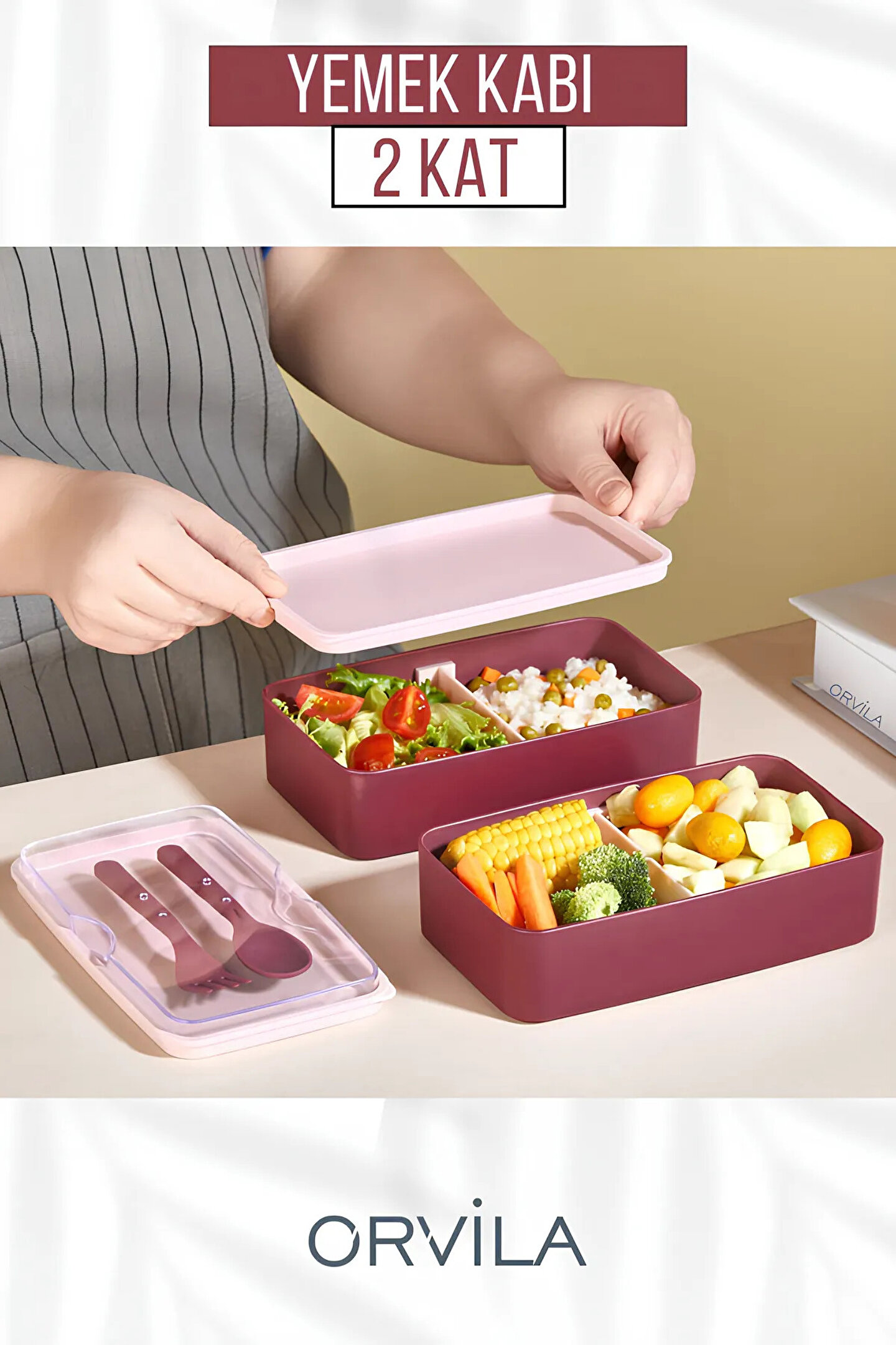 Orvila Mega Boy 2 Katlı Yemek Saklama Kabı 2 Litre - Kendinden Çatal Kaşık Servisli Lunch Box Set