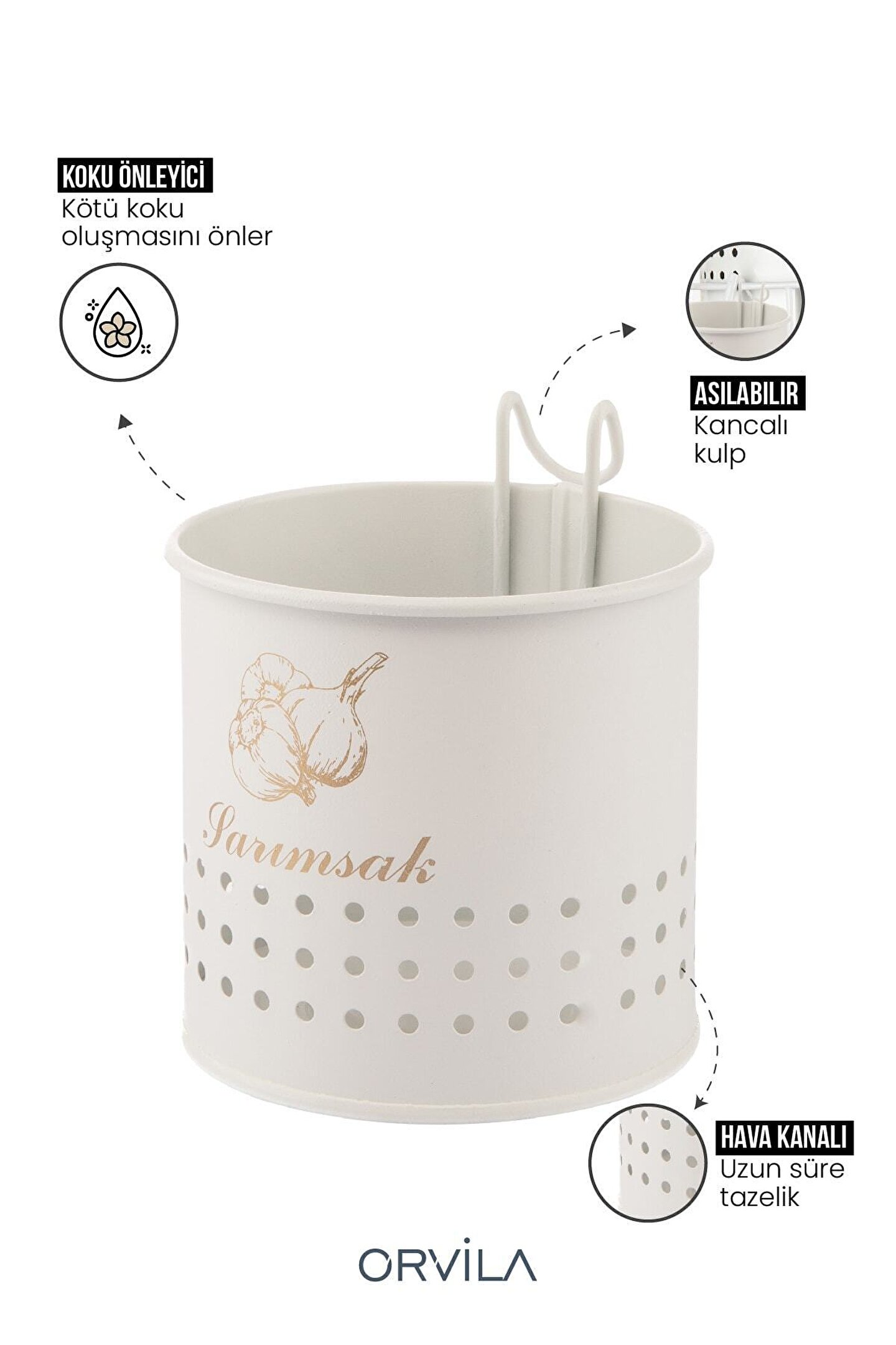 Sarımsaklık Kovası Ebatı: 13x13 Cm ; Asılabilir Sarımsaklık Kovasını Özel Kulp sayesinde isterseniz Patates Soğanlık Kovanızın Herhangi bir yerine asabilirsiniz. Dilerseniz yere ya da masaüstünde koyabilirsiniz. ; Altın kaplama baskıdır. ; İade Koşulları: Ürünlerinizin tarafınıza ulaştığı şekilde patpata sarılı, kutulu ve ambalajı bozulmamış olarak iade edilmesi gerekmektedir. Aksi halde gönderilen iadeler kabul edilemeyecektir. ;