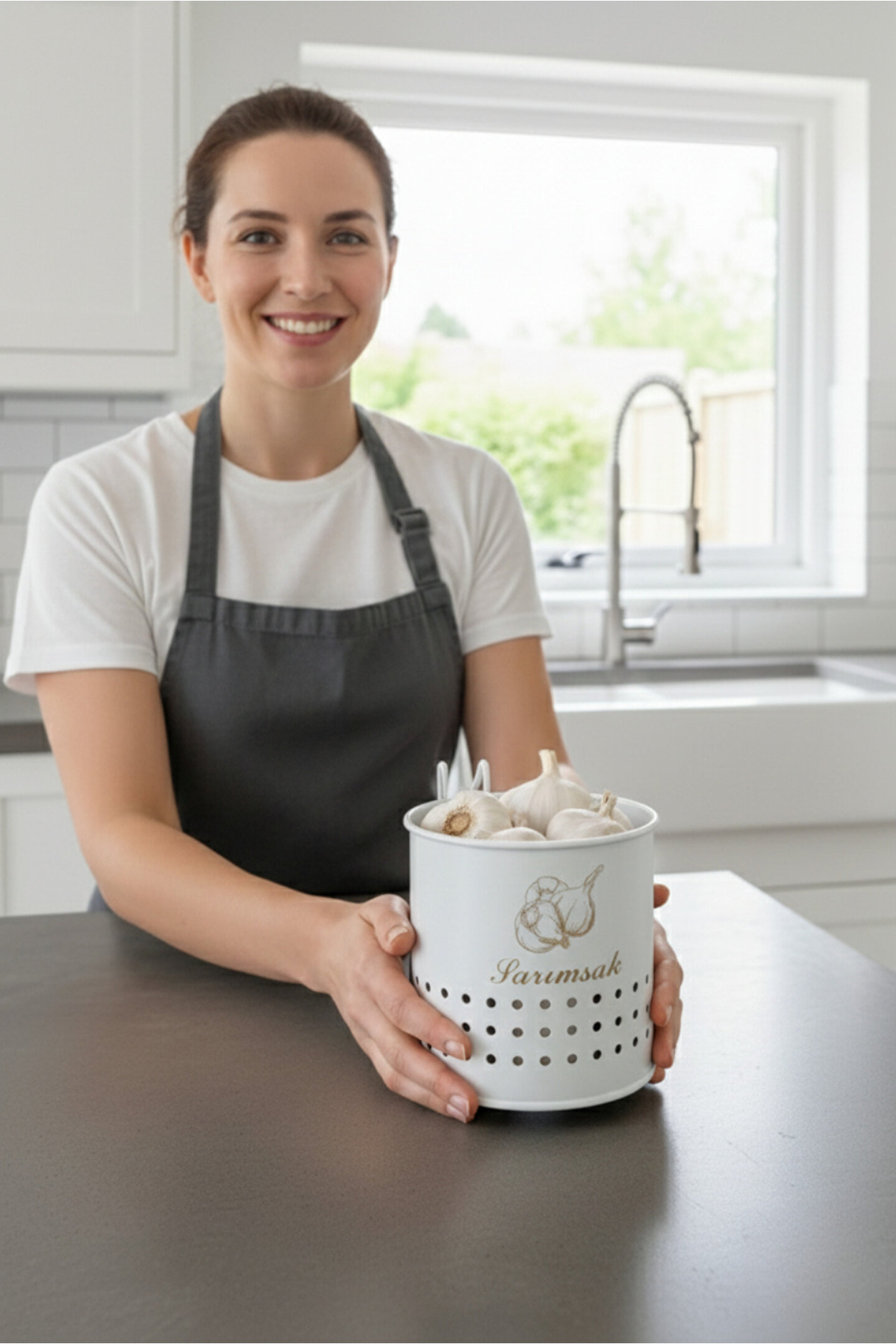Metal sarımsaklık; kaliteli ve dayanıklı çelik gövde; paslanmaz yapısı sayesinde uzun ömürlü kullanım; sarımsakları nemden, ışıktan ve küflenmeden korur; alt kısımdaki hava delikleri sayesinde ideal hava akışı sağlar; sarımsakların daha uzun süre taze kalmasına yardımcı olur; modern mat siyah tasarım; mutfak tezgâhında dekoratif duruş; hijyenik kapaklı yapı; sarımsak kokusunu dışarı yaymadan muhafaza eder; geniş iç hacmiyle bol miktarda sarımsak depolar; kolayca silinip temizlenebilir; mutfak düzenini artıran pratik saklama çözümü; sağlıklı saklama koşulları oluşturur; robust metal yapısı darbelere karşı dayanıklıdır; ergonomik tutma bölümü sayesinde rahat kullanım; mutfak organizasyon ürünleri arasında popüler tercihlerden biridir; modern, şık ve fonksiyonel tasarımıyla her mutfağa uyum sağlar; uzun süreli tazelik ve düzen için ideal bir saklama kabı.; Ölçü 13x13 cm dir.