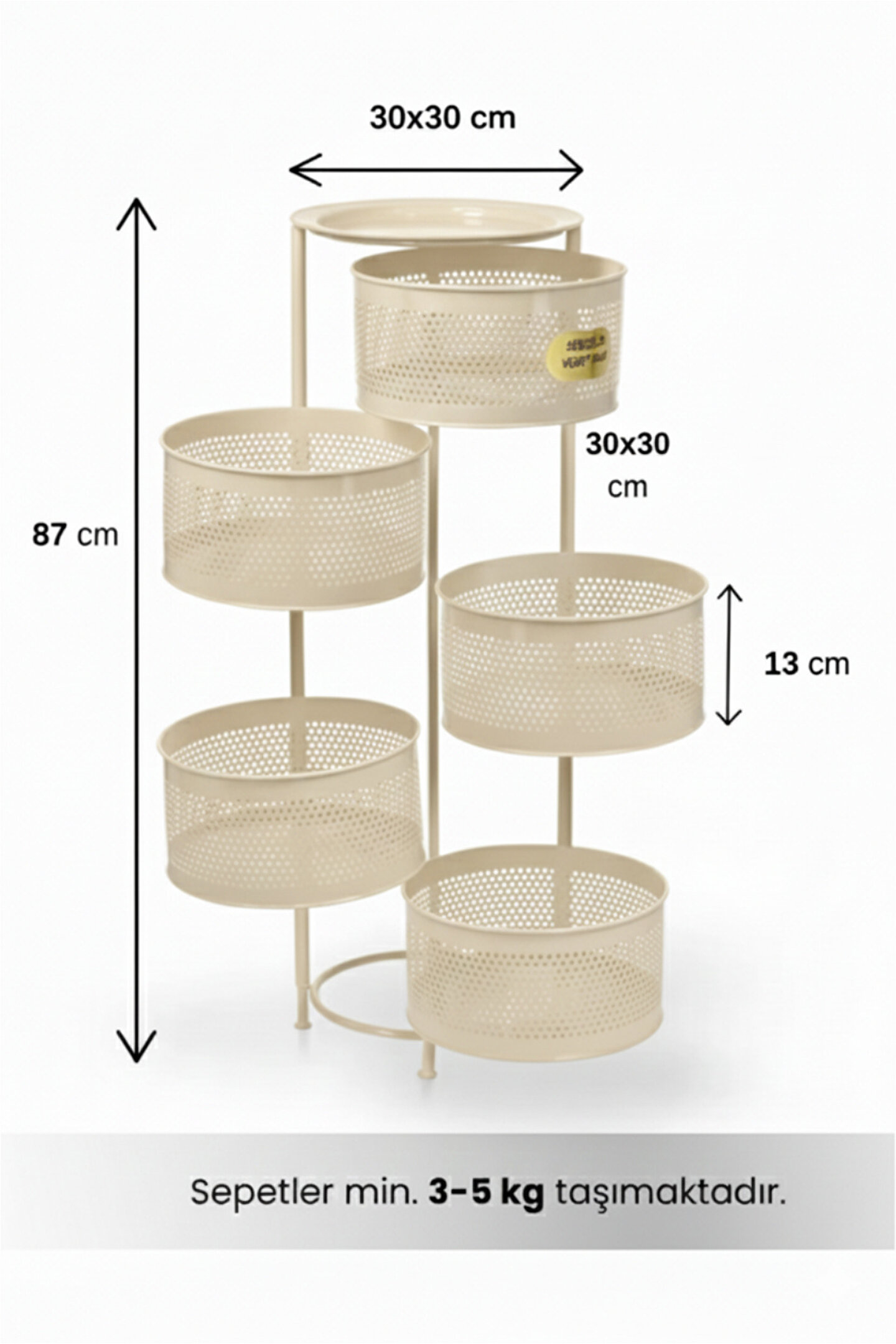 Ölçüler: Sepetler : 30x30 Cm; Sepet Yüksekliği : 13 cm ; Toplam Yükseklik : Yükseklik : 87 cm; Mutfak tezgâhında ya da evinizin başka alanlarında ekstra depolama alanına ihtiyaç duyanlar.; Sebze ve meyvelerini düzenli şekilde saklamak isteyenler.; Evleri küçük olan, alanı verimli kullanmak isteyenler.; Kolayca hareket ettirip gerektiğinde sabitlemek isteyen kullanıcılar.;
