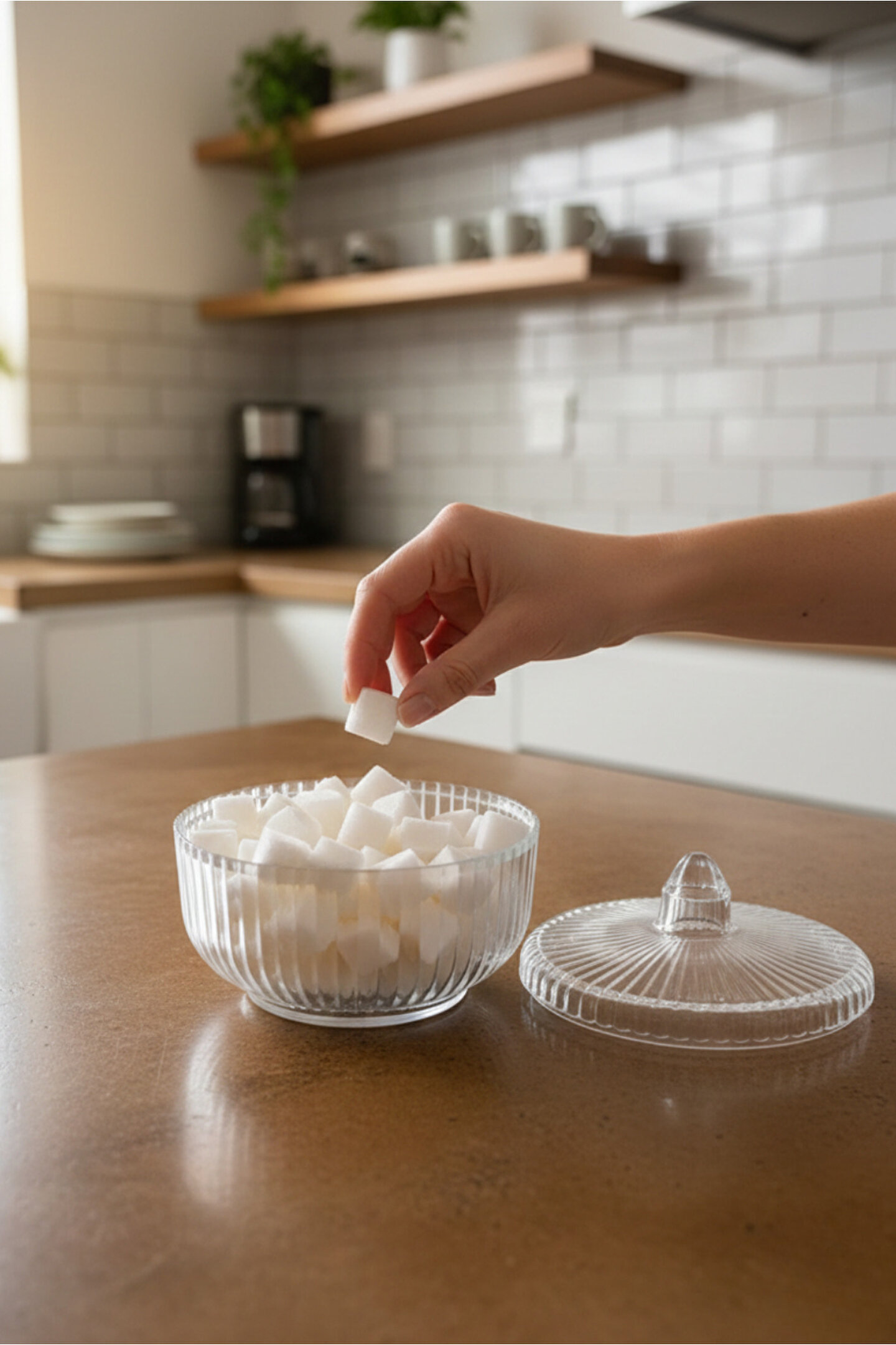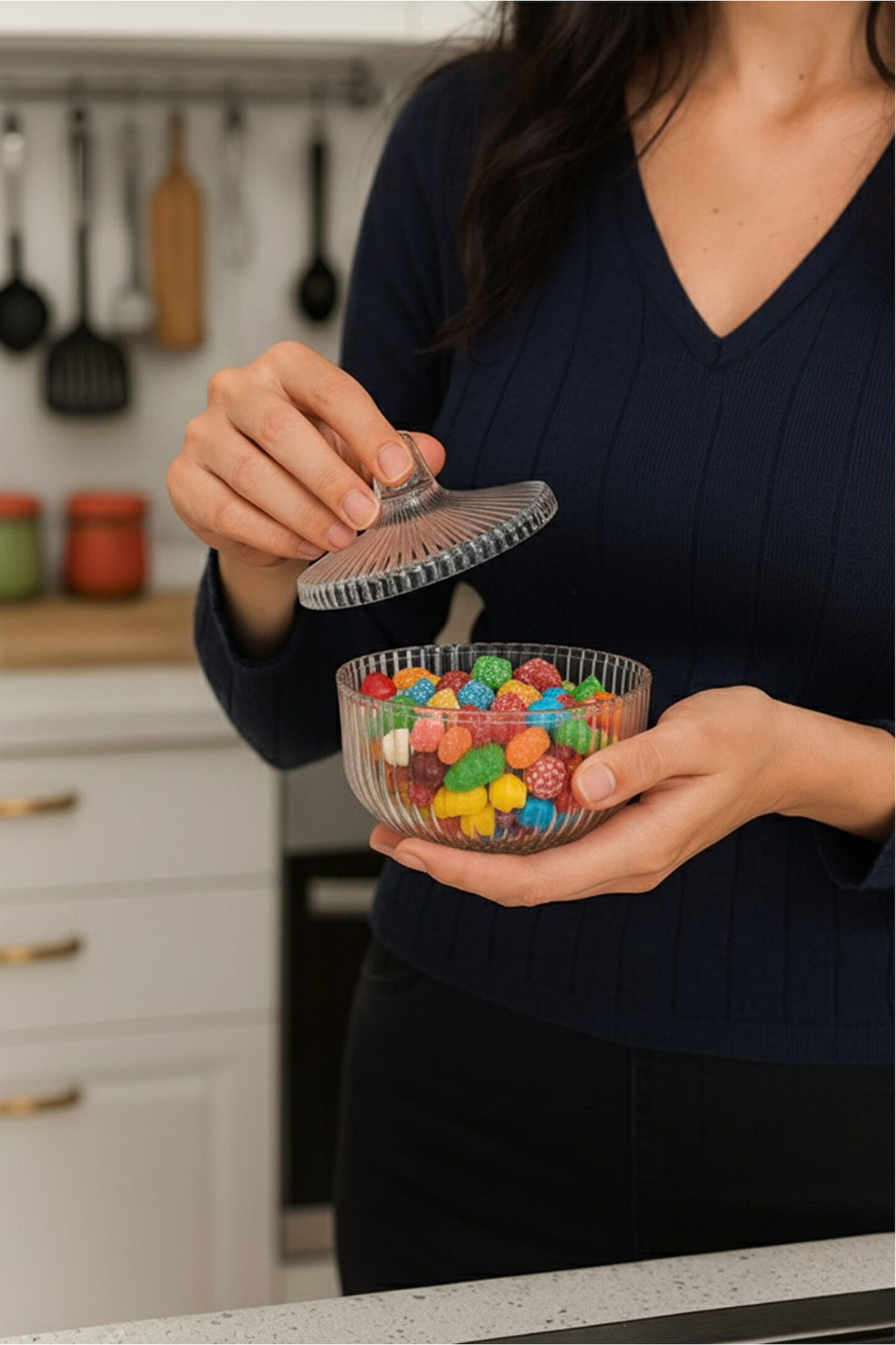 Mika şekerlik; cam görünümlü şeffaf plastik malzemeden üretilmiş olup kırılmaz, hafif ve güvenli kullanım sağlar; lokum, şekerleme, çikolata, kahve yan ürünleri ve kuruyemiş sunumları için ideal tasarıma sahiptir; modern çizgili desenli kapak yapısı ile hijyenik koruma sunar; tezgâh üstünde dekoratif bir görünüm oluşturur; salon, mutfak, ofis ve misafirlik alanlarında şık sunum imkânı verir; geniş iç hacmi sayesinde ürünleri düzenli şekilde saklamaya uygundur; plastik yapısı sayesinde darbelere dayanıklıdır ve çocuklu evlerde güvenle kullanılabilir; temizlik açısından pratik olup elde veya düşük ısıda bulaşık makinesinde yıkanabilir; hafif yapısı sayesinde kolay taşınır ve günlük kullanıma uygundur; şık tasarımıyla hediye alternatifi olarak da tercih edilir; uzun ömürlü kaliteli malzemeden üretilmiştir; kokusuz ve BPA’sızdır; kapak yapısı sayesinde toz ve dış etkenlere karşı üstün koruma sağlar; tatlı sunumlarına modern bir dokunuş katar; ekonomik ve estetik ürün arayanlar için ideal çözümdür.;