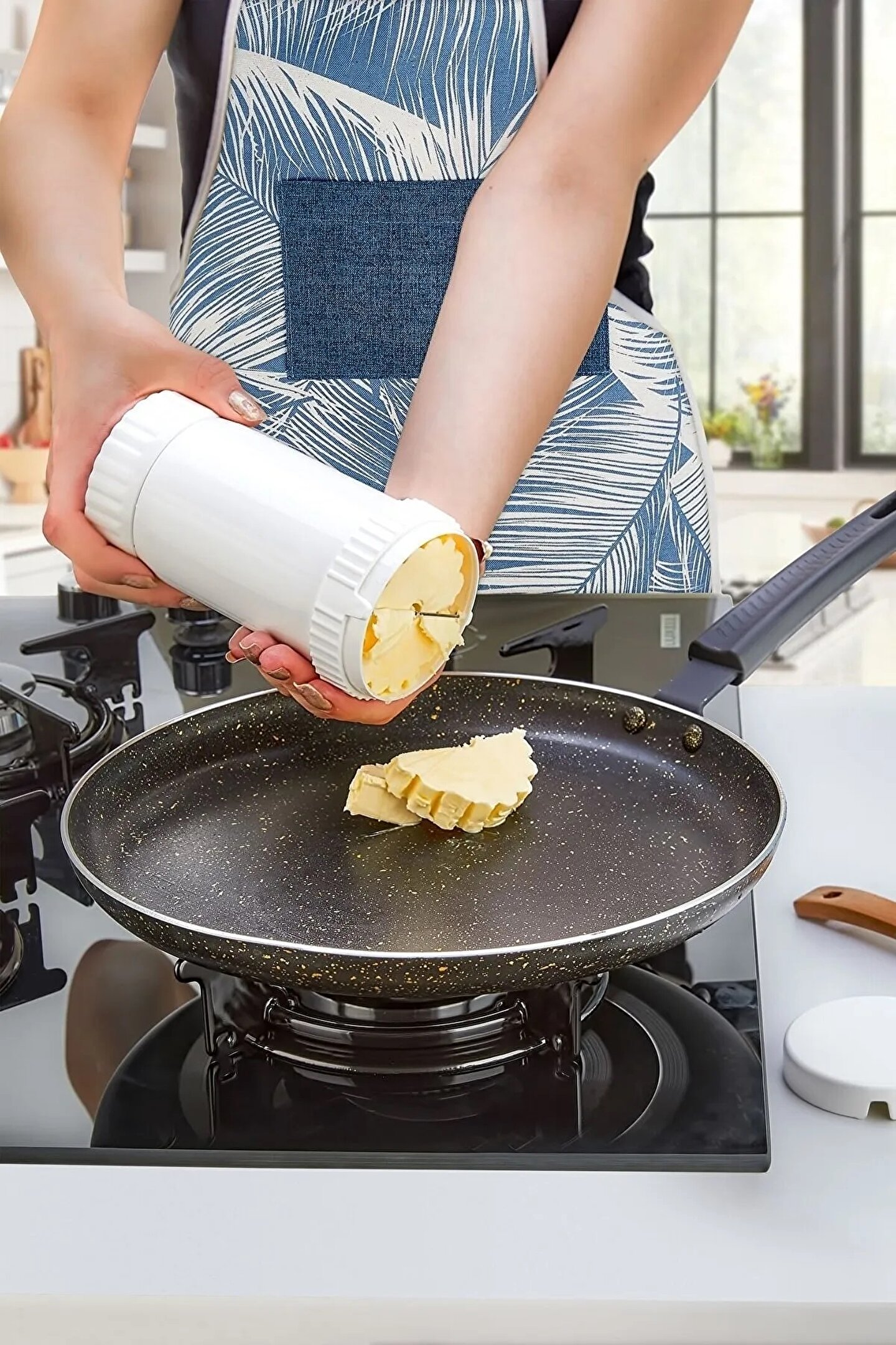 ButterCut Tereyağı Saklama, Ölçme, Yayma ve Kesme Aparatı. Tamamen yerli üretim olan tasarım patentli tereyağı aparatı ürünümüz ButterCut, tereyağınızı bozulmadan sağlıklı bir şekilde saklamanıza ve düzenli bir şekilde el değmeden kullanmanıza olanak sağlar. ; ButterCut,200, 250 ve 350 gr gibi kozalak tereyağları ile kova içinde satılmakta olan tüm tereyağları için doluma ve kullanıma uygundur. ; Kullanımı oldukça basittir ; paketinden çıkardığınız tereyağını hazneye yerleştirdikten sonra mekanizmayı kolayca döndürerek tereyağını hazneden istediğiniz ölçüde çıkarabilir ve istediğiniz gramajda kesebilirsiniz. ; ButterCut ürünümüz, yemeklerinizi lezzetli bir şekilde yapabilmeniz için tereyağını gramajlı olarak kullanmanıza olanak sağlayan basit ve anlaşılır şekilde dizayn edilmiştir. Kek, kurabiye gibi ölçü gerektiren tariflerinizde ürün üzerinde belirtilen gramaj ibarelerinden faydalanabilirsiniz. ; Ön kısımda bulunan paslanmaz çelik tel, tereyağınız ne kadar soğuk olursa olsun basit bir döndürme hareketi ile el değmeden istenilen ölçüde dilimler. ; Tereyağını tost, bazlama gibi pek çok yiyecekte pratikçe sürerek kullanmak, ButterCut tereyağı aparatı ile çok kolay ve zevkli hale gelecektir. ; ButterCut oldukça kolay bir şekilde sökülebilir kompakt yapıda üretilmiştir. Tüm parçalarını kullanımdan önce ve sonra bulaşık makinesinde güvenle yıkayabilirsiniz. ; ButterCut ile tereyağı yapısı bozulmadan buzdolabında kullanıma hazır şekilde saklanabilir. ; Gıda temasına uygundur. Yüksek kalite BPA içermeyen geri dönüştürülebilir ABS hammadde ile gıdaya uygun dayanıklı paslanmaz çelik telden üretilmiştir. ; Ürün çapı 7,2 cm, ürün uzunluğu 13 cm.dir. ;