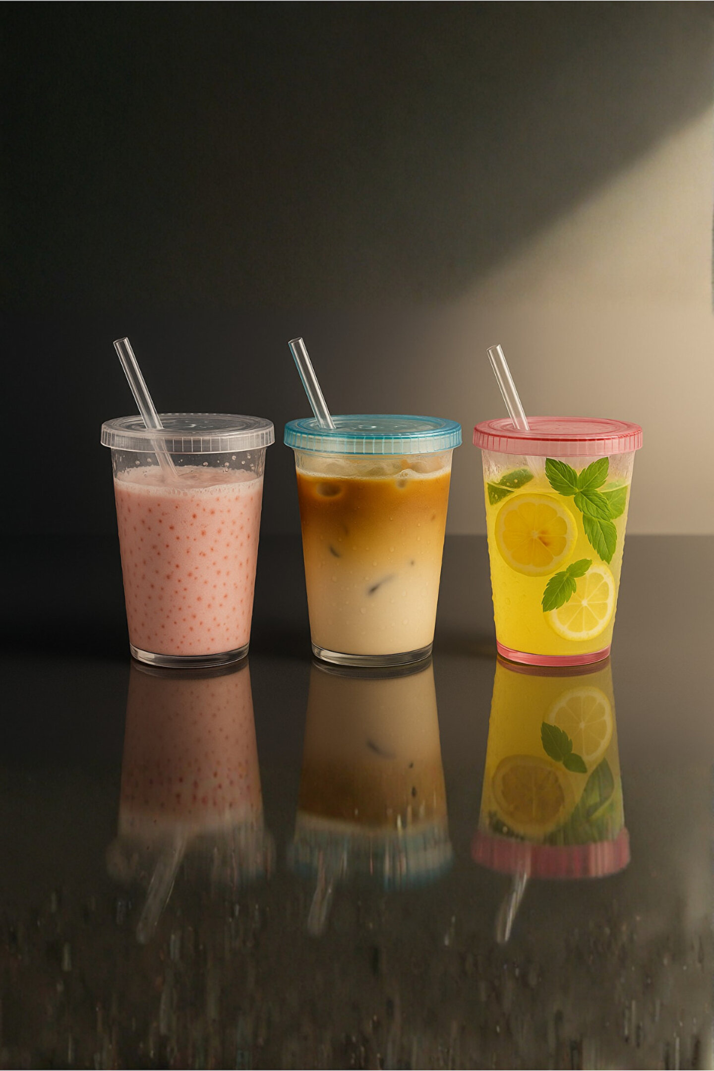 Şeffaf pipetli plastik bardak; günlük kullanıma uygun, şık ve ergonomik tasarımıyla dikkat çeker; 500 ml kapasitesi sayesinde kahve, limonata, smoothie, soğuk çay ve gazlı içecekler gibi tüm soğuk içecekler için idealdir; dayanıklı plastik yapısı sayesinde uzun ömürlü kullanım sağlar; kapaklı yapısı sayesinde dökülmeleri önler ve hijyenik taşımaya imkân tanır; pipetli olması pratik içim kolaylığı sunar; su damlacıklı yüzey deseni estetik bir görünüm kazandırır; şeffaf gövdesi içeceğin rengini göstererek modern bir sunum sağlar; ofiste, evde, piknikte veya arabada kullanım için uygundur; sıcak içeceklerle kullanılması önerilmez; kolay temizlenebilir yapısıyla günlük yaşamda pratik bir alternatiftir; elde yıkanması tavsiye edilir.;