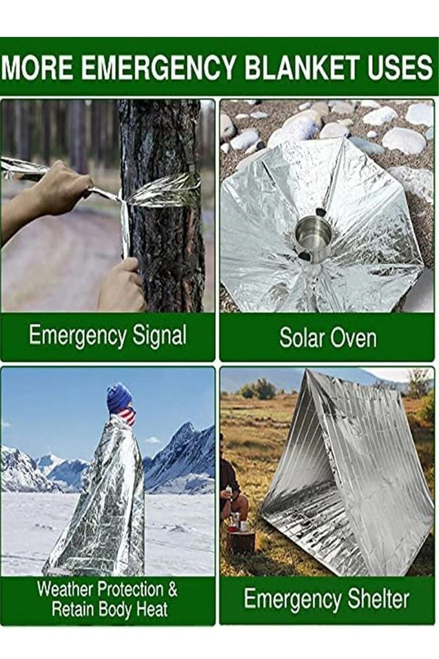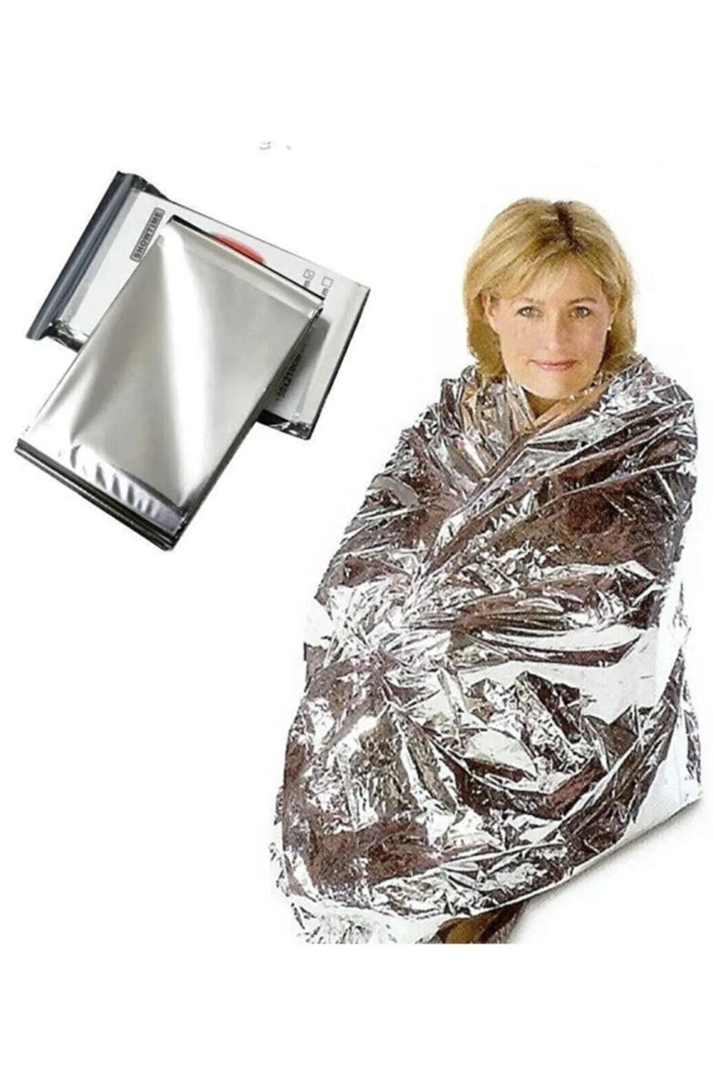100'LÜ EKONOMİK PAKET TEK KİŞİLİK ACİL DURUM İLK YARDIM TERMAL BATTANİYE RÜZGAR SU GEÇİRMEZ 100x200 ; NSL-Tech tarafından üretilen Tek Kişilik Termal Battaniye içerisindeki özel malzeme ile vücut sıcaklığı ile ısı yalıtımı sağlayarak vücudun kendini ısıtmasını sağlar. Rüzgar ve su geçirmediği için vücut sıcaklığını en hızlı şekilde normal koşullara getirerek gerçek termal koruma sağlar. ; NSL-Tech özel olarak -20 dereceye kadar koruyan, hipotermiyi engelleyen, rüzgar ve su geçirmeyen özellikte NSL-Tech Acil Durum İlk Yardım Battaniyesi Termal Battaniyesini üretmiştir. ; Ürünümüz 100 adettir. Tek kişilik özel ölçüsüyle üretilmiştir. ; Ürün tek seferlik kullanımlık değildir. İdeal kullanımda birden fazla kullanılabilir. Çok zor yırtılan ve ultra dayanıklı bir malzemeden üretilmiştir. ; Termal battaniye, uzay battaniyesi, acil durum battaniyesi, ilk yardım battaniyesi, veya şok battaniyesi olarak da bilinir. ; İlk olarak NASA tarafından uzay istasyonları ve mekikleri için ısı yalıtımı sağlamak için kullanıldı. Şu anda arama kurtarma ekipleri tarafından kazazedeleri hipotermiden korumak için kullanılıyor. ; Termal battaniyeler polietilen tereftalat olarak bilinen polyesterin yansıtıcı metalik bir yüzeyle kaplanmasıyla elde edilir. Battaniyeler vakumda tortulama yöntemi kullanılarak ince bir yüzeyle kaplanır. ; Termal battaniyeler vücut sıcaklığını koruyan, bir naylon örtü ile kaplanmış, birkaç mikron kalınlığındaki yansıtıcı metal bir tabaka olarak tanımlanabilir. ; Termal battaniyeler vücuda sarılarak, çadırın içinde, uyku tulumunun altına, çadırın dışına sarılarak, arama kurtarma ekipleri tarafından kazazedeleri korumak için ve hipotermiden korunmak için kullanılır. ; Yer kaplamaz ve hafif oluşuyla acil deprem, afet, ilk yardım çantasına konulabilir. Yerli üretimdir. ;