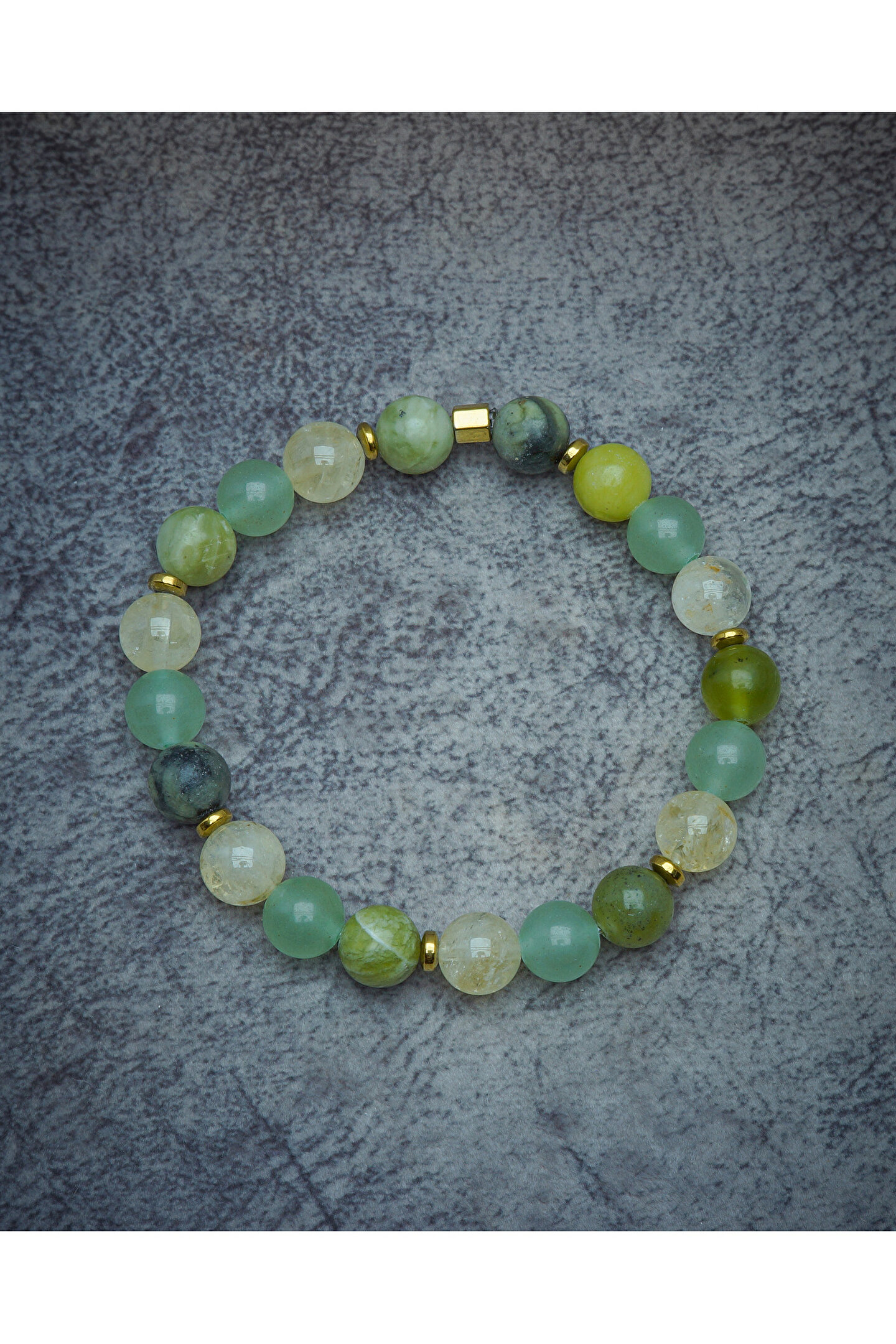 Bu özel tasarım bileklik, Boğa burcunun doğasına uygun olarak seçilen yeşim, sitrin ve aventurin taşlarının güçlü enerjilerini bir araya getiriyor.; Yeşim taşı, Boğa nın güvenlik arayışını ve huzur ihtiyacını destekleyerek içsel denge sağlar, aynı zamanda sakinleştirici etkisiyle stresi azaltır.; Sitrin, burcun zaman zaman durağanlaşan enerjisini canlandırır, özgüveni artırır ve bolluk bilinci kazandırır; bu sayede Boğa nın maddi ve manevi hedeflerine ulaşmasına yardımcı olur.; Aventurin ise şans ve fırsat taşı olarak bilinir; kalp çakrasını açarak duygusal iyilik hali sunar ve pozitif düşünceyi teşvik eder.; Bu üç taşın uyumu, Boğa burcunun sabırlı, güvenilir ve doğayla uyumlu yapısını desteklerken; aynı zamanda onu enerji, neşe ve içsel huzurla buluşturur.; Bu bileklik, hem şık bir aksesuar hem de burcun ruhsal ihtiyaçlarına cevap veren anlamlı bir eşlikçidir.; Bilek çevrenizi ölçmek için bir mezureyi bileğinizin en geniş yerine, çok sıkmadan ancak tam oturacak şekilde dolayın.; Mezurenin başlangıç noktası ile birleştiği yeri okuyarak ölçünüzü belirleyin.; Eğer mezureniz yoksa, bir ip veya şerit kullanarak bileğinizi ölçüp, ardından bir cetvelle uzunluğunu belirleyebilirsiniz.; Doğal taşlar, yüzyıllardır farklı kültürlerde enerjileri ve faydalı etkileriyle tanınmış ve kullanılmıştır.; Ancak bu etkiler kişisel inanç, deneyim ve algıya bağlı olarak değişiklik gösterebilir.; Bu taşların doğal güzellikleri ve eşsiz enerjileri, günlük yaşamınıza estetik ve anlam katabilir.