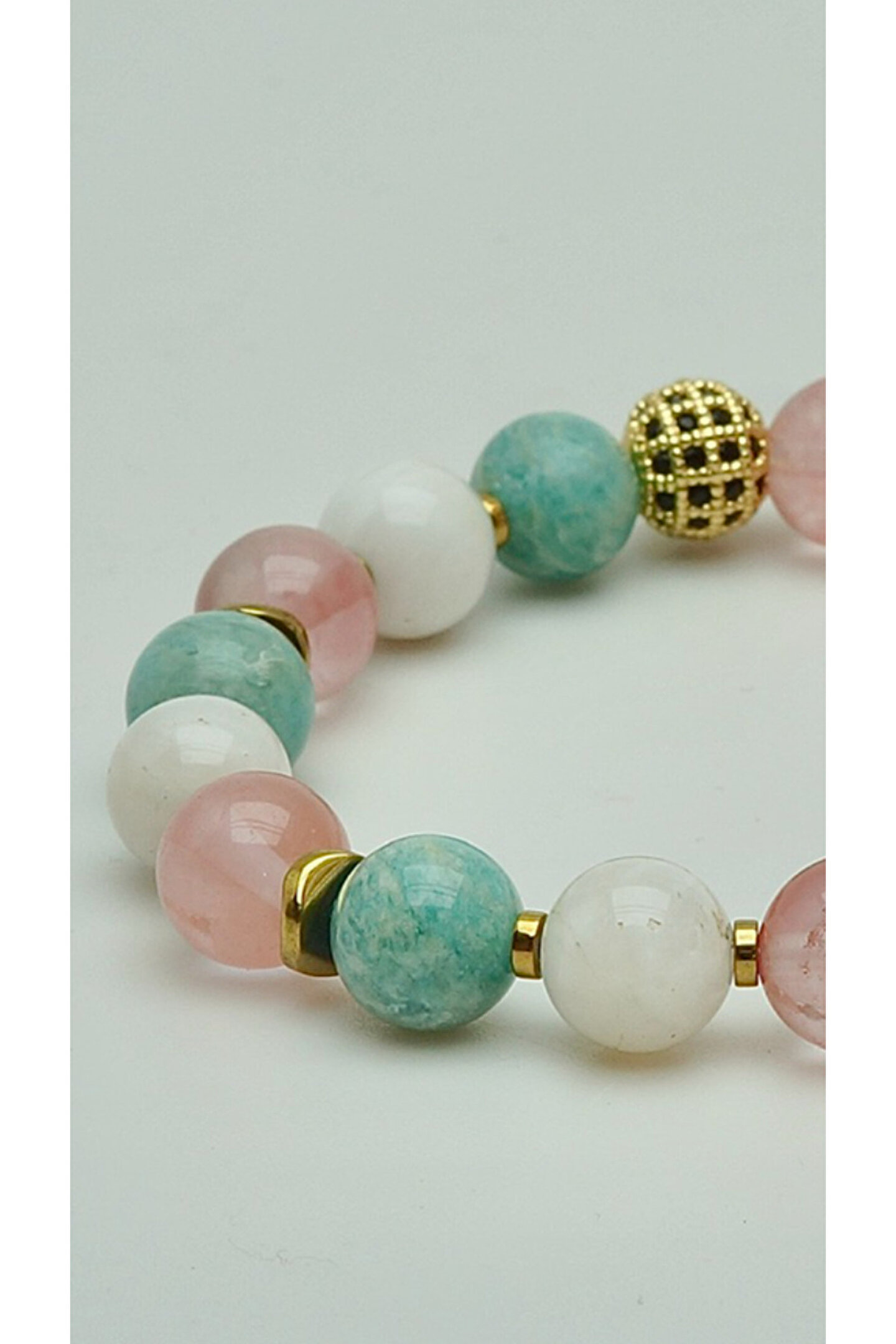 Amazonit, Ay taşı ve Gül kuvarsın birleşimiyle tasarlanan bu bileklik, dişil enerjinin yumuşak ama güçlü akışını destekler.; Ay taşı sezgiyi uyandırırken, Gül kuvars kalbi sevgiyle doldurur; Amazonit ise huzurlu bir ifade ve içsel denge kazandırır.; Bu özel üçlü, kadının kalbini, ruhunu ve sezgilerini uyumlu bir şekilde bir araya getirir.; • Amazonit → Huzur & İfade • Ay taşı → Sezgi & Denge • Gül kuvars → Sevgi & Şefkat Doğal taşlar, yüzyıllardır farklı kültürlerde enerjileri ve faydalı etkileriyle tanınmış ve kullanılmıştır.; Ancak bu etkiler kişisel inanç, deneyim ve algıya bağlı olarak değişiklik gösterebilir.; Bu taşların doğal güzellikleri ve eşsiz enerjileri, günlük yaşamınıza estetik ve anlam katabilir.; Bilek çevrenizi ölçmek için bir mezureyi bileğinizin en geniş yerine, çok sıkmadan ancak tam oturacak şekilde dolayın.; Mezurenin başlangıç noktası ile birleştiği yeri okuyarak ölçünüzü belirleyin.; Eğer mezureniz yoksa, bir ip veya şerit kullanarak bileğinizi ölçüp, ardından bir cetvelle uzunluğunu belirleyebilirsiniz.