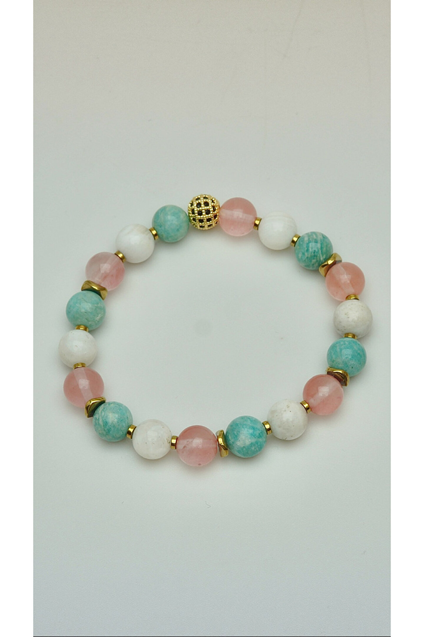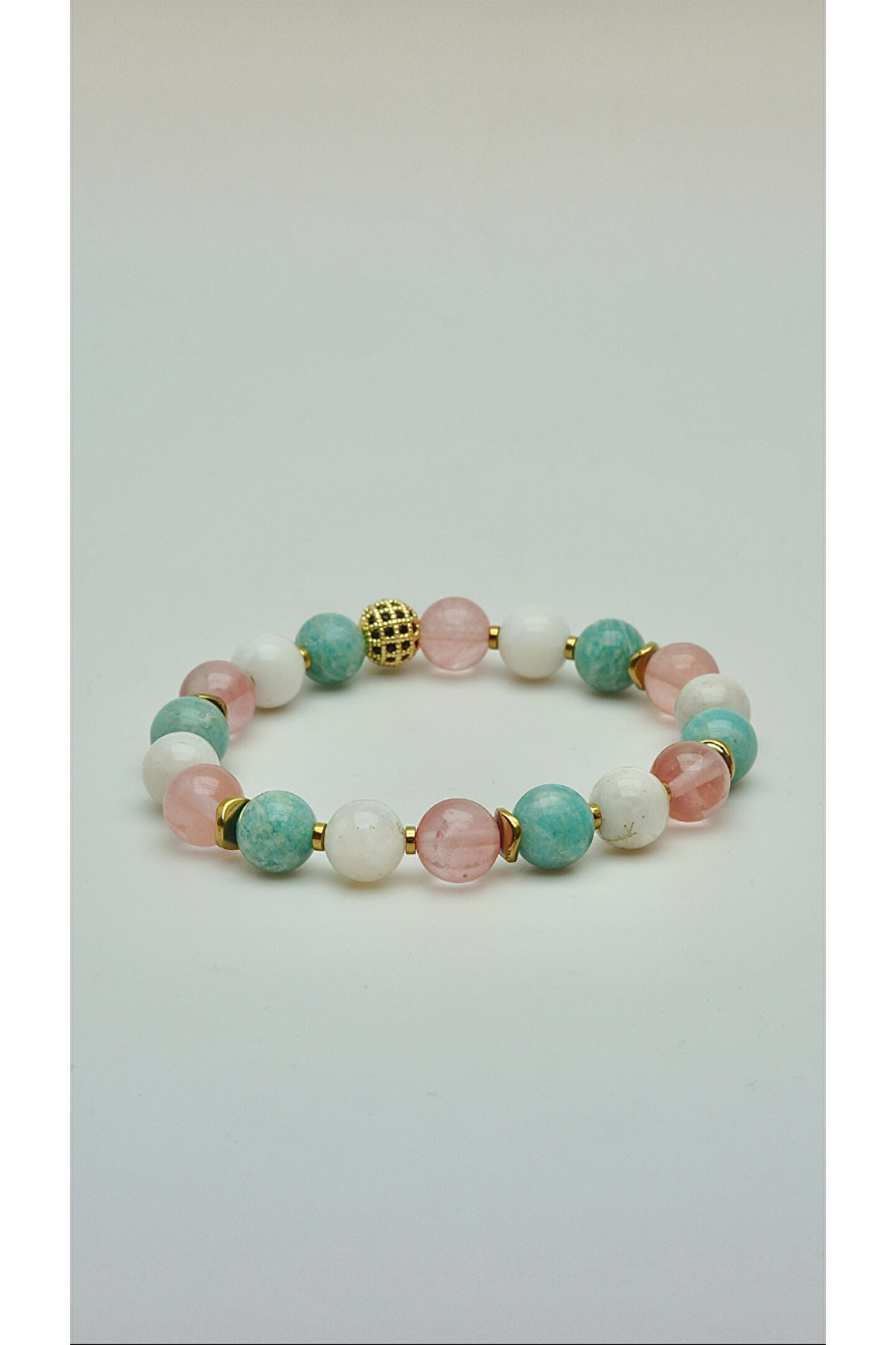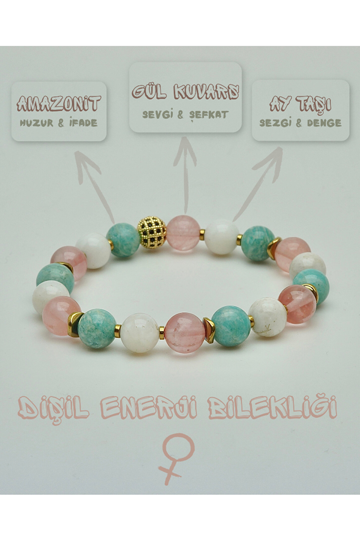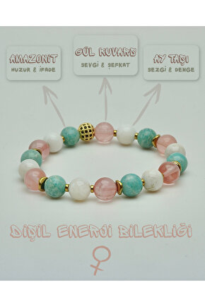 Amazonit, Ay taşı ve Gül kuvarsın birleşimiyle tasarlanan bu bileklik, dişil enerjinin yumuşak ama güçlü akışını destekler.; Ay taşı sezgiyi uyandırırken, Gül kuvars kalbi sevgiyle doldurur; Amazonit ise huzurlu bir ifade ve içsel denge kazandırır.; Bu özel üçlü, kadının kalbini, ruhunu ve sezgilerini uyumlu bir şekilde bir araya getirir.; • Amazonit → Huzur & İfade • Ay taşı → Sezgi & Denge • Gül kuvars → Sevgi & Şefkat Doğal taşlar, yüzyıllardır farklı kültürlerde enerjileri ve faydalı etkileriyle tanınmış ve kullanılmıştır.; Ancak bu etkiler kişisel inanç, deneyim ve algıya bağlı olarak değişiklik gösterebilir.; Bu taşların doğal güzellikleri ve eşsiz enerjileri, günlük yaşamınıza estetik ve anlam katabilir.; Bilek çevrenizi ölçmek için bir mezureyi bileğinizin en geniş yerine, çok sıkmadan ancak tam oturacak şekilde dolayın.; Mezurenin başlangıç noktası ile birleştiği yeri okuyarak ölçünüzü belirleyin.; Eğer mezureniz yoksa, bir ip veya şerit kullanarak bileğinizi ölçüp, ardından bir cetvelle uzunluğunu belirleyebilirsiniz.