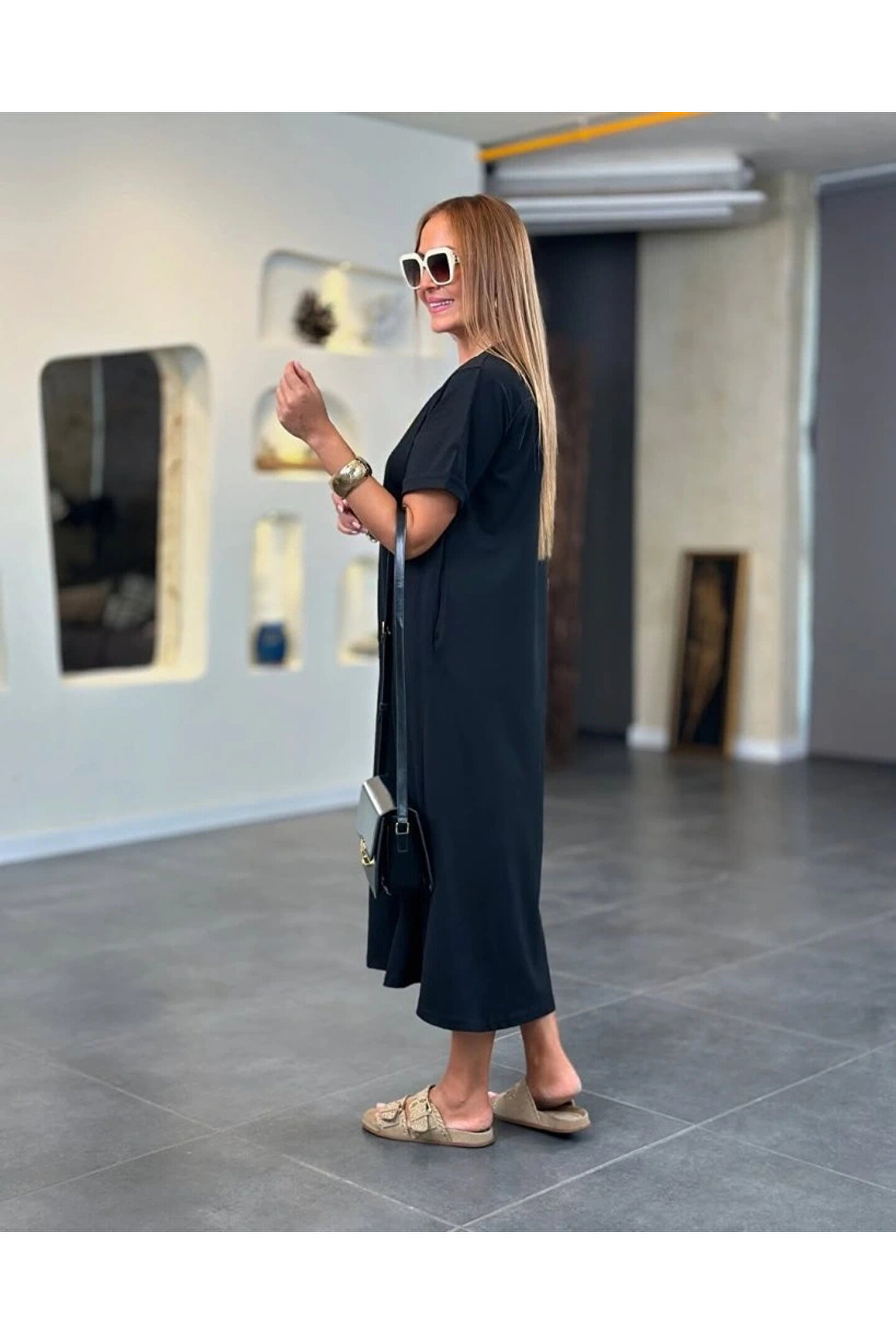 Kadın Kısa Kollu V Yakalı Cep Detaylı Uzun Viskon Iki Iplik Elbise