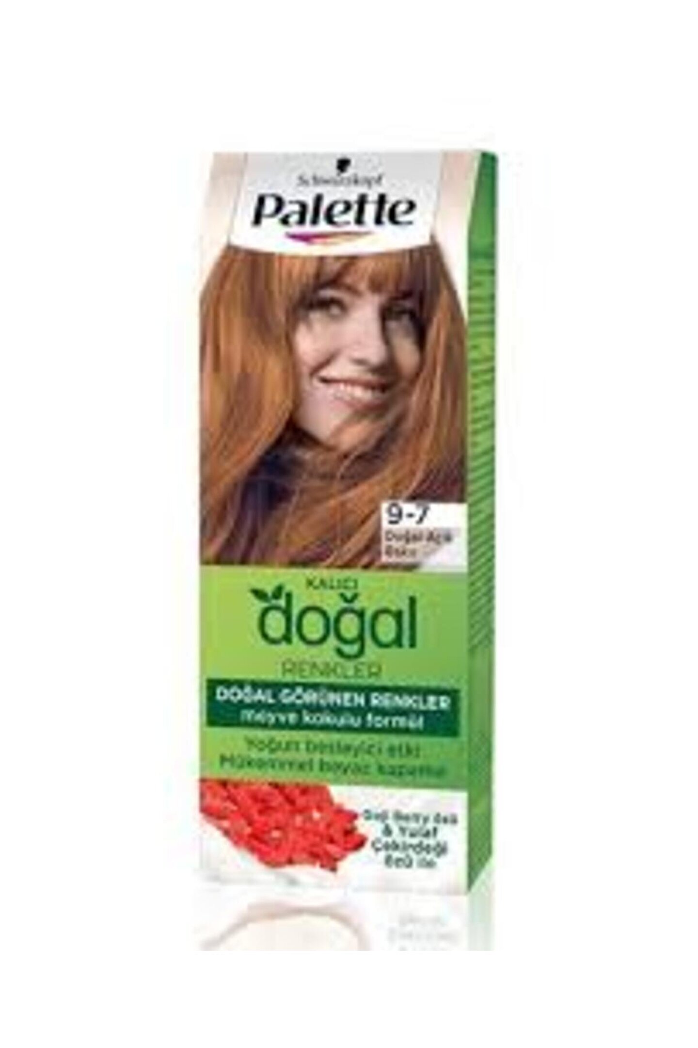 Palette Kalıcı Doğal Renkler 9-7 Doğal Açık Bakır Saç Boyası ;Goji berry ve yulaf çekirdeği özü ile yoğun besleyici etki ;Çok tonlu renk pigmentleri ile doğal ve parlak görünen renkler ;Meyve kokulu vegan formül ;Mükemmel beyaz kapama;saç boyası, saç bakımı, kalıcı renk sonucu, parlaklık, meyve kokusu, Goji Berry Özü