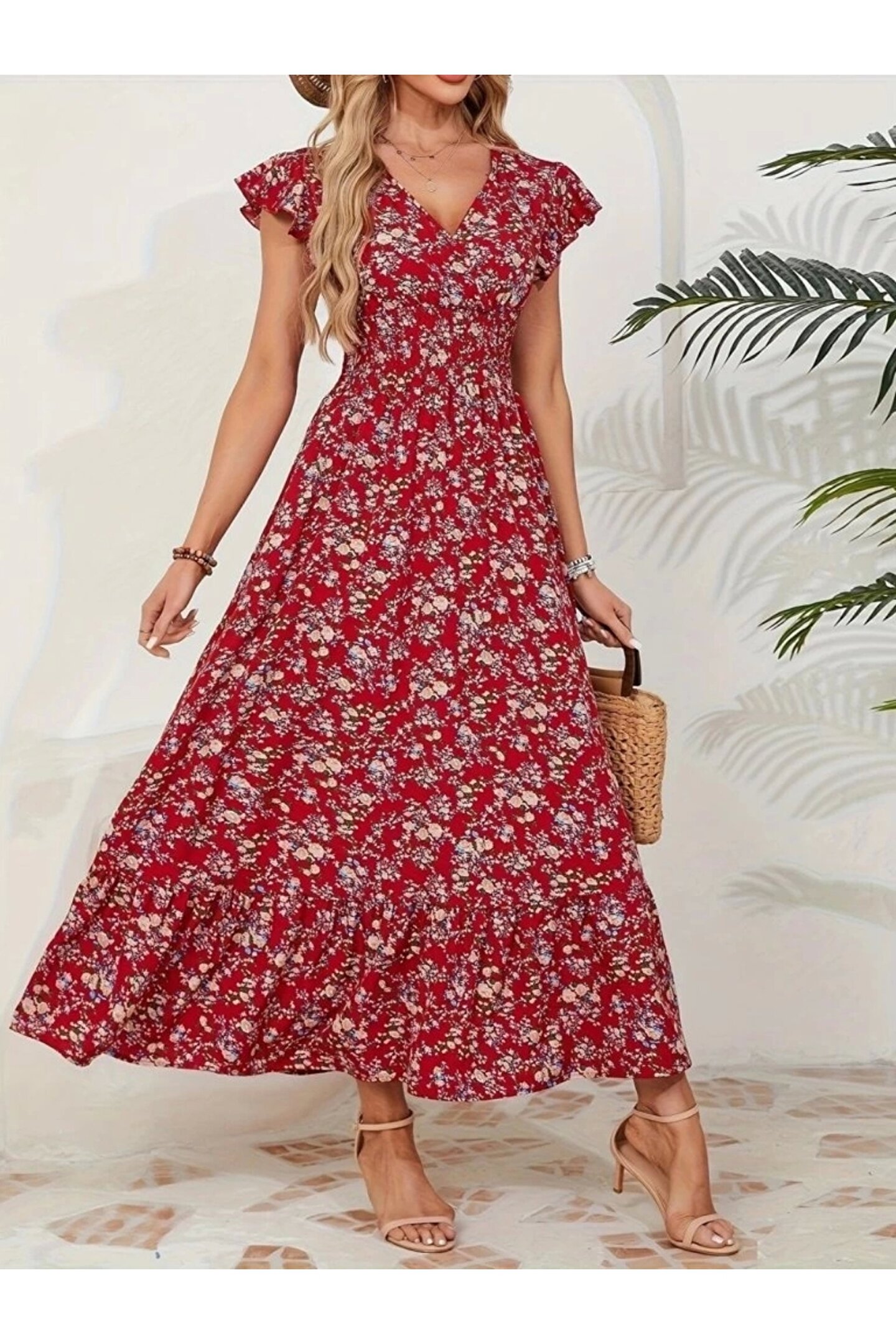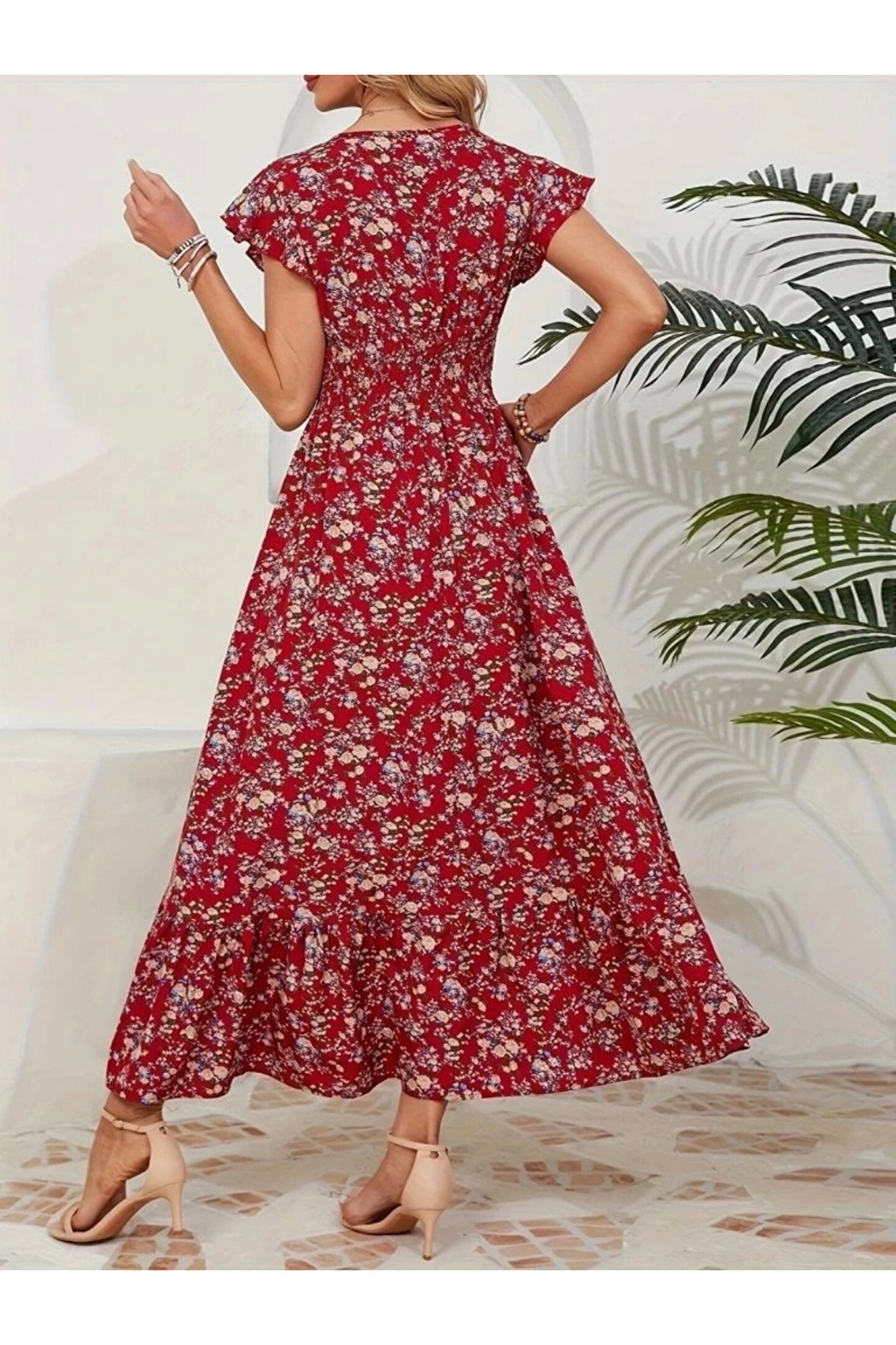 Kadın Kısa Kollu Kruvaze Yaka Beli Lastikli çiçek Desenli Elbise