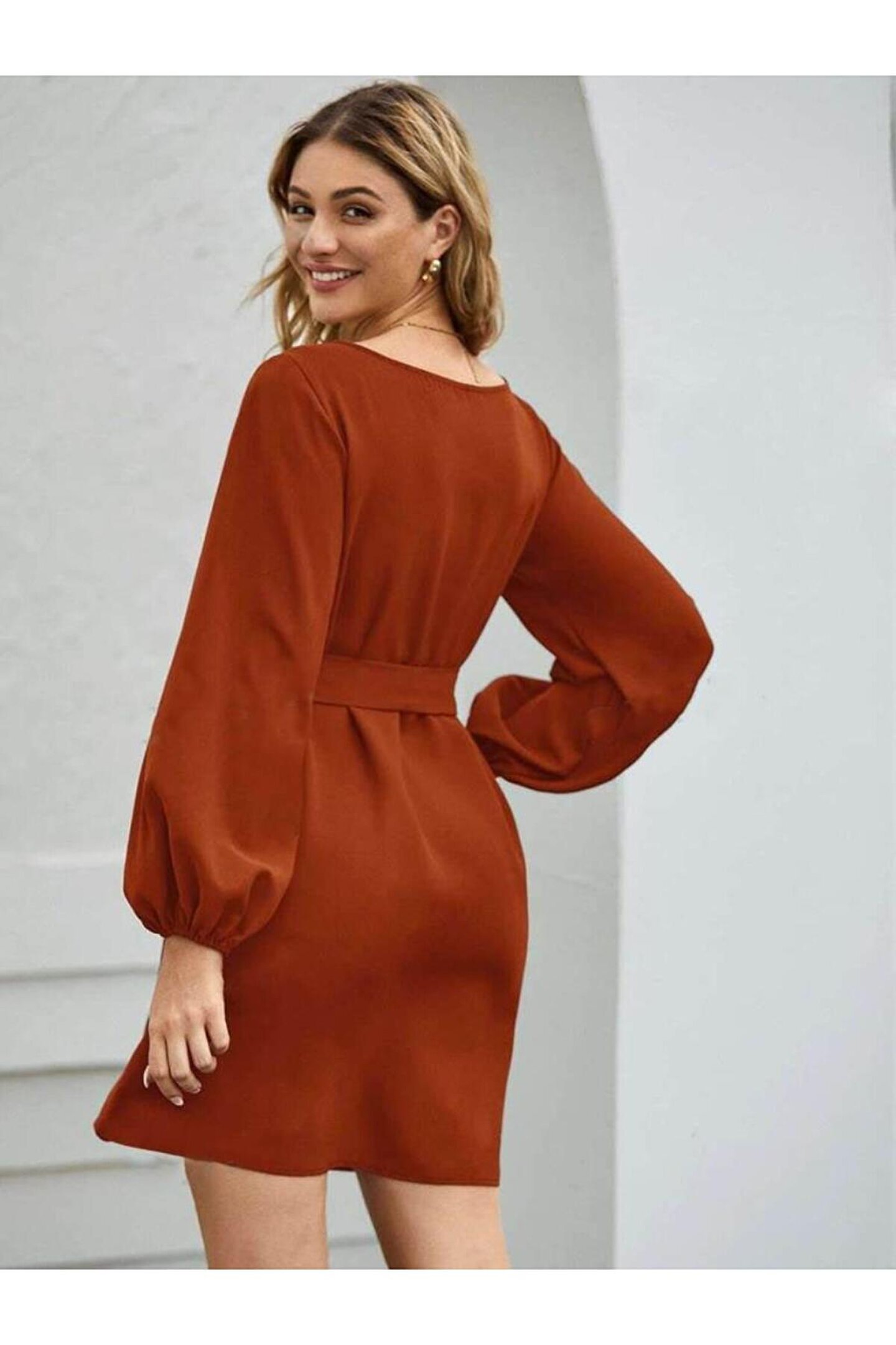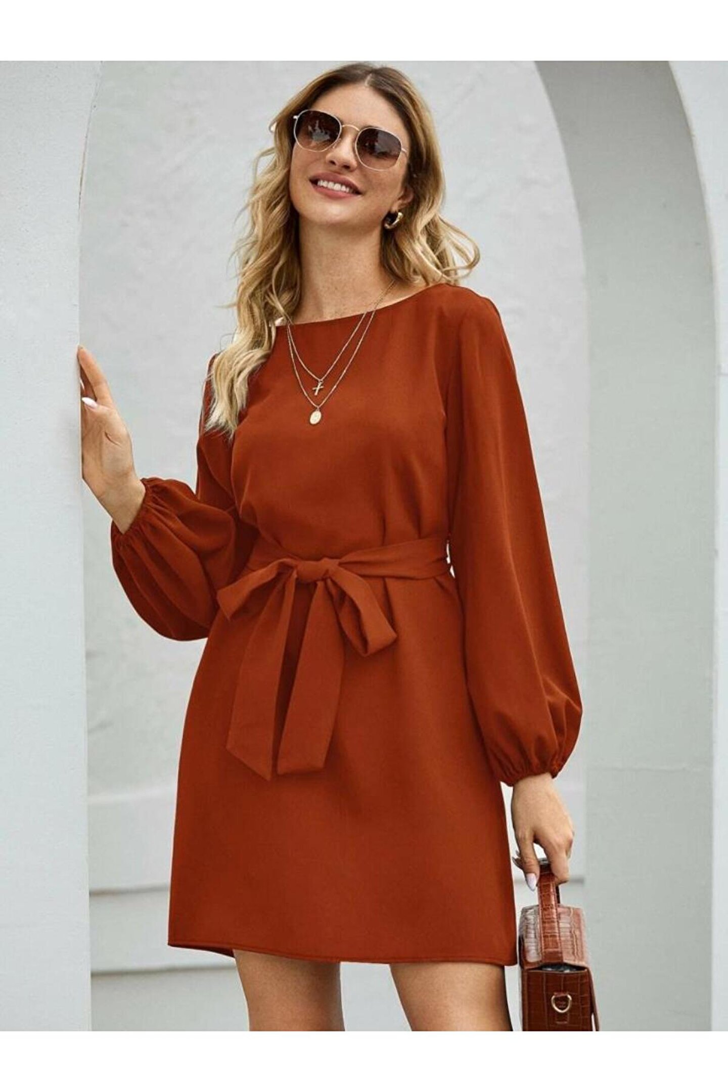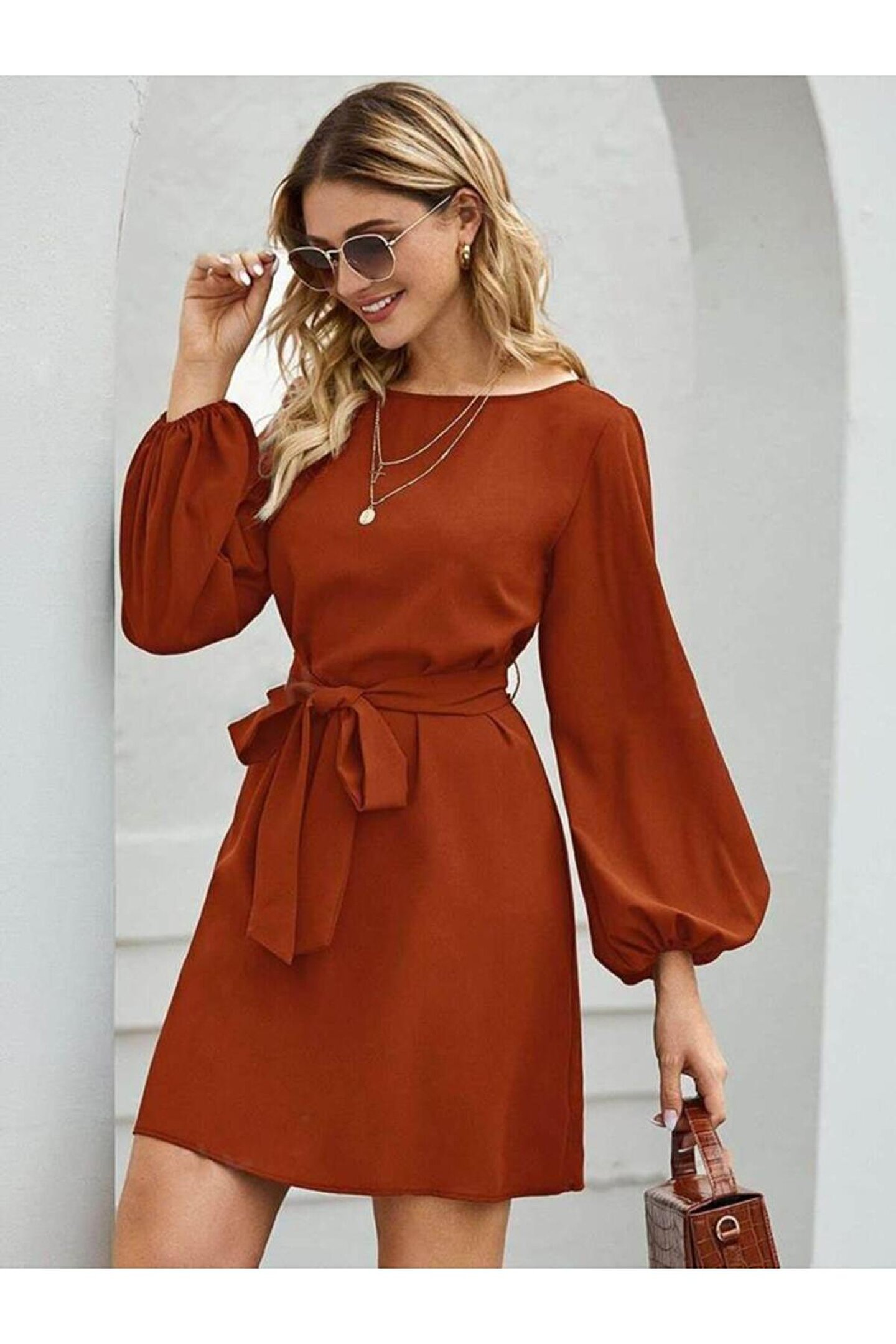 Kadın Uzun Kollu Kayık Yaka Belden Kuşaklı Kısa Ithal Krep Elbise