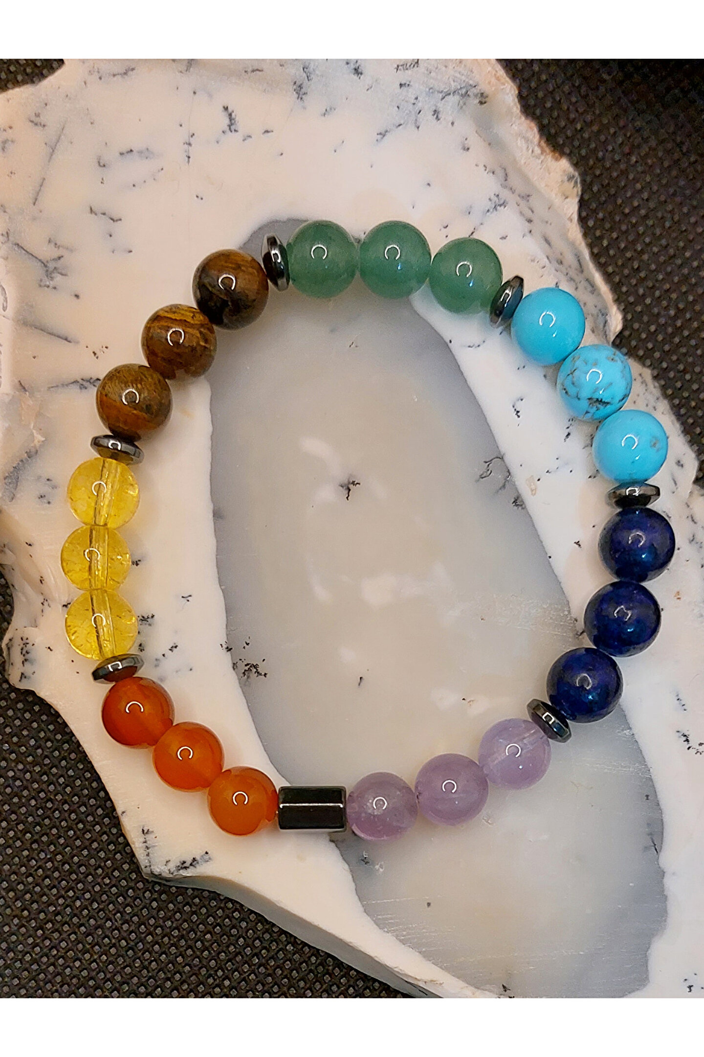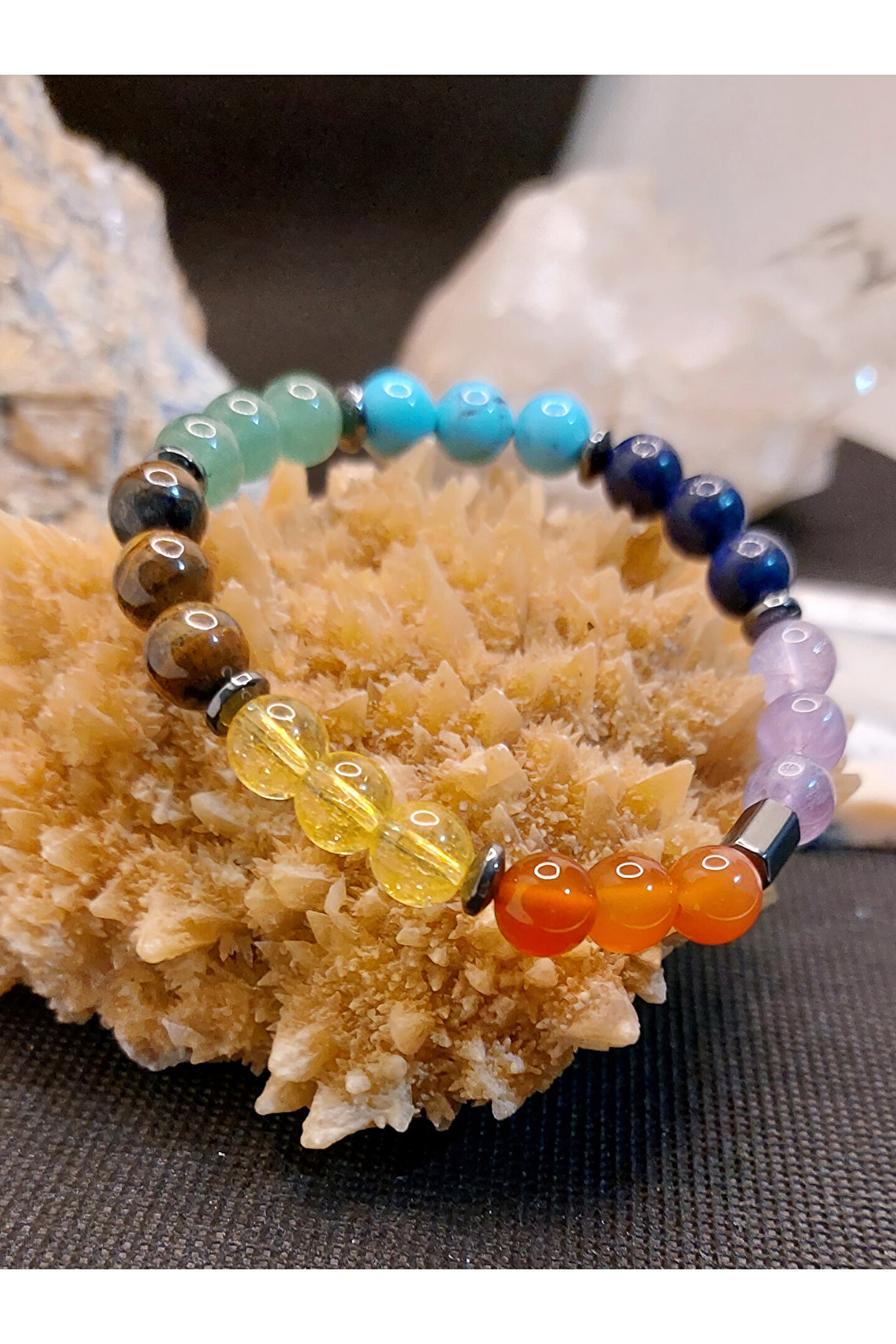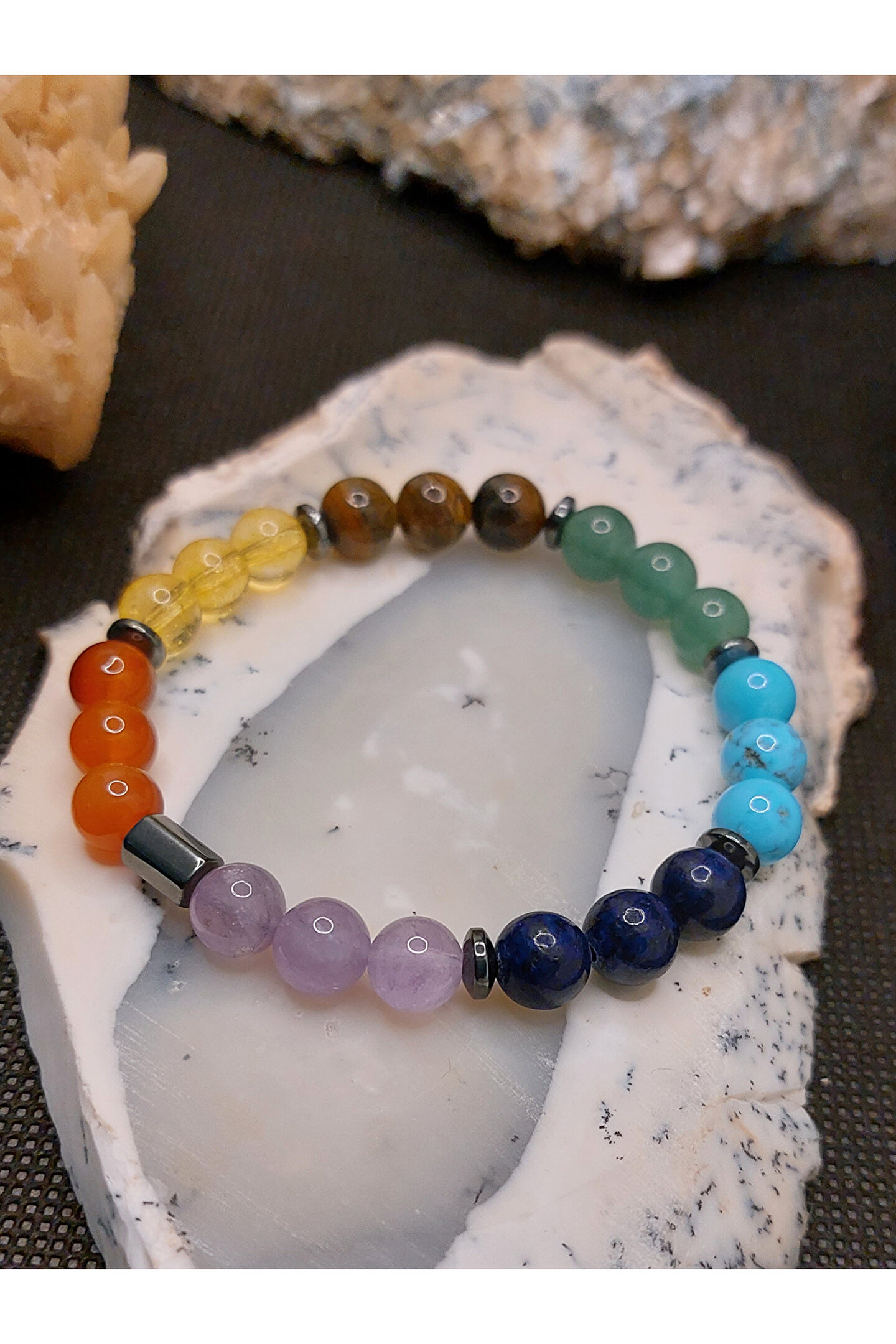 Çakra taşları ya da şifa kristalleri, bu enerji tekerlekleriyle en çok etkileşime girebilen taşlardır. ; Bu taşların yaydığı titreşimler çakraların hizalanmasına yardımcı olur. ; Çakra taşları, çakranın doğal iyileşme sürecini destekleyen, çeşitli renklerde farklı taş türleridir. ; Size sunmuş olduğumuz ÇAKRA BİLEKLİK, 7 farklı renge sahip gerçek değerli doğal taşların birleştirilmesi sonucu hazırlanmış eşsiz bir üründür. ; Siz değerli takipçilerimize, isteğiniz doğrultusunda göndereceğimiz ÇAKRA bilekliğinde mevcut olan değerli doğal taşların özellikleri aşağıda sıralanmıştır. ; Ametist: Ametist, birkristal taşıdır ve genellikle mor renkte bulunur. ; Ametist, kristal yapısınedeniyle özellikle enerji düzenleme, meditasyon ve kişisel gelişim içinkullanılır. ; Aynı zamanda, ametist taşı , stresi azaltmaya, dikkat vekonsantrasyonu arttırmaya ve duygusal dengeyi sağlamaya yardımcı olur. ; Lapis Lazuli: Lapislazuli, doğru iletişimi ve anlayışı geliştirmeye yardımcı olur. ; Bukristalle çalışmak kişinin sezgilerini güçlendirirken, içsel düşünce veduygularınızla bağlantı kurmayı sağlar. ; Antik Mısır ve Roma'da güçlü bir tılsımolduğu, ruhu kötülüklerden arındırdığına inanılırdı. ; Turkuaz: Kişiye şansve uğur getirdiği bilinmektedir. ; Kaygı duygusuna karşı etkilidir. ; Başarıgetirir. ; Nazara karşı koruyucu etkisi vardır. ; Tansiyonu dengeler. ; Kalphastalıklarına karşı koruyucu etkisi vardır. ; Takı olarak kullanıldığı takdirdeetkisi daha da artmaktadır. ; Aventurin: Aventurintaşı, kuvars ailesinden bir taş olup, birçok faydası vardır. ; Taşın en önemlifaydaları arasında duygusal dengeleme, zihin açıklığı ve fiziksel sağlık bulunur.Aventurin taşı, stresi azaltmak ve ruh halini dengelemek için kullanılabilir.Ayrıca, zihni sakinleştirmeye ve odaklanmaya yardımcı olur. ; Kaplangözü: Kaplan gözü kişiyeazim, denge, cesaret ve sezgisel yetenekleri arttırmada güç verir. ; Motivasyonsağlar ve hem iç hem de dış huzuru ortaya çıkarmada destek olur. ; Korku,kıskançlık gibi duyguları dengelemeyi sağlar. ; Endişe ve stres gibi faktörlerinüstesinden gelmek için faydalıdır. ; Sitrin: Bolluk vebereketi kendisine çektiğine inanılır. ; Özgüven problemi yaşayanlar içinidealdir. ; Kişiye ilham ve motivasyon verir. ; Güneşle ilişkilendirilmesindendolayı, yaşam enerjisi ve mutluluğun taşıdır. ; Etrafına pozitif enerji yayar. ; Başarınıntaşıdır. ; Zihni arındırarak, hedefe odaklanmayı sağlar. ; Akik: NegatifEnerjilerden Korur. ; Akik taşı, insanları negatif enerjilerden korumak içinkullanılan bir taştır. ; Stresi Azaltır. ; Güçlü Bir Enerji Verir. ; İletişimiArtırır. ; . ; Kendine Güveni Artırır. ; ZihinselNetliği Artırır. ; Şık ve eşsiz Görünüm Sunar. ; Önemli not:Doğal taşlar yapıları gereği farklı renk ve ebatlarda olabilmektedir. ; Ürünlerimiz, gerçek doğal taşlardan özenle hazırlanmaktadır. ; Müşteri memnuniyeti, önceliğimizdir..;