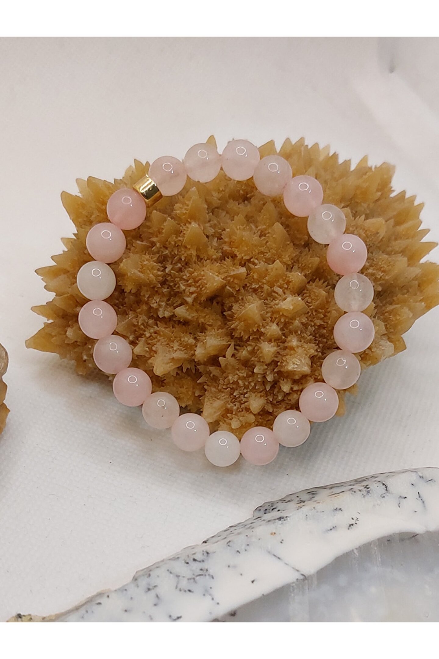 Doğal taş bileklik, şıklığınızı tamamlayacak zarif bir aksesuar seçeneği sunar; Pembe kuvars taşı, bilekliğinize benzersiz bir renk ve enerji katarken, doğal güzelliğiyle dikkat çeker; Taş materyali sayesinde uzun ömürlü kullanım ve dayanıklılık sağlar;