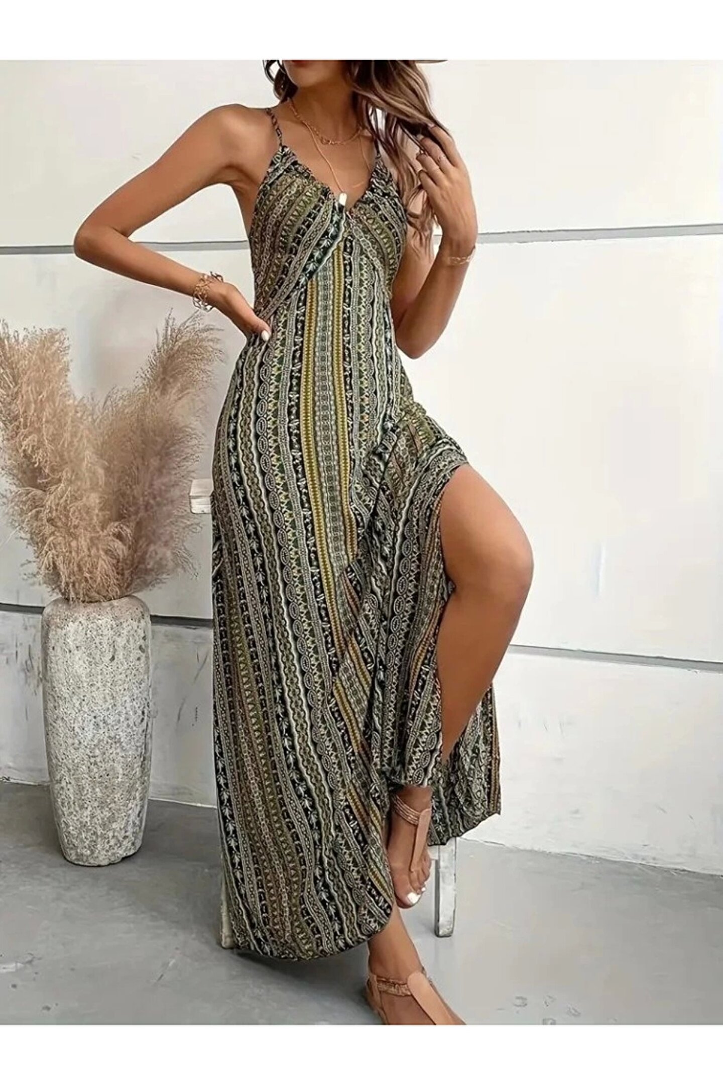 Kadın Ip Askılı Sırttan çapraz Detaylı Yırtmaçlı Desenli Süprem Elbise