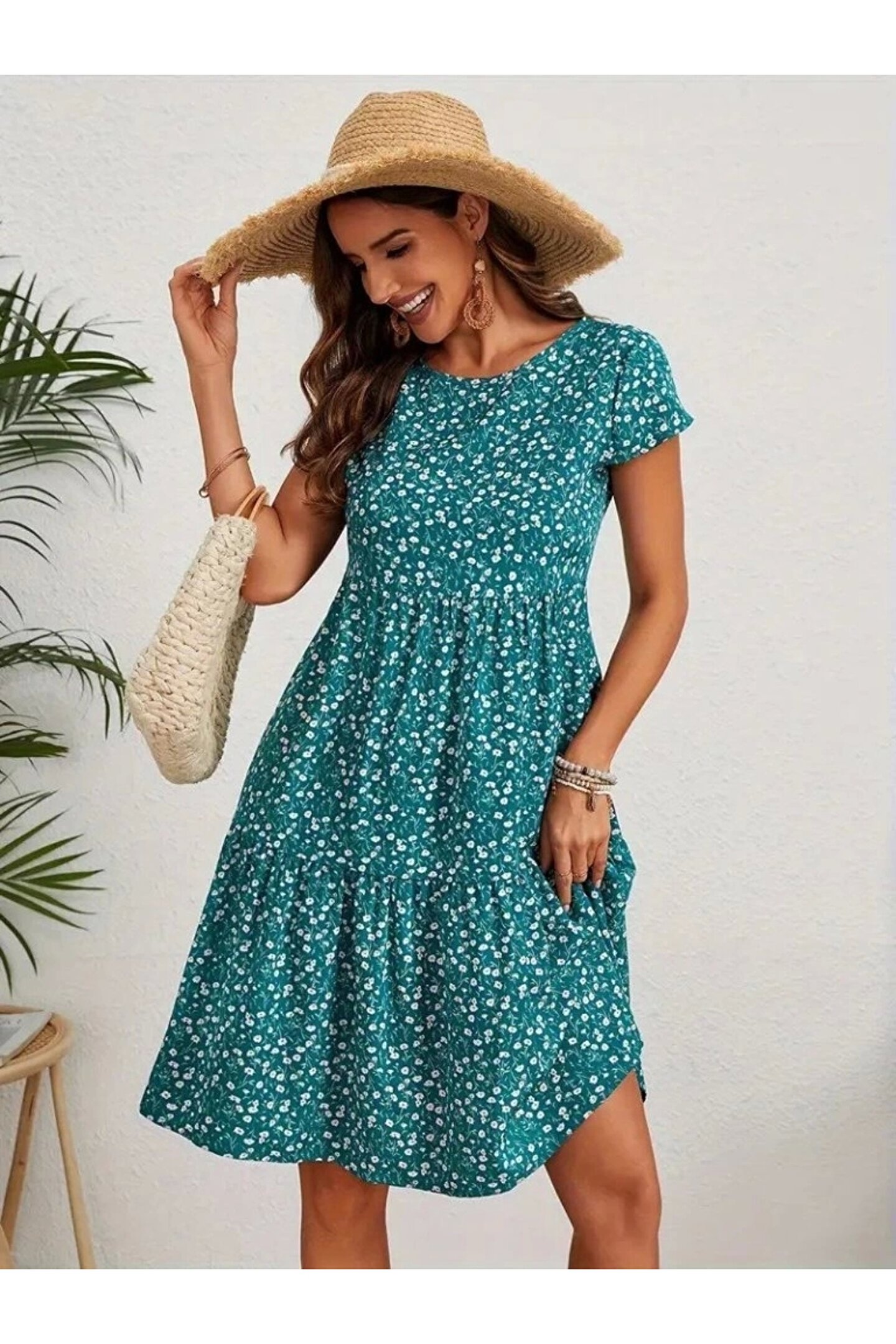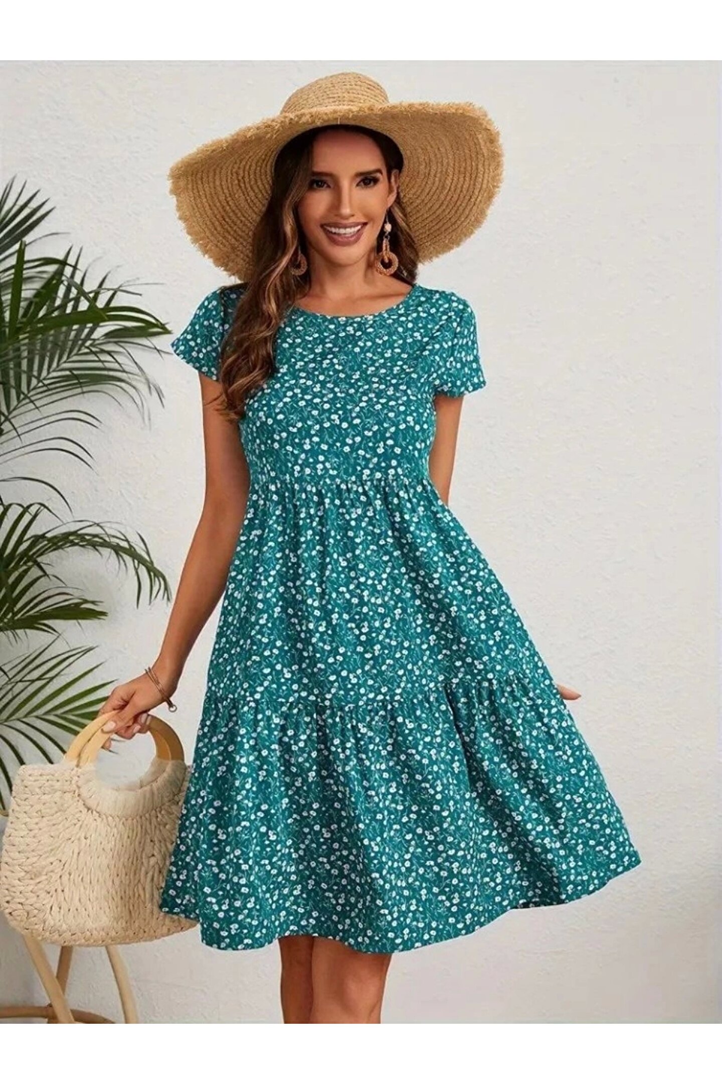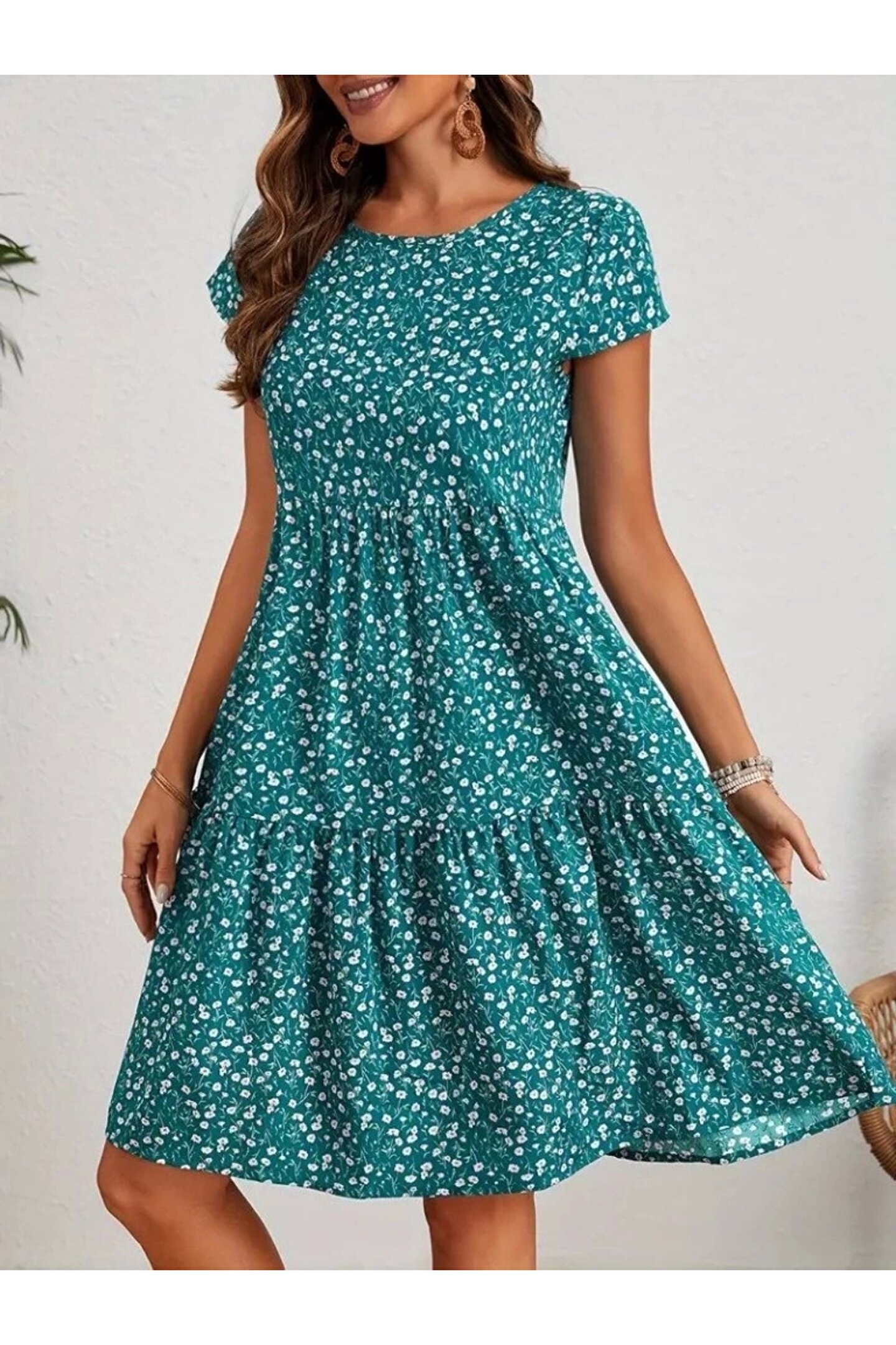 Kadın Kısa Kollu Bisiklet Yaka çiçek Desenli Süprem Elbise