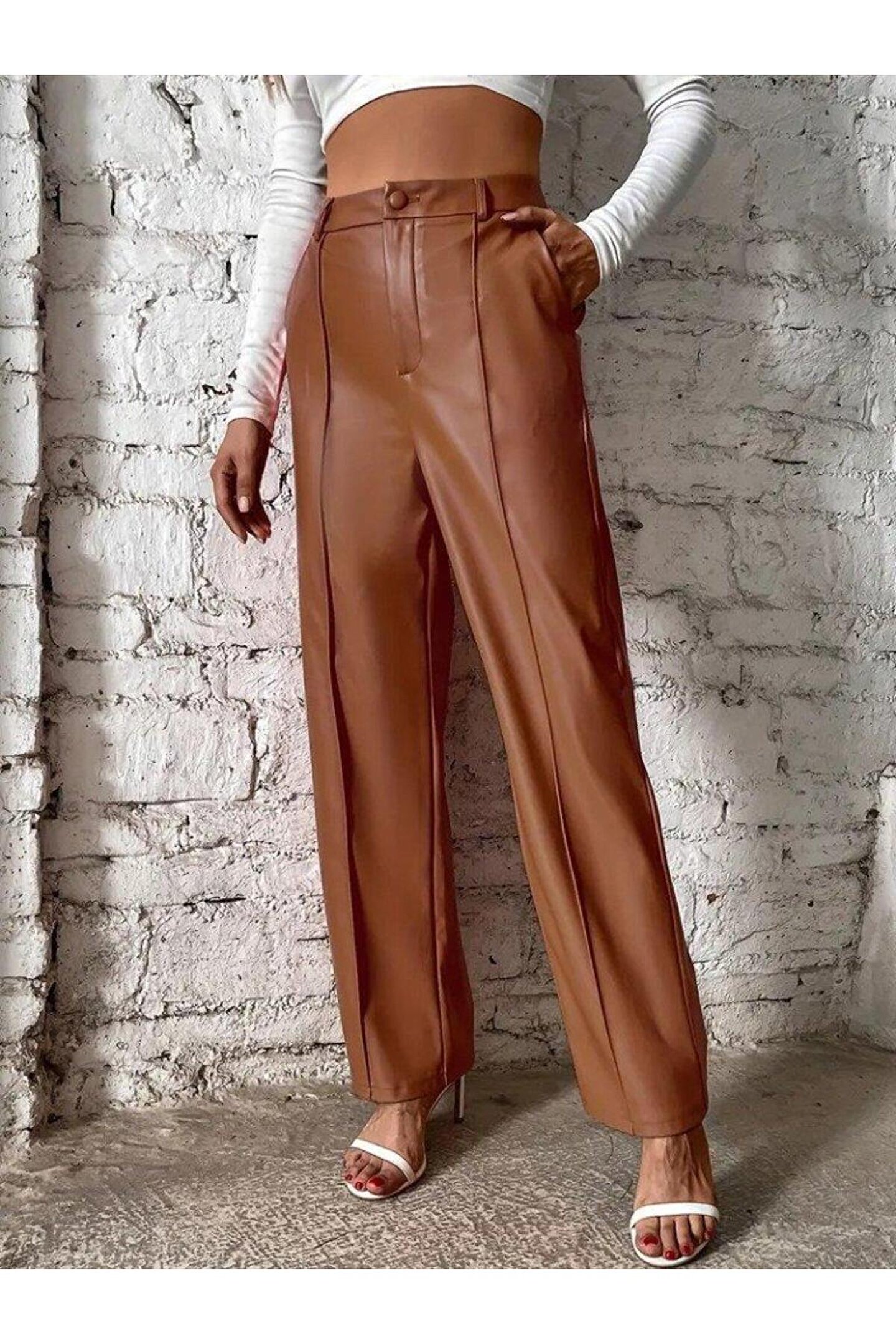 Pazarcan Kadın önden Fermuarlı Cepli Geniş Kesim Lame Deri Pantolon