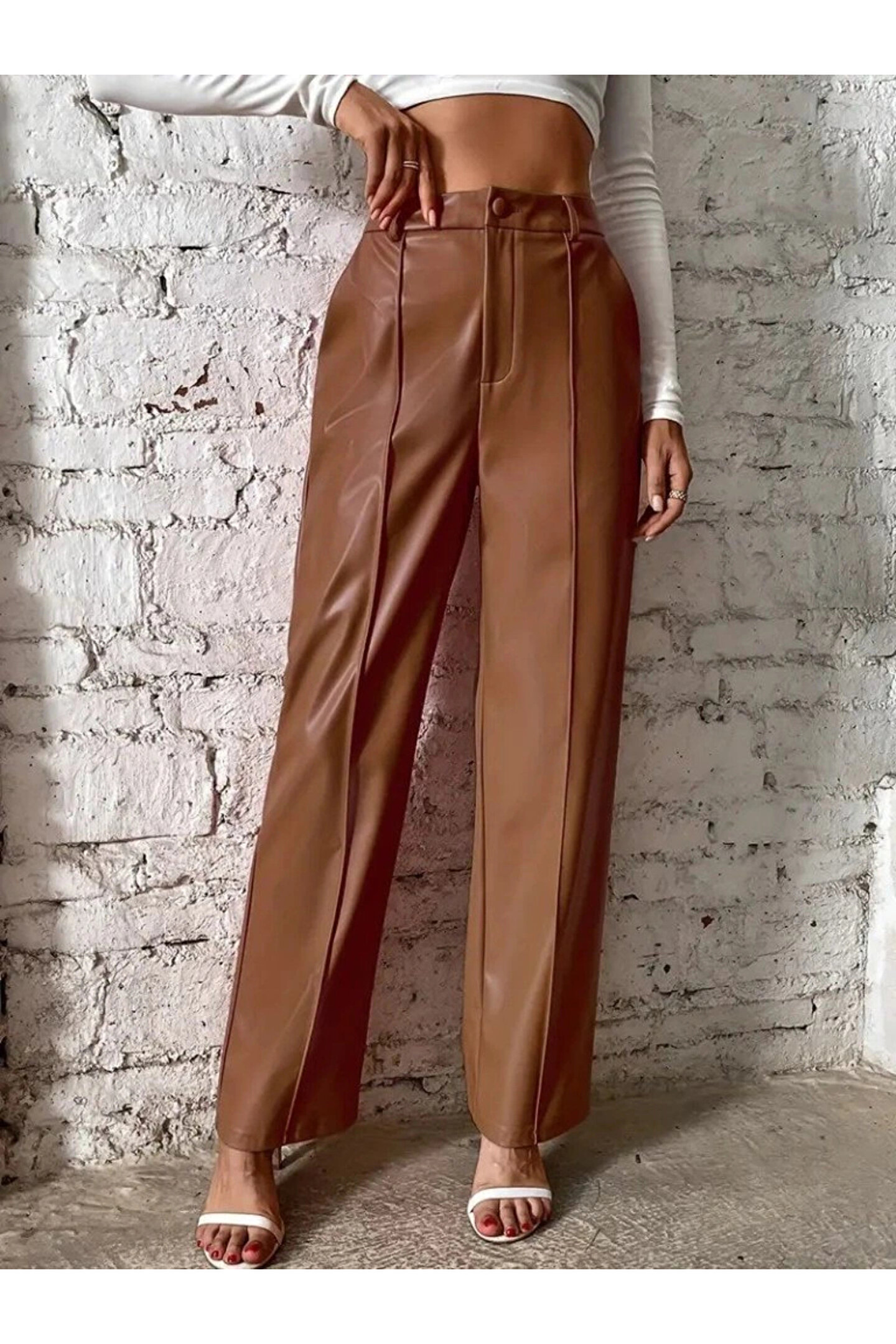 Pazarcan Kadın önden Fermuarlı Cepli Geniş Kesim Lame Deri Pantolon