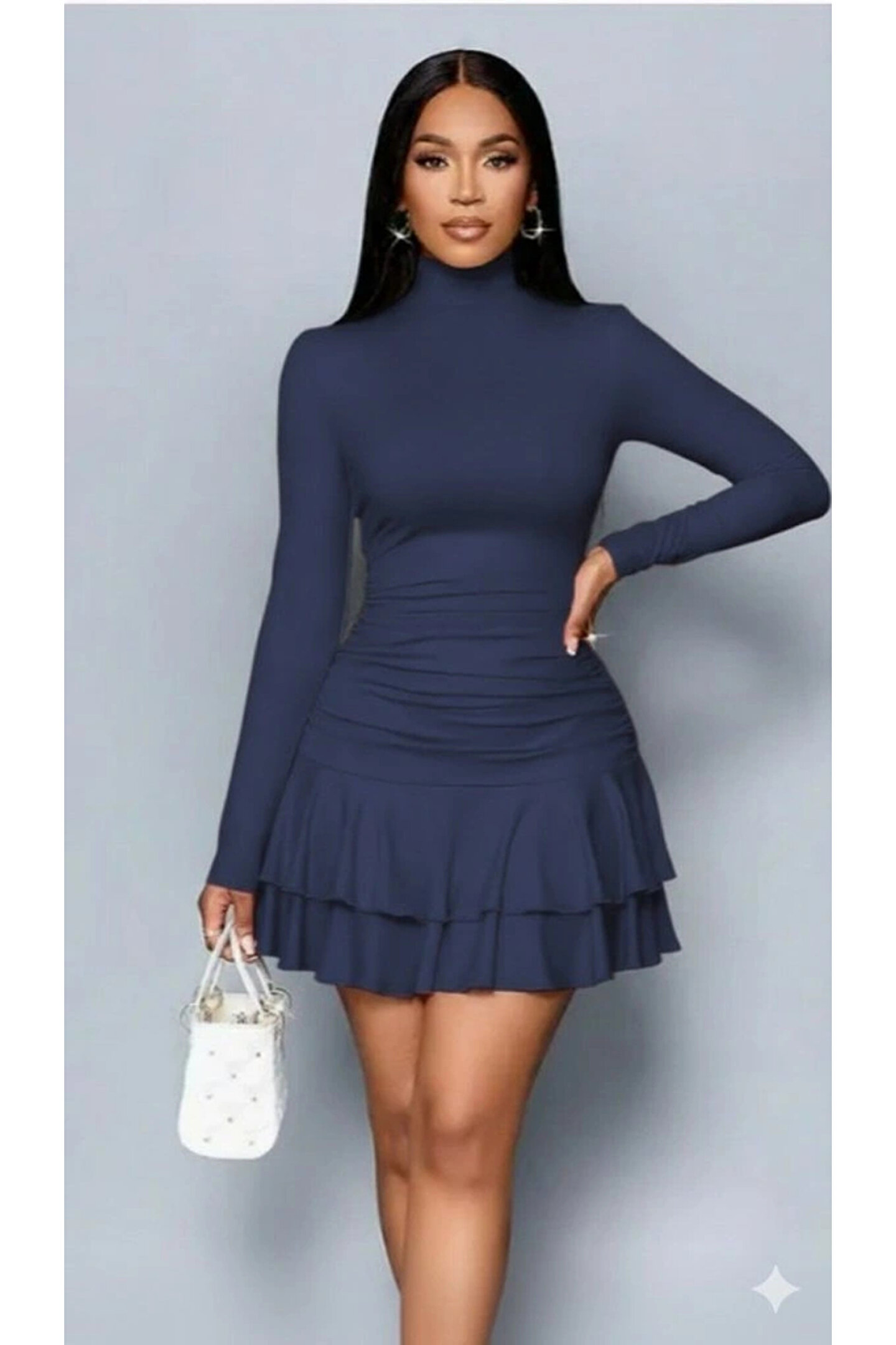 Kadın Uzun Kollu Balıkçı Yaka Mini Fırfırlı Sandy Elbise