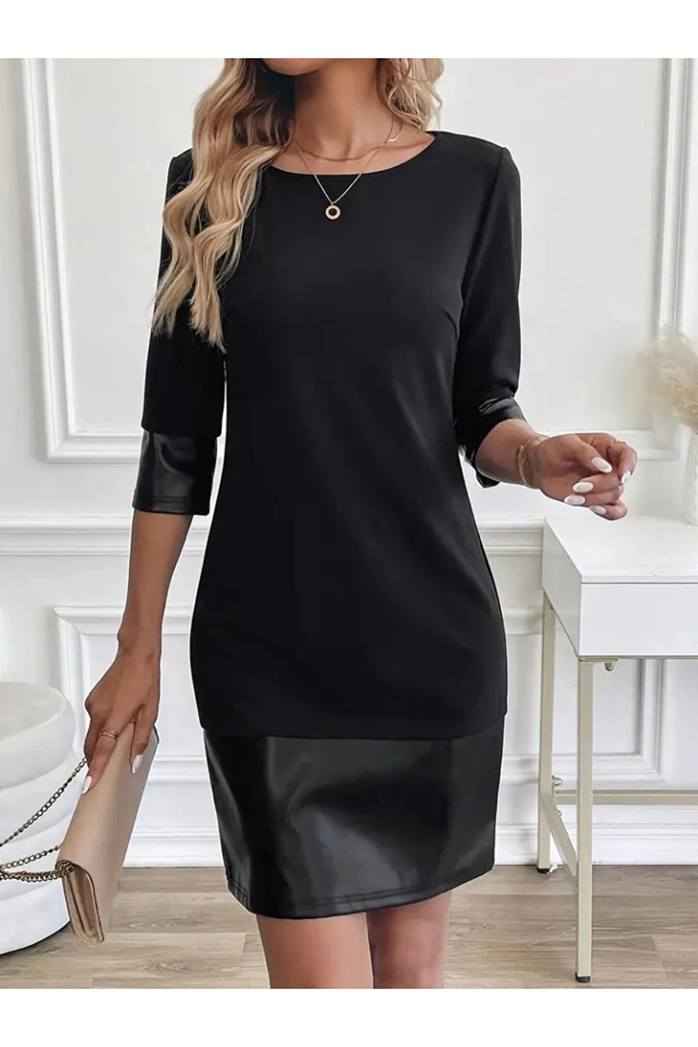 Kadın Uzun Kollu Bisiklet Yaka Deri Detaylı Ithal Krep Elbise Hediye Paketi Yapılabilir.