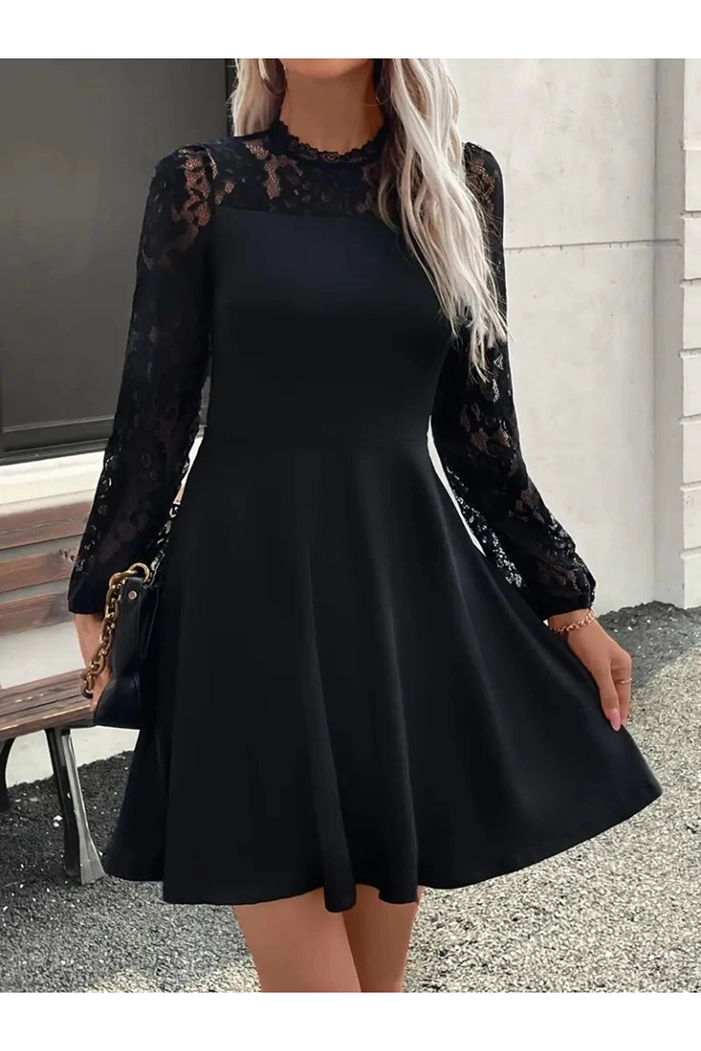 Kadın Uzun Kollu Dantelli Kloş Mini Ithal Krep Elbise