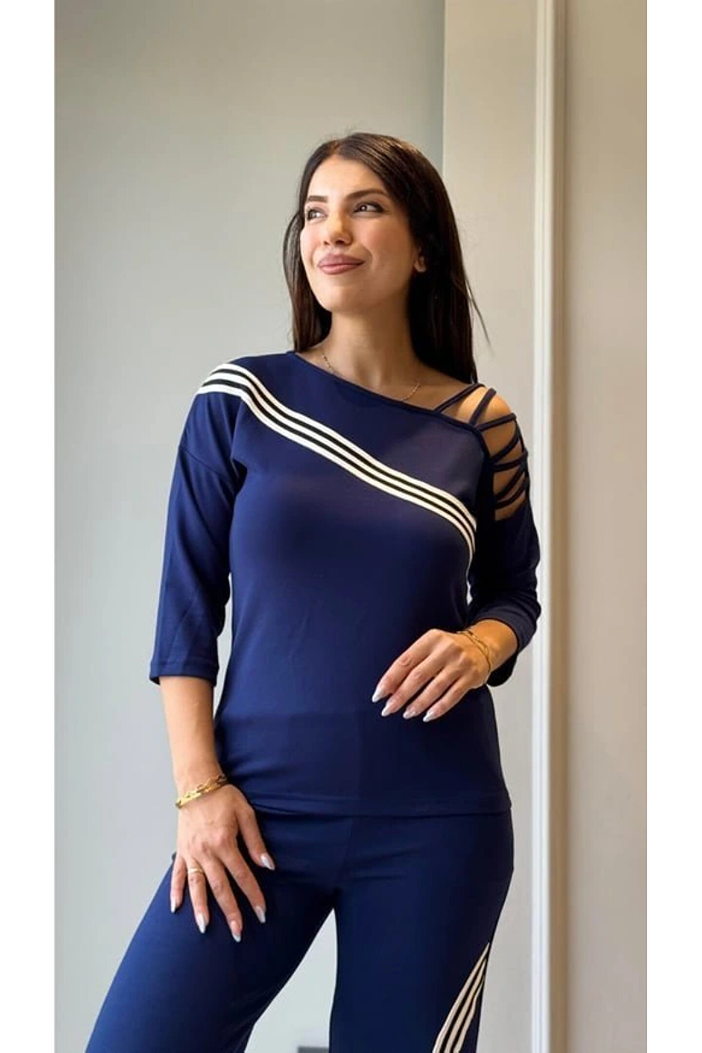 Kadın Uzun Kollu Truvakar Kol Tek Omuz çapraz şerit Detaylı Ribanalı Viskon Iki Iplik Bluz Ve Pantolon Ikili Takım