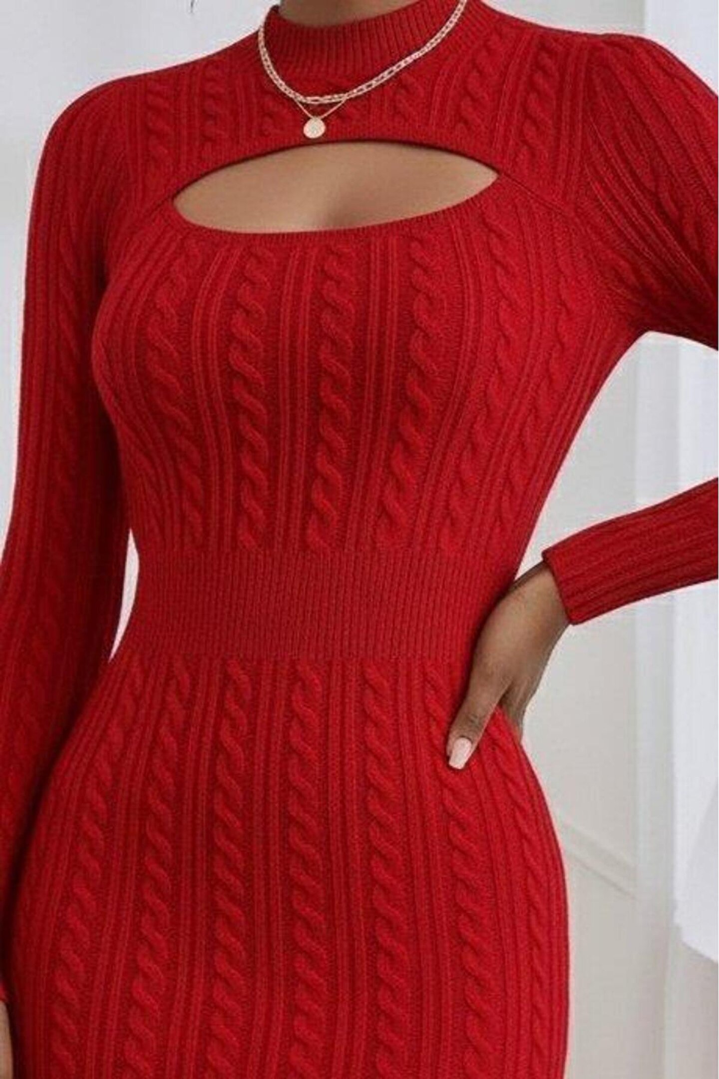 Kadın Uzun Kollu Yarı Balıkçı Yaka Pencere Göğüs Detay Mini Triko Elbise