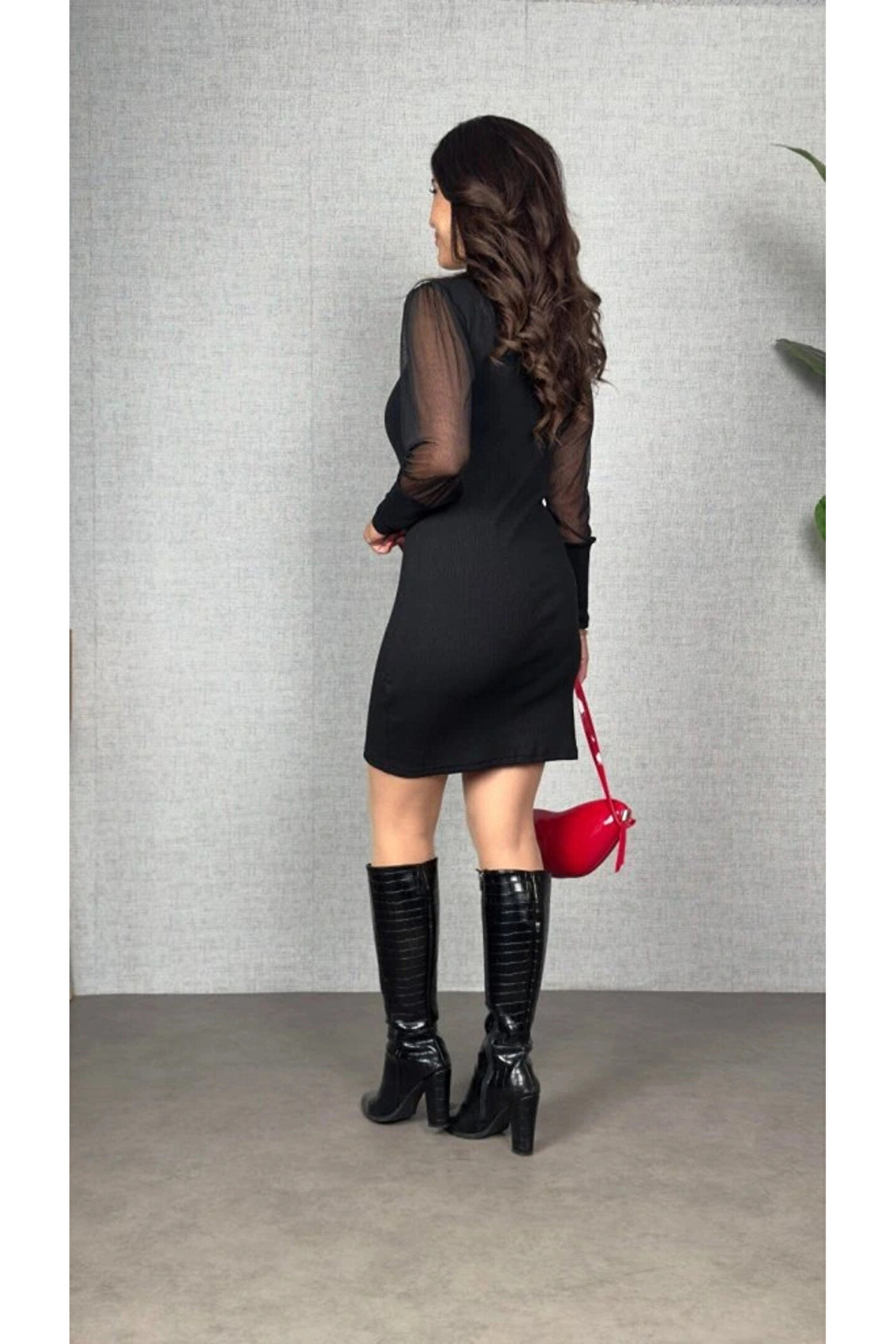 Pazarcan MDB Kadın Uzun Kollu V Yakalı Tül Detaylı Mini Kaşkorse Elbise
