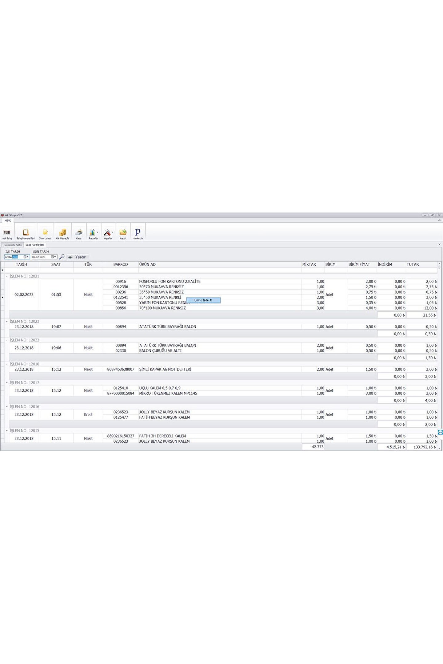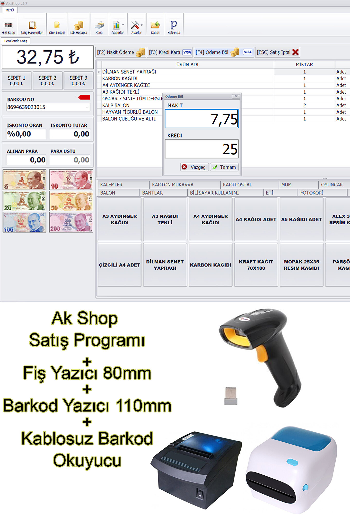 Barkodlu Satış Programı (1 Bilgisayara Özel Süresi Lisans) Ak Shop v3.7 Perakende Satış Programı , Barkodlu hızlı ve seri satış yapmak isteyen işletmeler için geliştirilmiştir.; Kullanışlı arayüzü ile zorluk yaşamadan kullanabileceğiniz, işyerinizi kolayca barkodlu satış uygulamasını geçirmenizde yardımcı olacak bir yazılımdır.; İşyerinizi yakınlarınıza emanet ettiğiniz zamanlarda yaşanabilecek eksik fiyatlardan ürün satışlarının önüne kolayca geçebilirsiniz.; Dokunmatik bilgisayarlar ile kullanılabilir.; Hızlı satış düğmeleri ile barkodsuz ürünleride kolayca bu sistemde kullanabileceksiniz.; Program Temel Özellikleri Barkodu olmayan ürünleri hızlı satış butonları ile kolayca satabilirsiniz.; ; Hızlı Satış butonları için ayrı ayrı grup sekmeleri oluştura bilirsiniz.; ; Hızlı Satış butonlarına ürün resimlerini ekleye bilirsiniz.; ; Müşteriler ödemelerinin bir kısmını Nakit bir kısmınıda Kredi Kartı ile yapabilir.; ; Ürün stok miktarlarını, ürün kartlarından kolayca değiştirebilirsiniz.; ; Ürün maliyeti hesaplatabilirsiniz.; ; Minimum Stok Miktarı uyarısı.; ; En Çok Satılan Ürünler ve En Çok Kâr Edilen Ürünleri grafik ile raporlama.; ; Filtreleme özelliği ile size aradığınız en uygun sonucu en kısa sürede getirecektir.; ; Satış sonunda müşterilerinize bilgi fişi verebilirsiniz.; ; Alınan para ve paraüstü iade özelliği ile eksik ya da fazla para vermenizi önler.; ; Yapılan satışları kasa bölümünden takip edebilirsiniz.; ; Satış miktarları raporu ile istediğiniz tarih aralıklarında hangi ürünlerin fazla sattığını görebilirsiniz.; ; Ciro raporu ile Cironuzu ve kazancınızı görebilirsiniz.; ; Satış işlemi sonrasında satılan ürünler otomatik olarak stokdan düşer.; ; Sepet özelliği ile aynı anda 4 faklı kişiye satış yapabilirsiniz.; ; Barkodlu Terazileri destekler.; ; Ürün satışı haricinde Gelir-Gider ekleyebilirsiniz.; ; Ürünlere 1 Fiyat tanımlayabilirsiniz.; ; Kullanıcı yetkilendirme.; ; -Kablosuz Barkod Okuyucu -Fiş Yazıcı 80mm -Barkod Yazıcı Not: Kurulum Uzaktan bağlantı ile yapılmaktadır.; Sipariş verdikten sonra soru sor kısmından bizimle iletişime geçiniz.